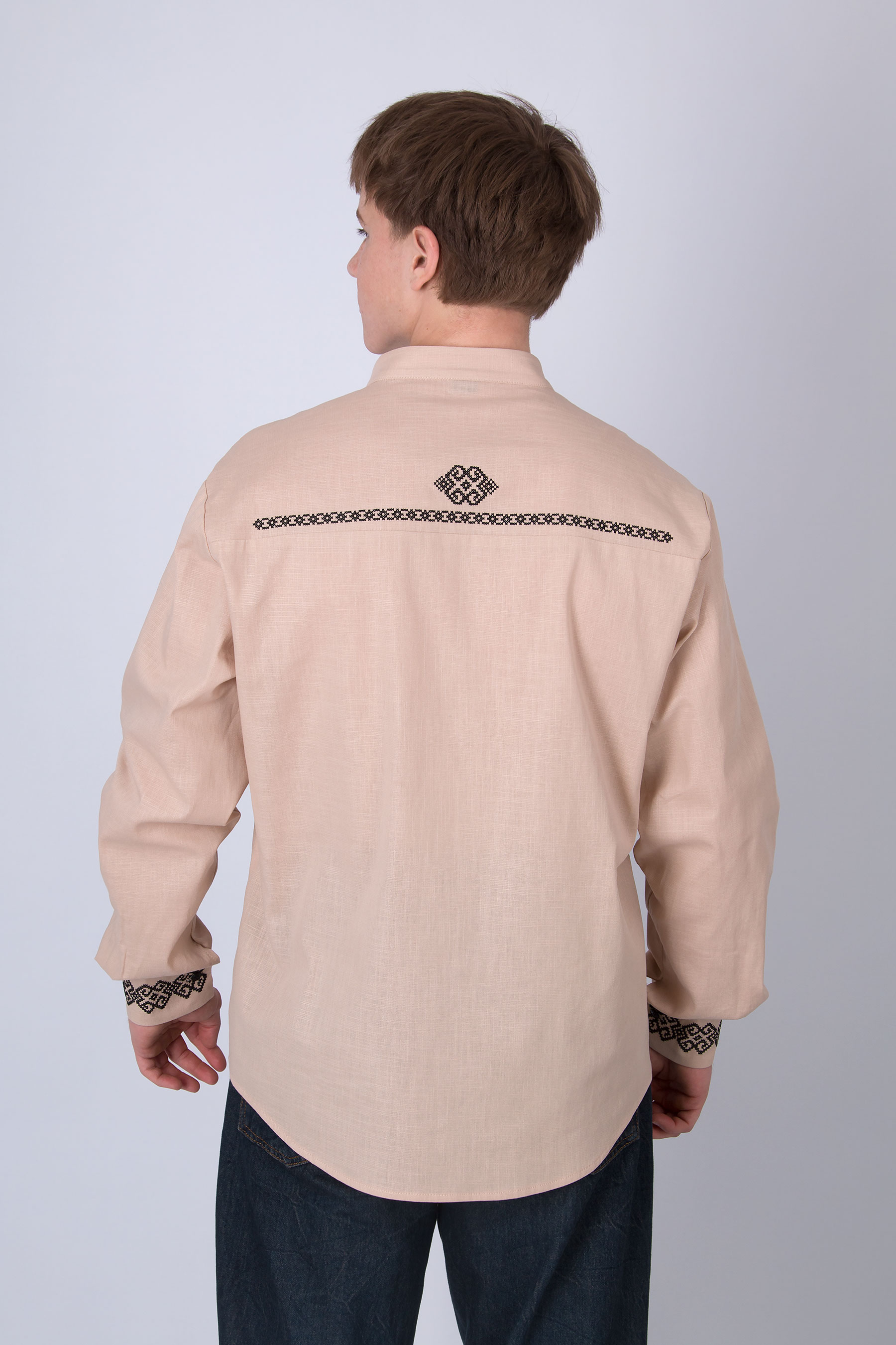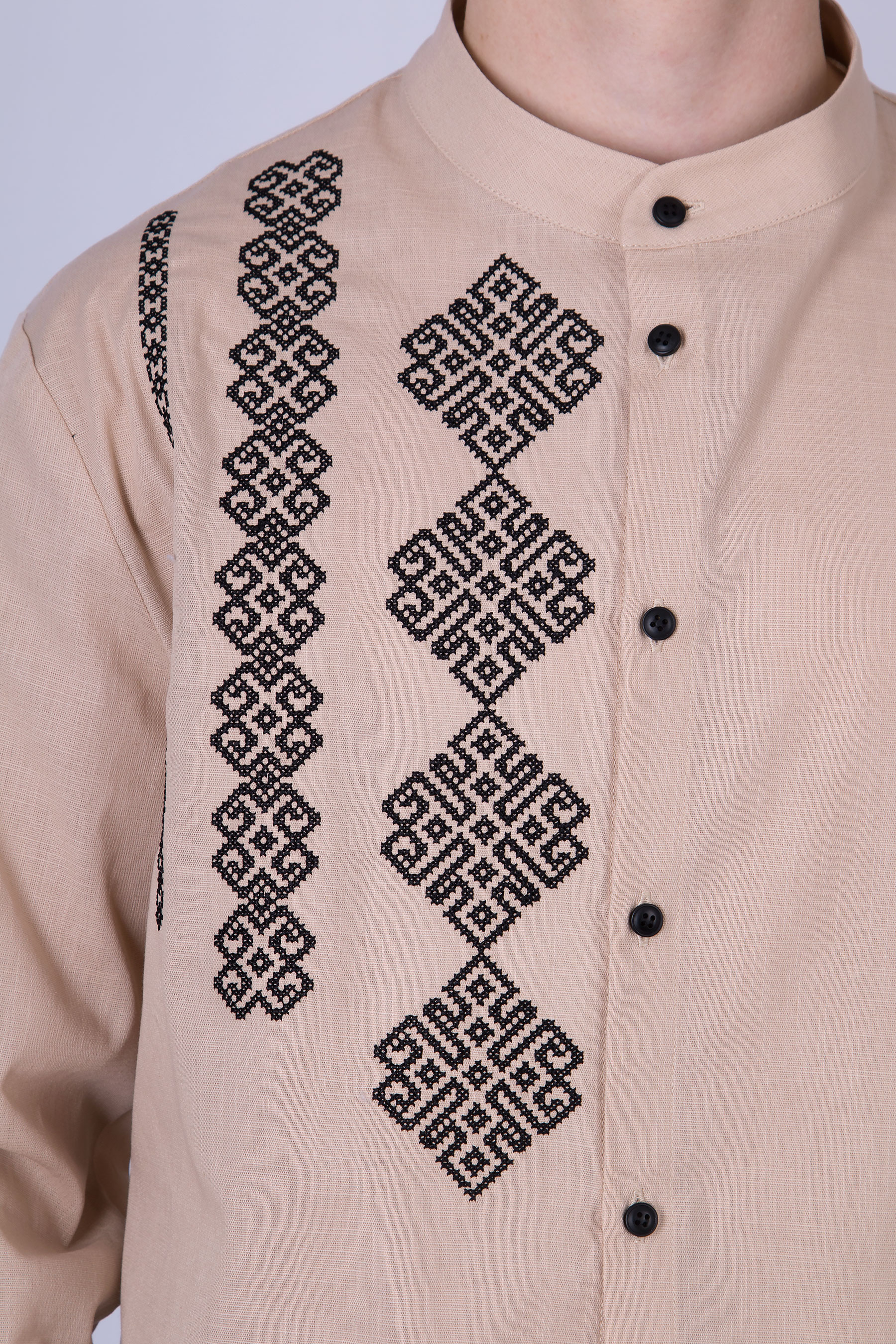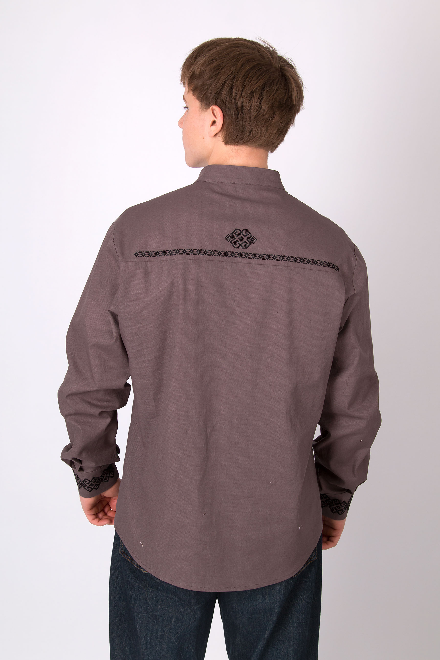 Вишиванка з довгим рукавом. Прямий крій, комір-стійка, застібка на ґудзики. Вишивка розміщена по передній частині виробу та на манжетах, доповнена елементом на спинці.