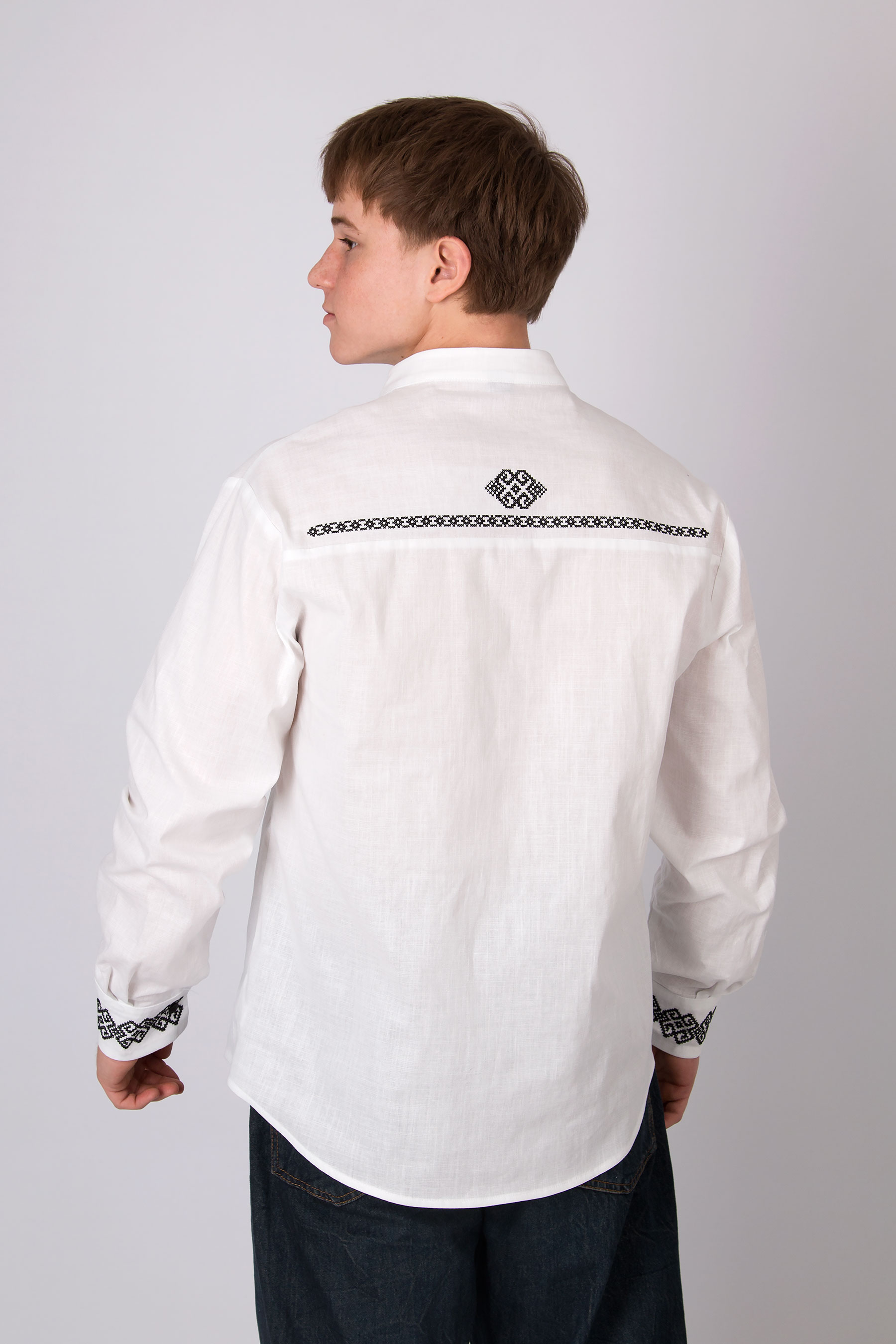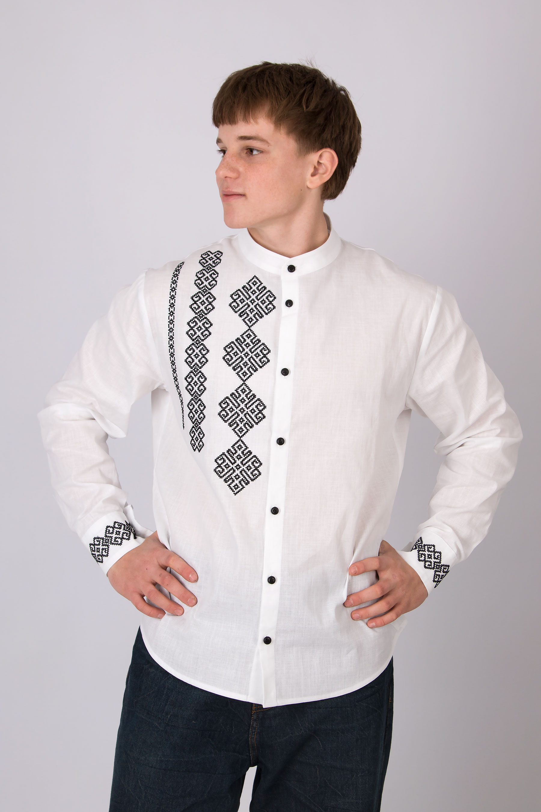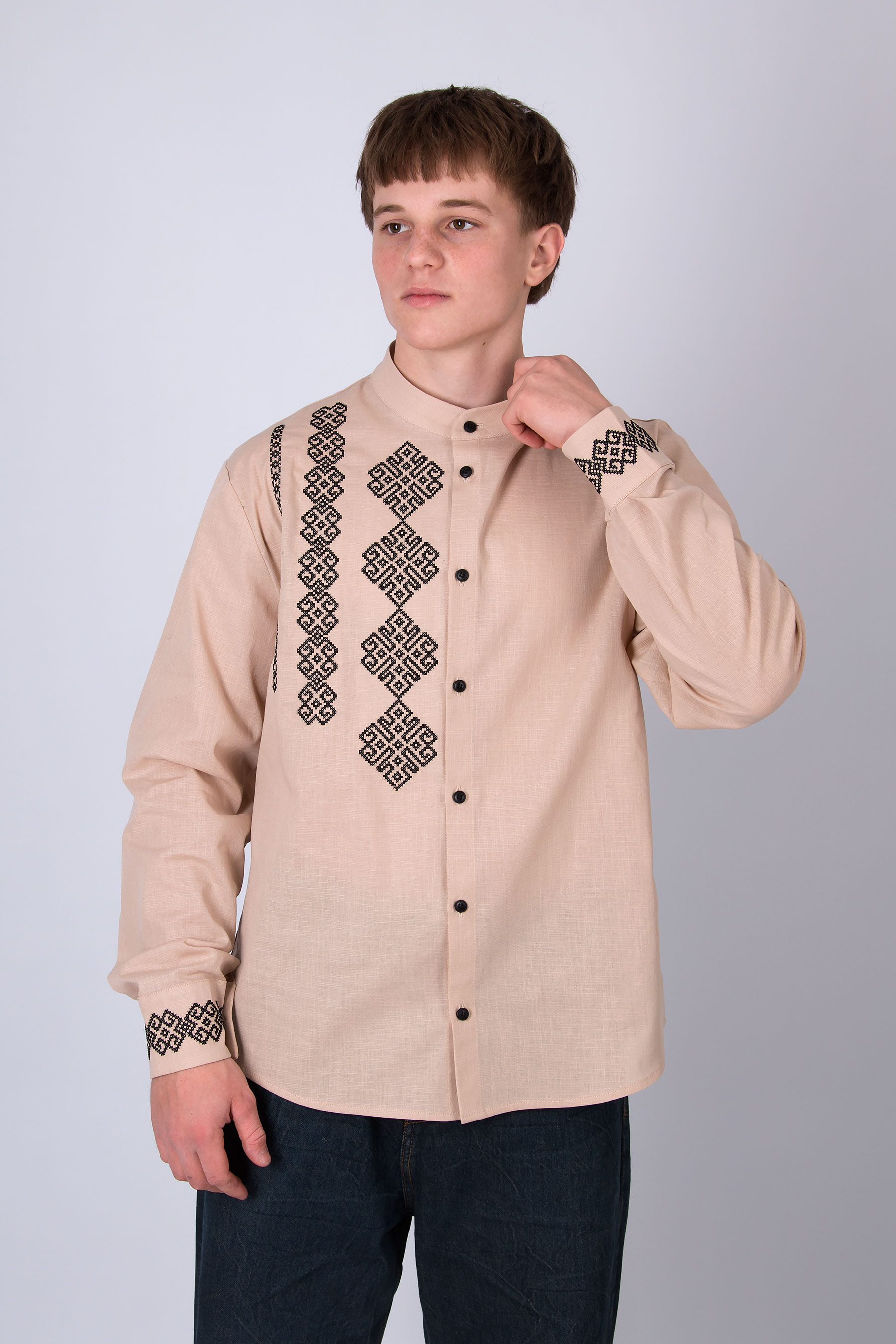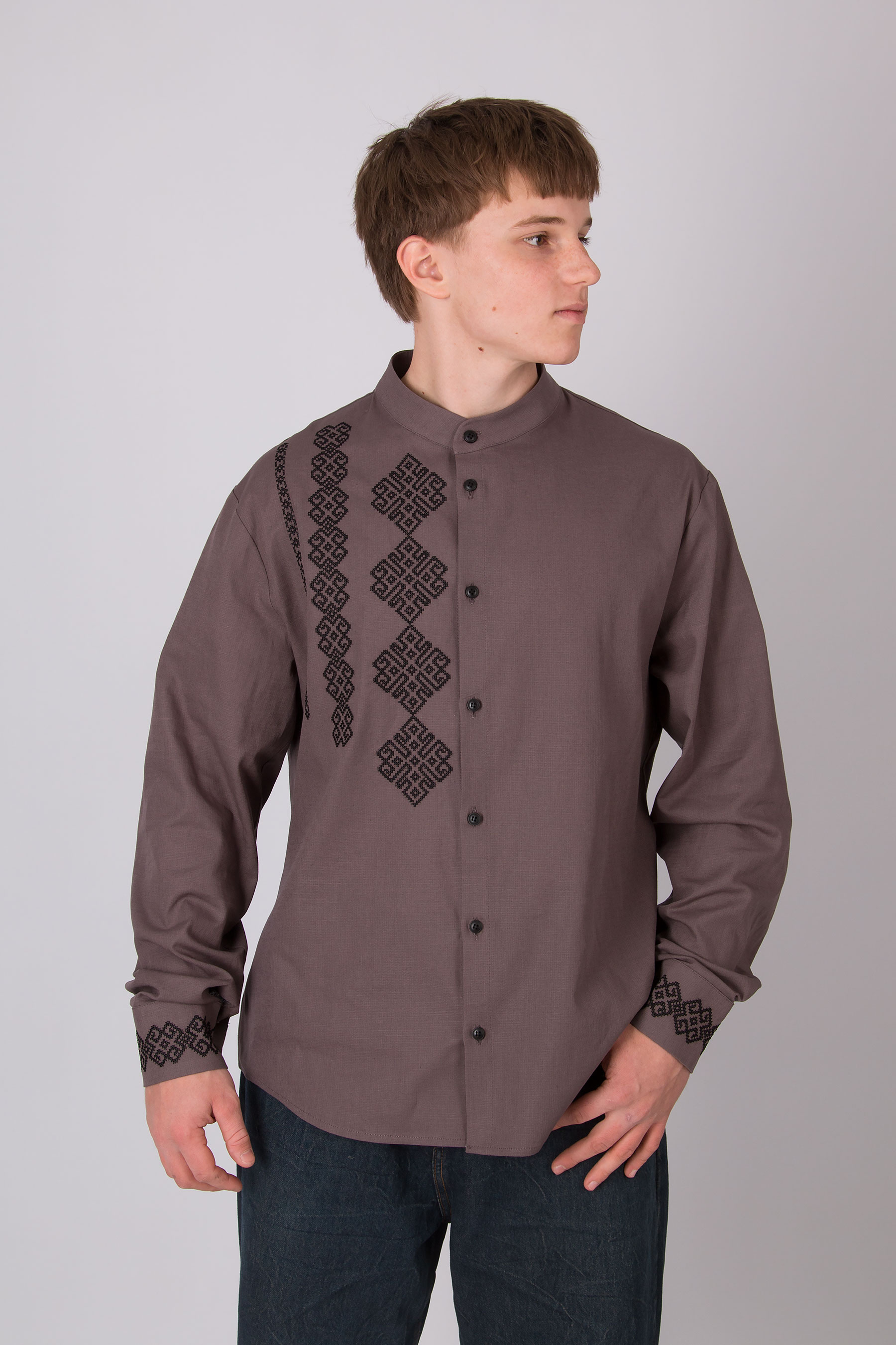 Вишиванка з довгим рукавом. Прямий крій, комір-стійка, застібка на ґудзики. Вишивка розміщена по передній частині виробу та на манжетах, доповнена елементом на спинці.