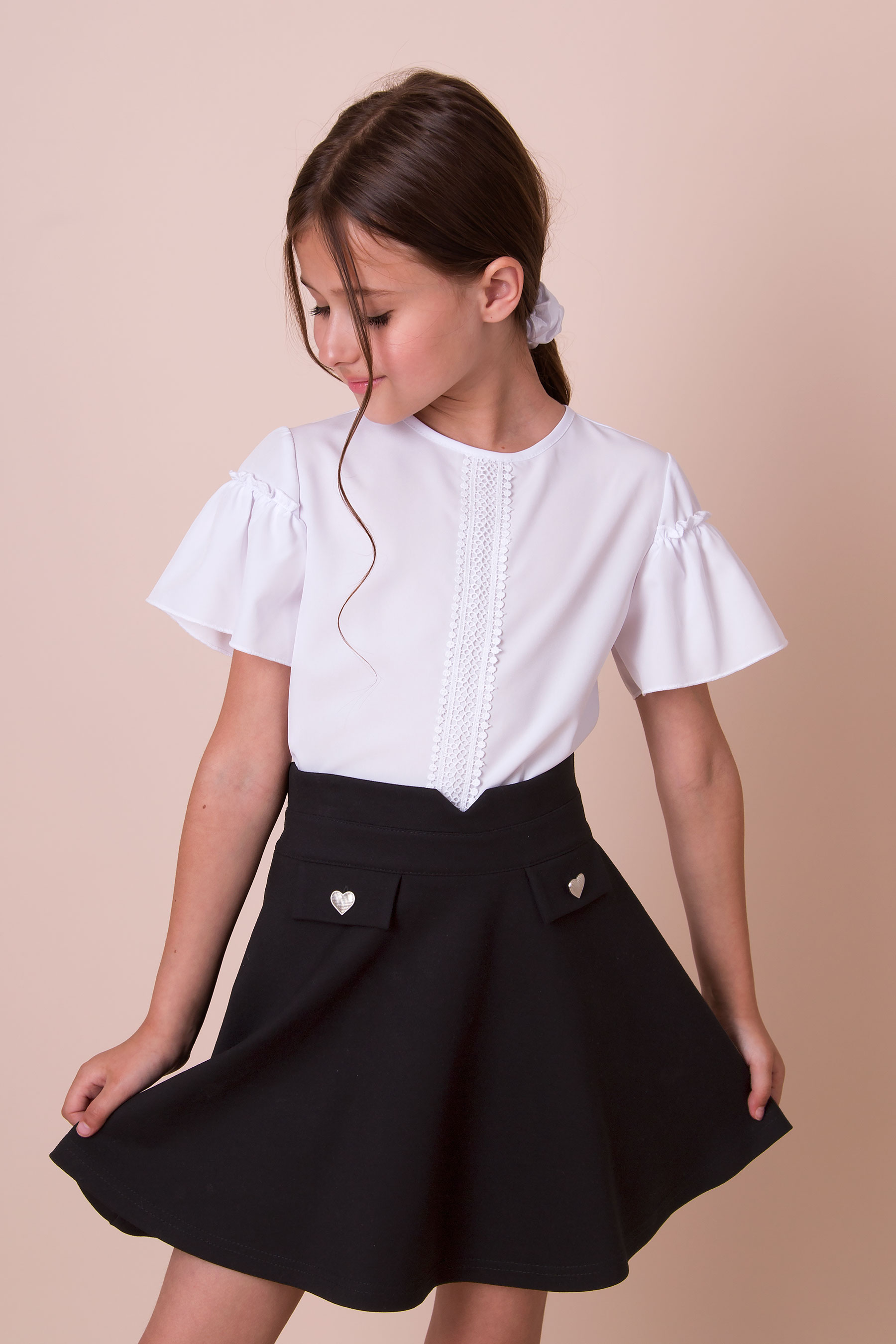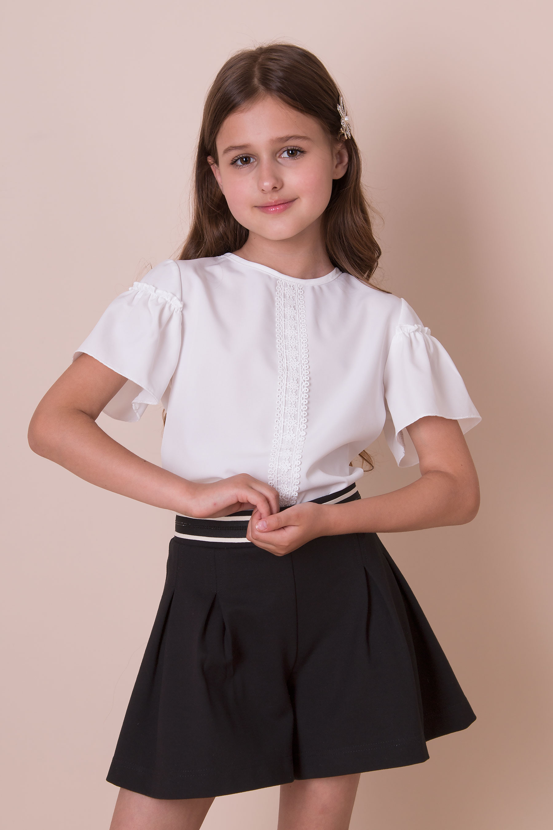 Блузка з короткими розкльошеними рукавами та декоративною вставкою спереду. Стриманий крій і лаконічні деталі — ідеальний варіант для шкільного гардероба.