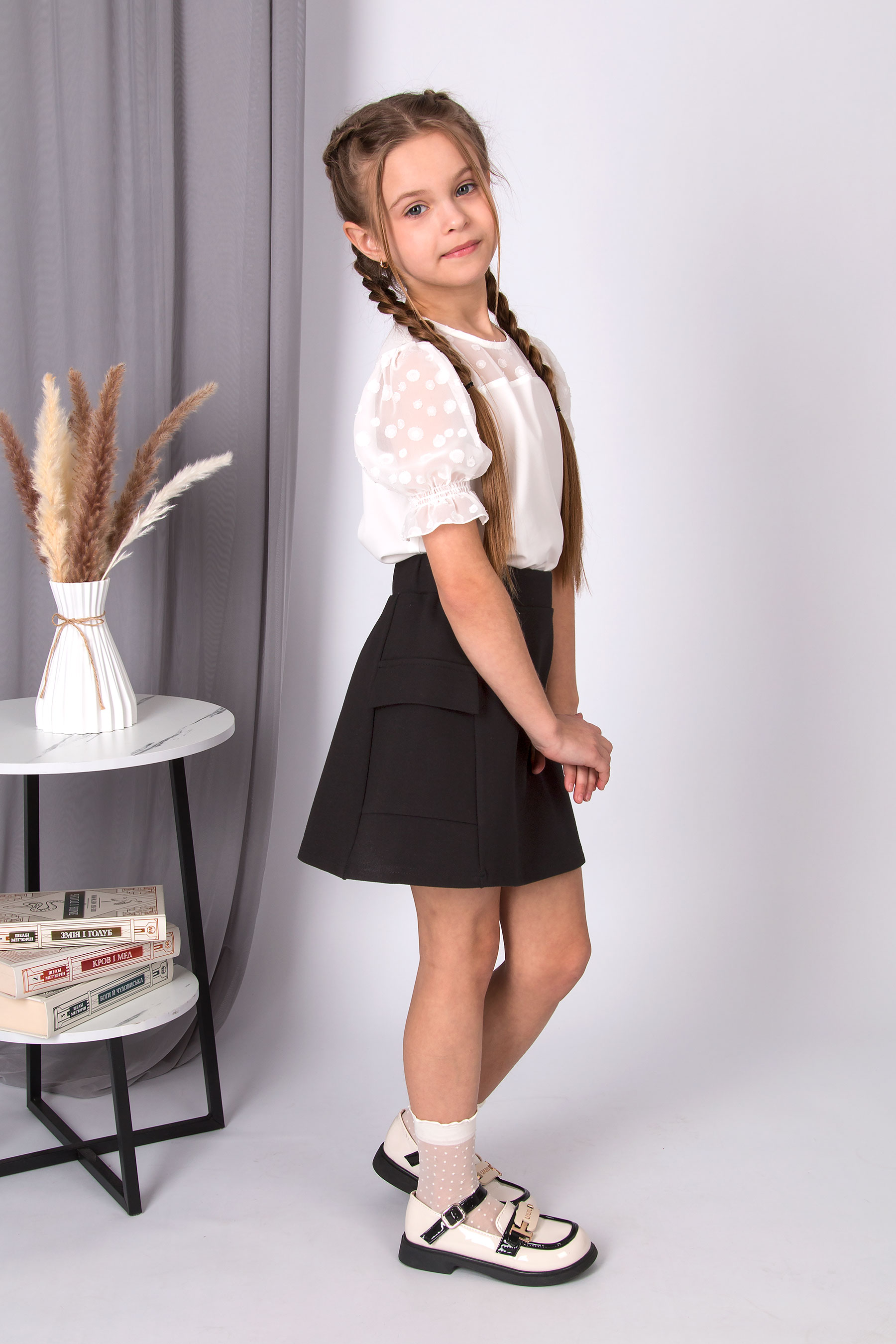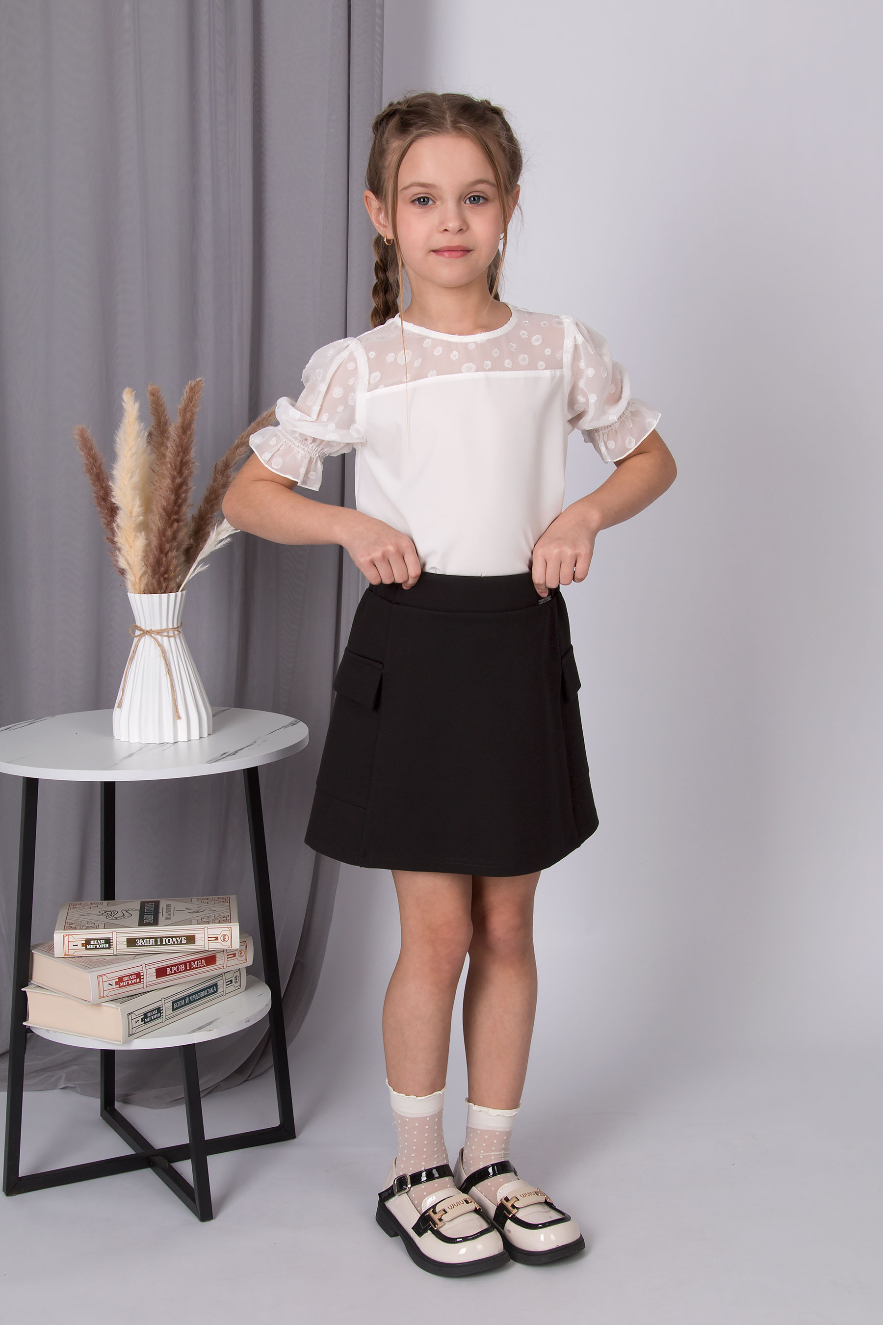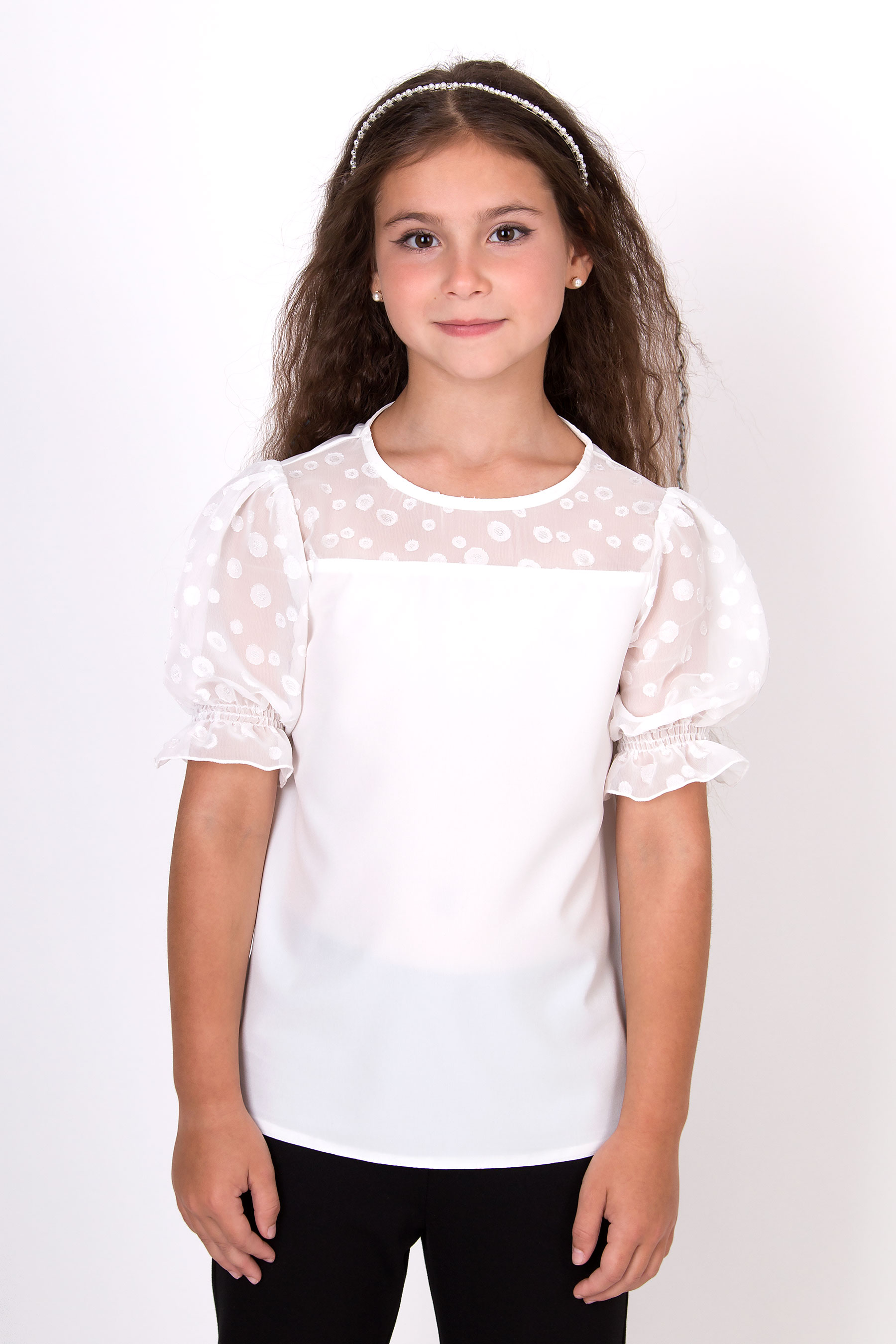 Шкільна блуза з софту. Верхня частина та короткі рукави виконані з сітки в горошок. Круглий виріз, рукави з еластичними манжетами.