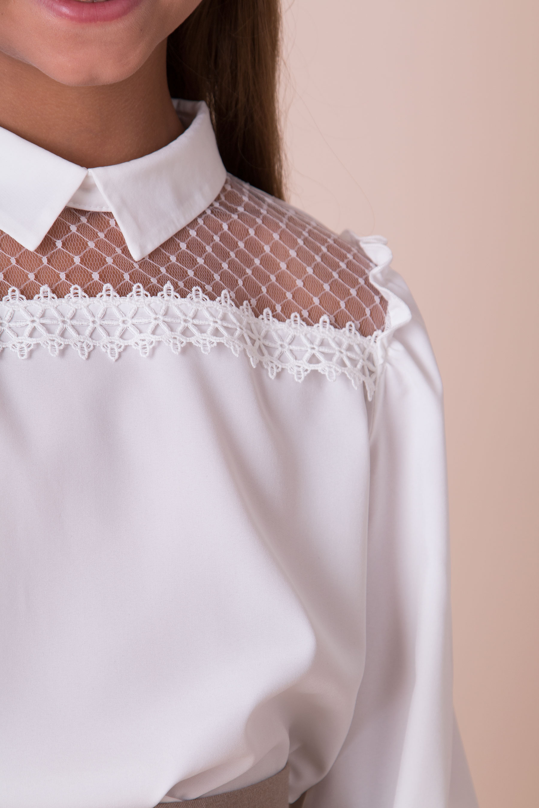Блузка з довгим рукавом і класичним комірцем — ніжна та елегантна модель для гардероба дівчинки.