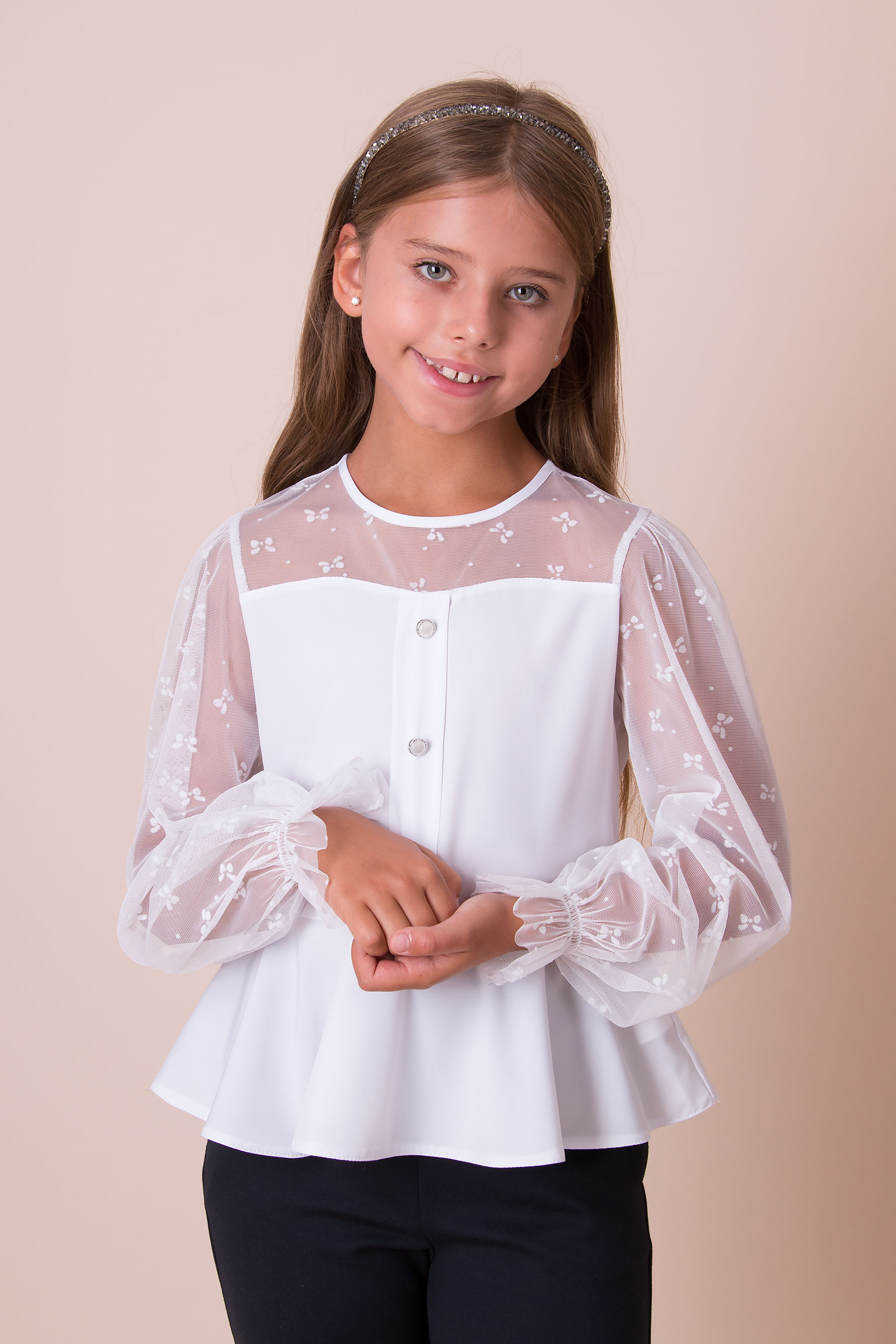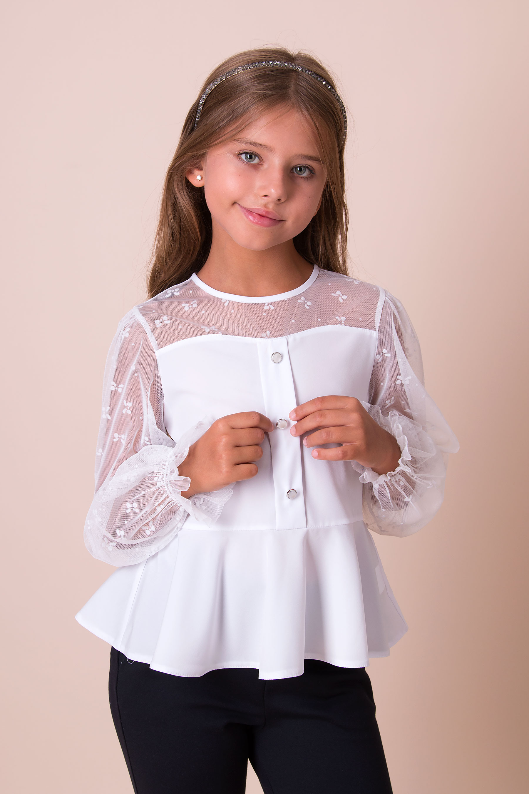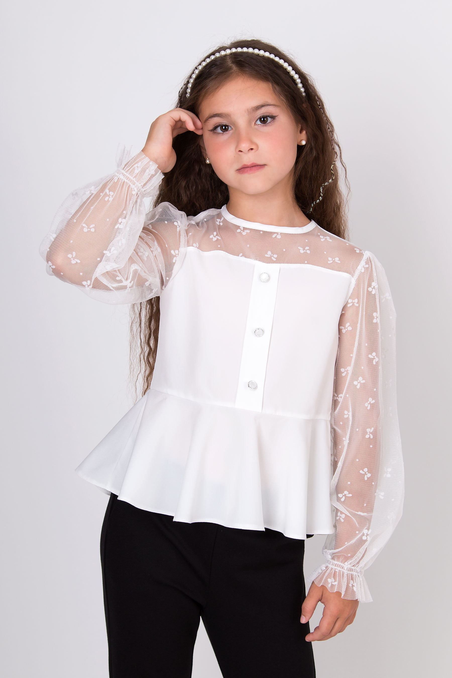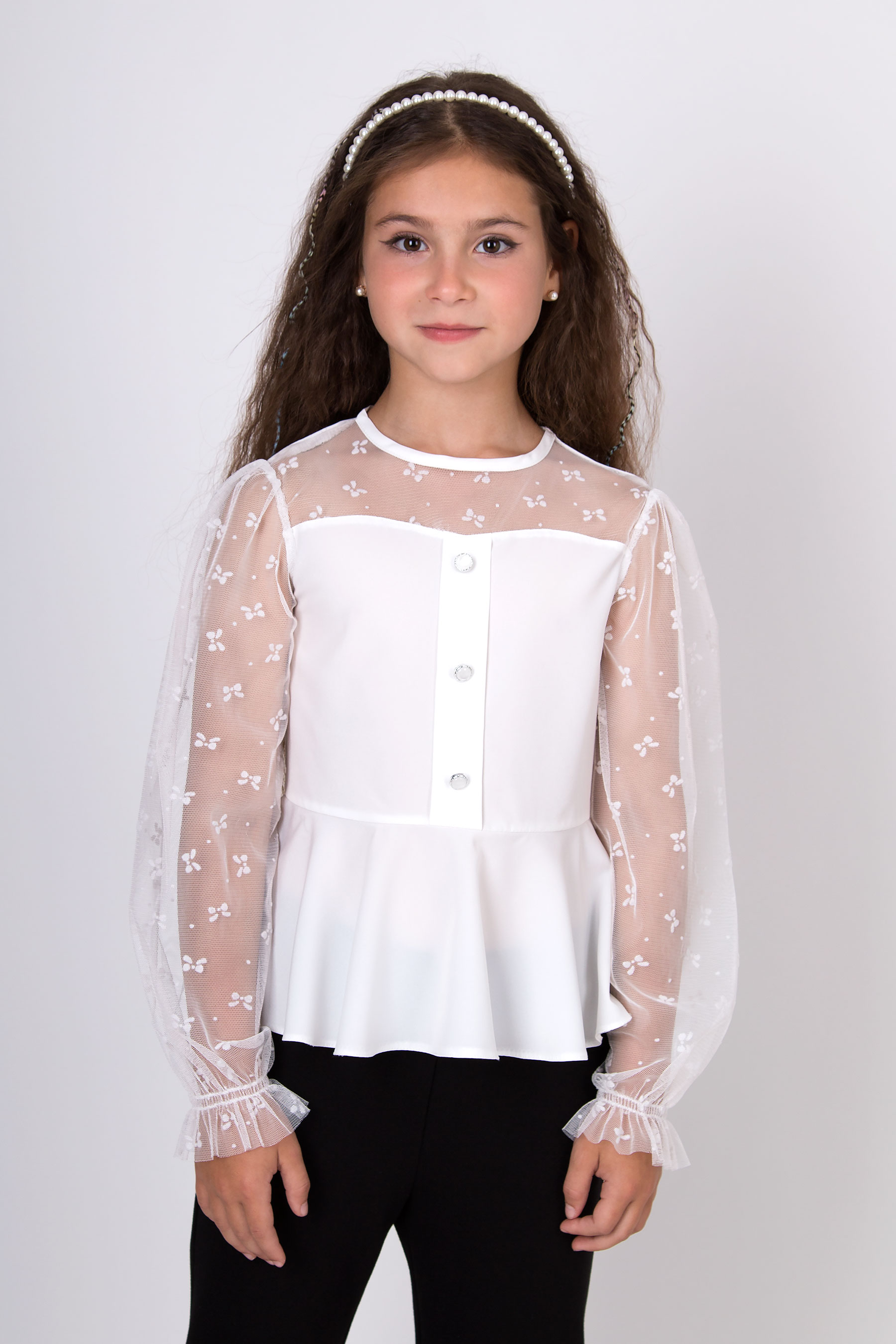 Блуза з тканини софт для дівчинки, декорована сіткою з бантиками. Прямий верх, відрізна талія з об’ємним низом. Довгі рукави з сітки з бантиками, низ рукавів на резинці. Застібка спереду на декоративні ґудзики.