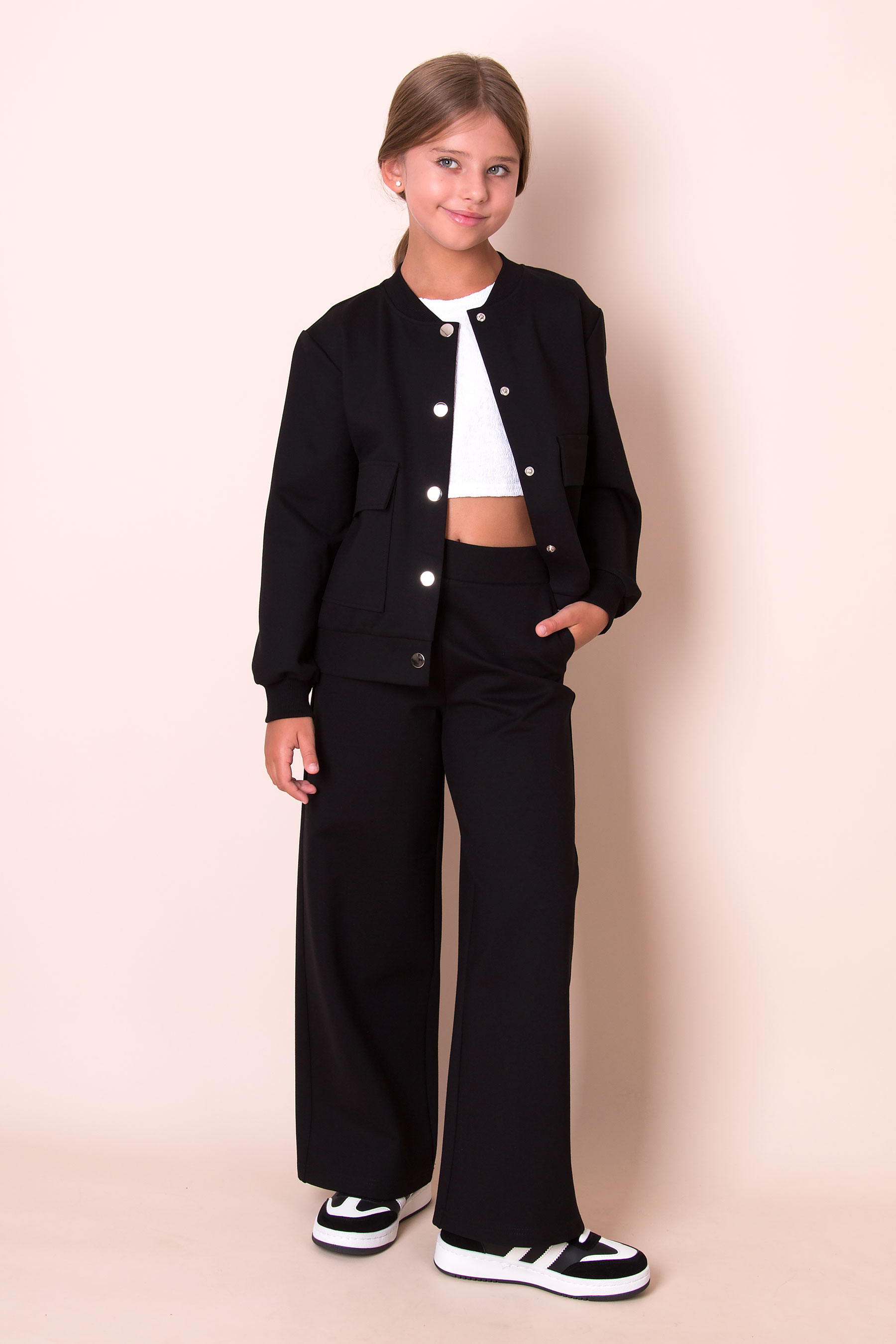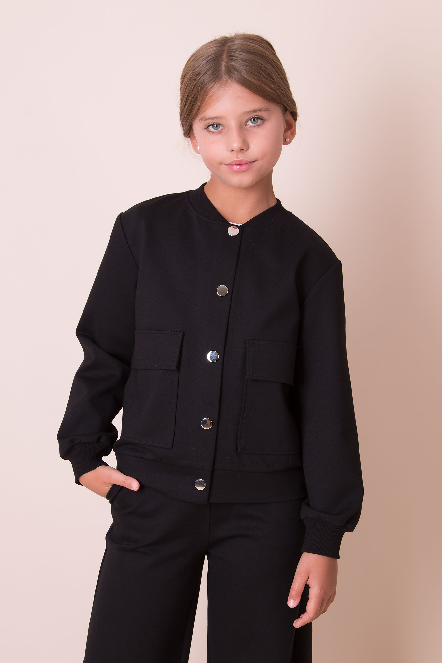 Бомбер з застібкою на кнопки. Має зручні накладні кишені спереду й м’які манжети на рукавах.