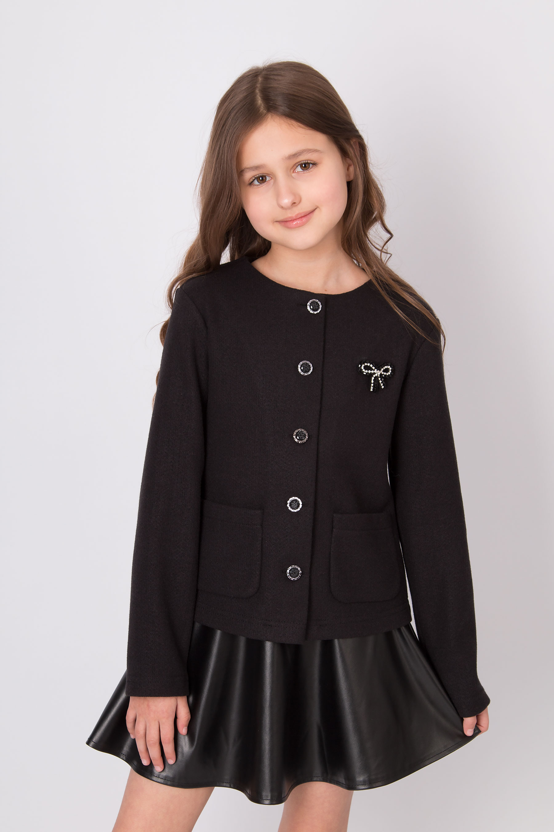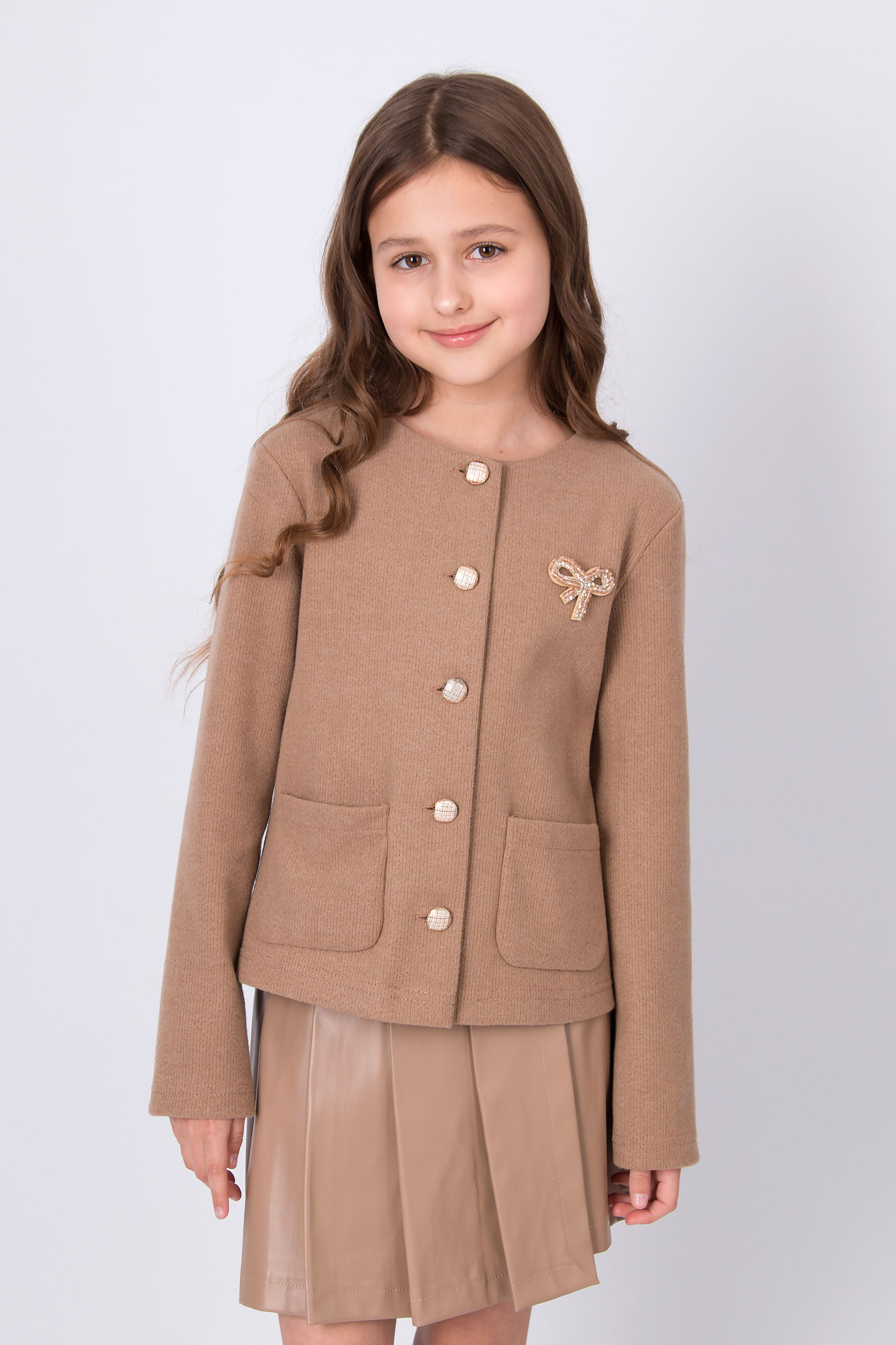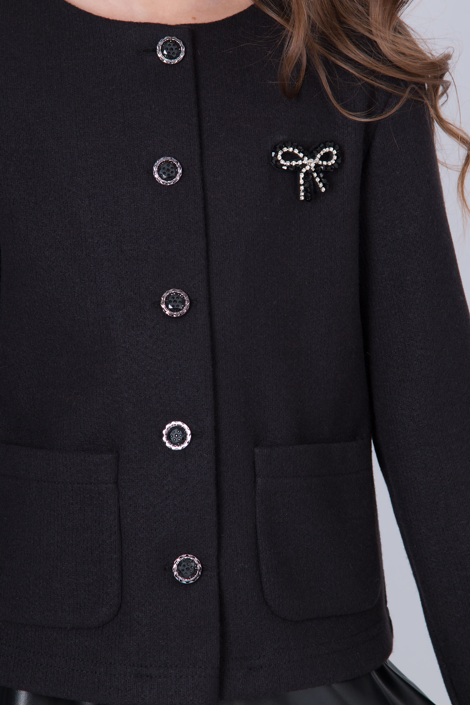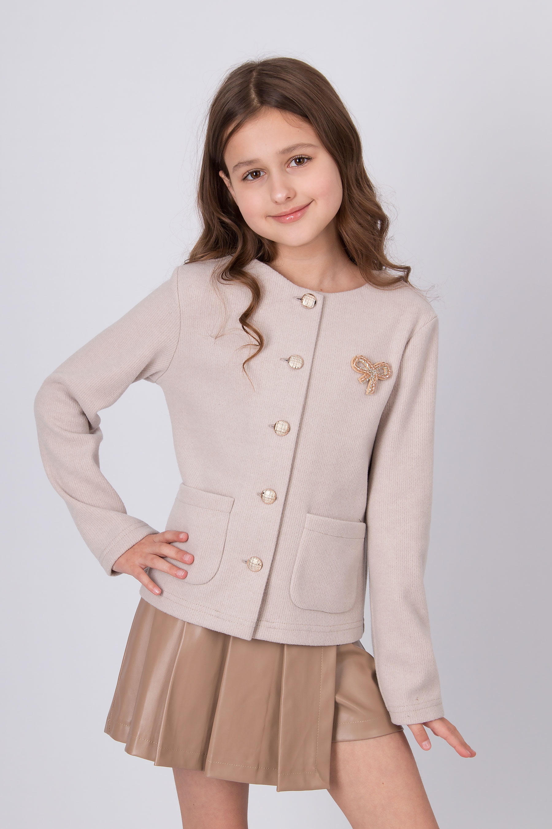 Жакет з трикотажної вʼязаної тканини з круглою горловиною та застібкою на ґудзики. Модель має довгі рукави та дві накладні кишені спереду. Ґудзики й кишені роблять дизайн більш виразним. Підходить для повсякденних образів і шкільного стилю.