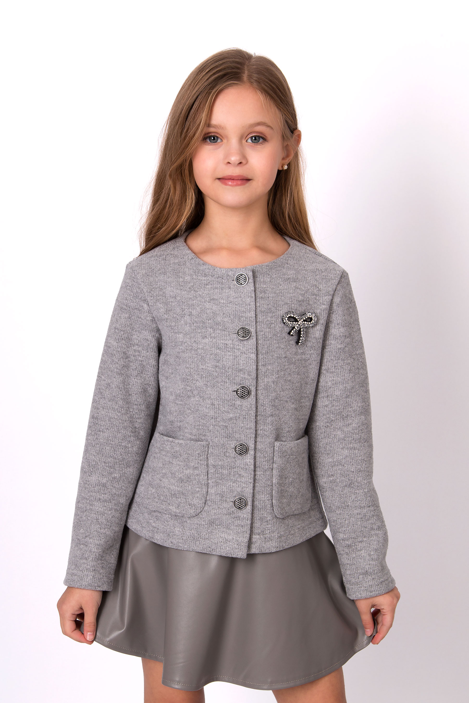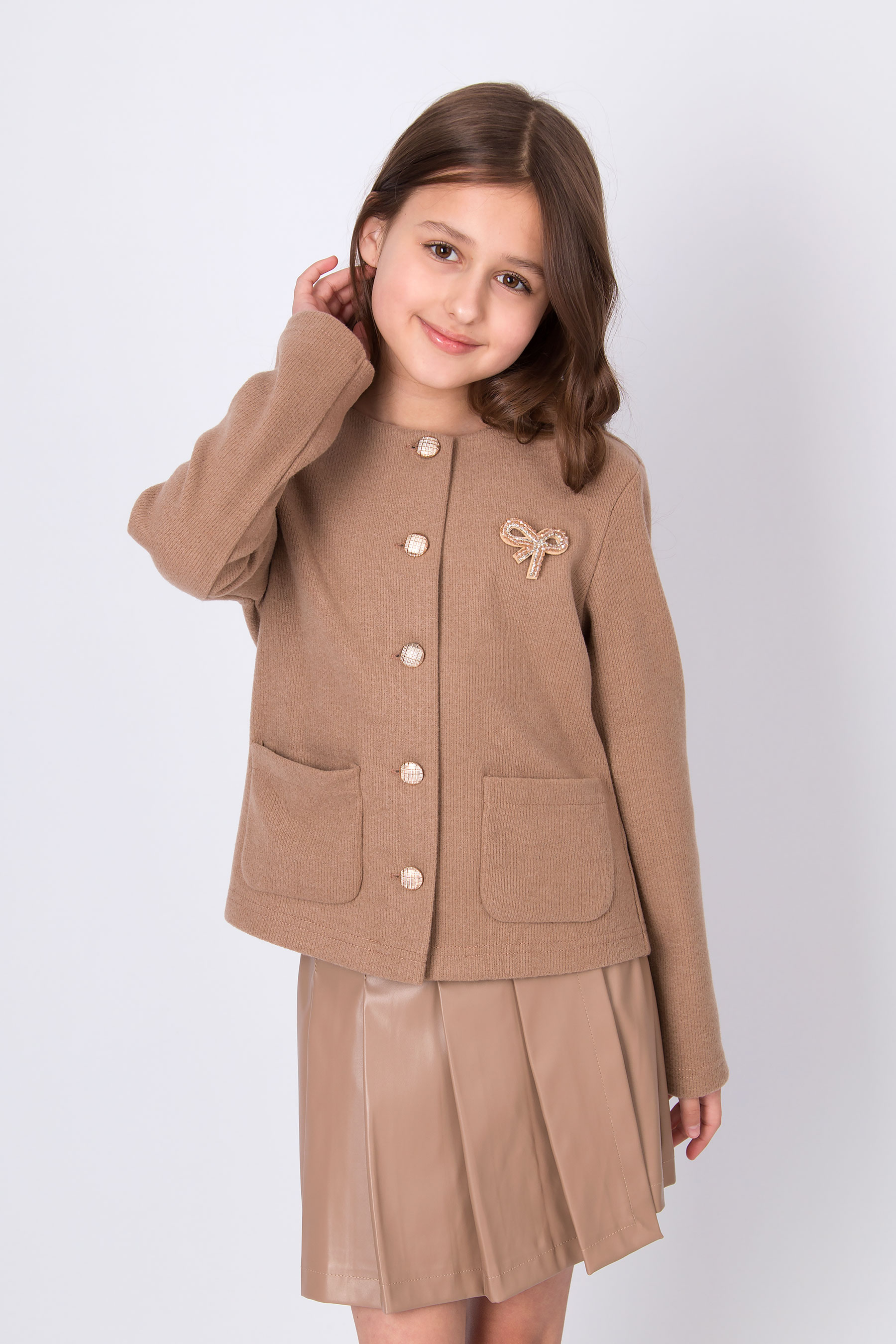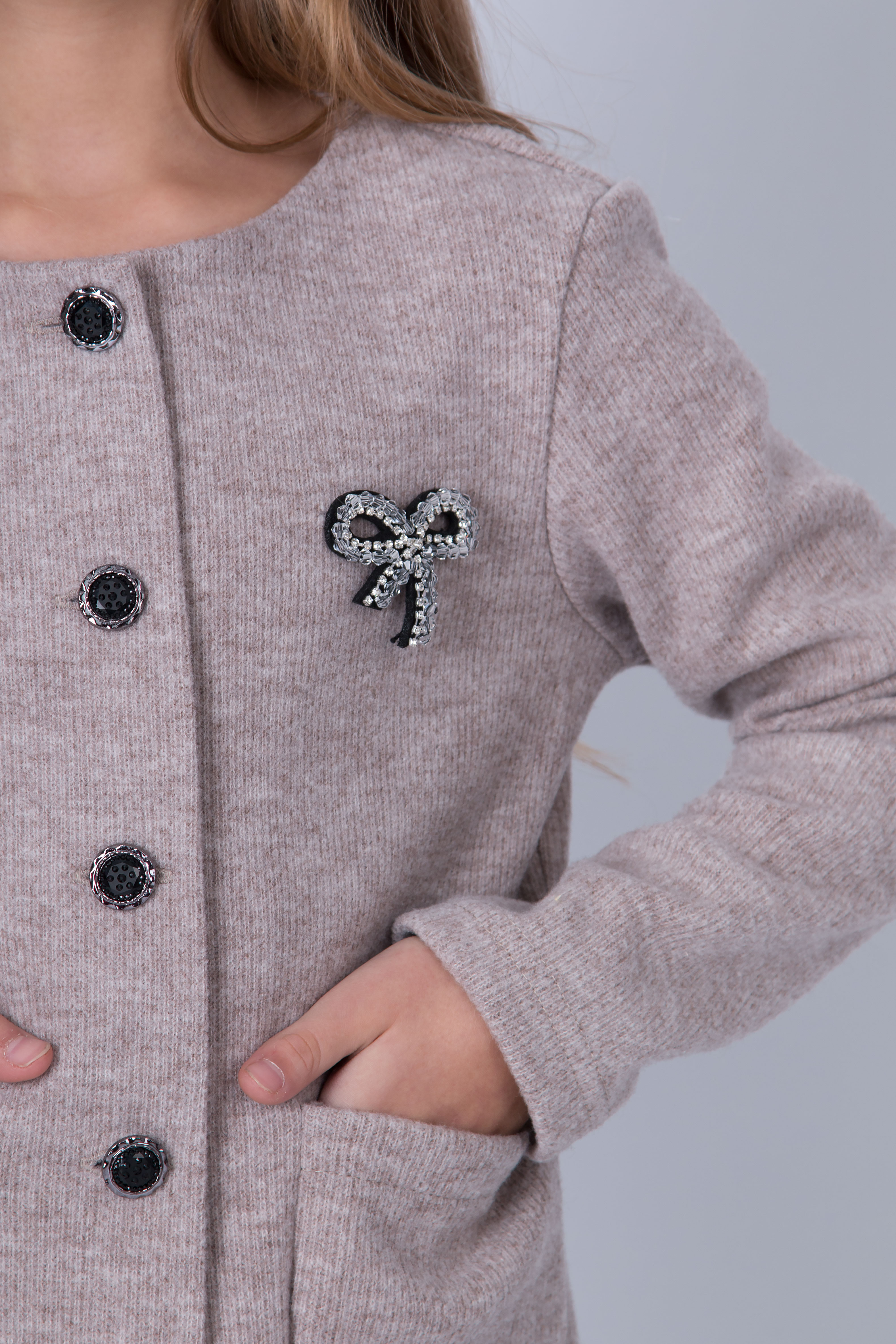 Жакет з трикотажної вʼязаної тканини з круглою горловиною та застібкою на ґудзики. Модель має довгі рукави та дві накладні кишені спереду. Ґудзики й кишені роблять дизайн більш виразним. Підходить для повсякденних образів і шкільного стилю.