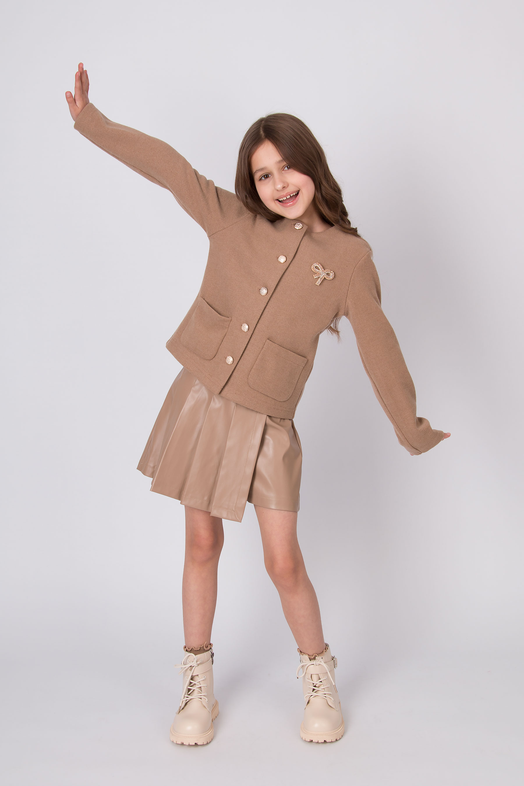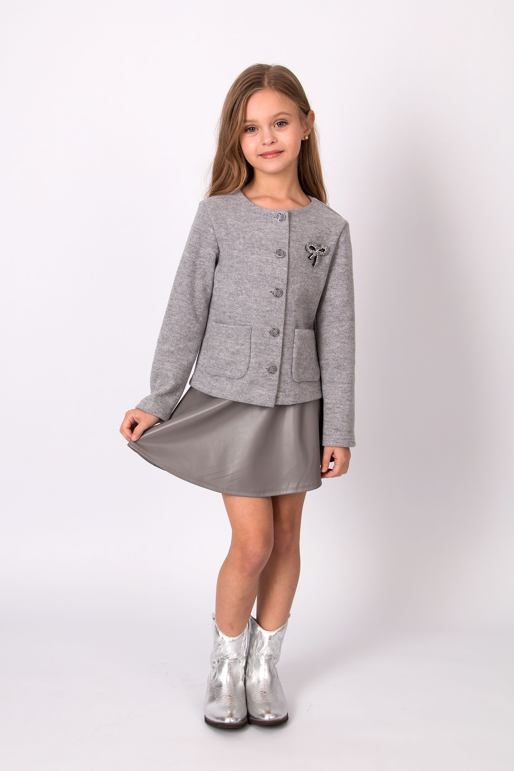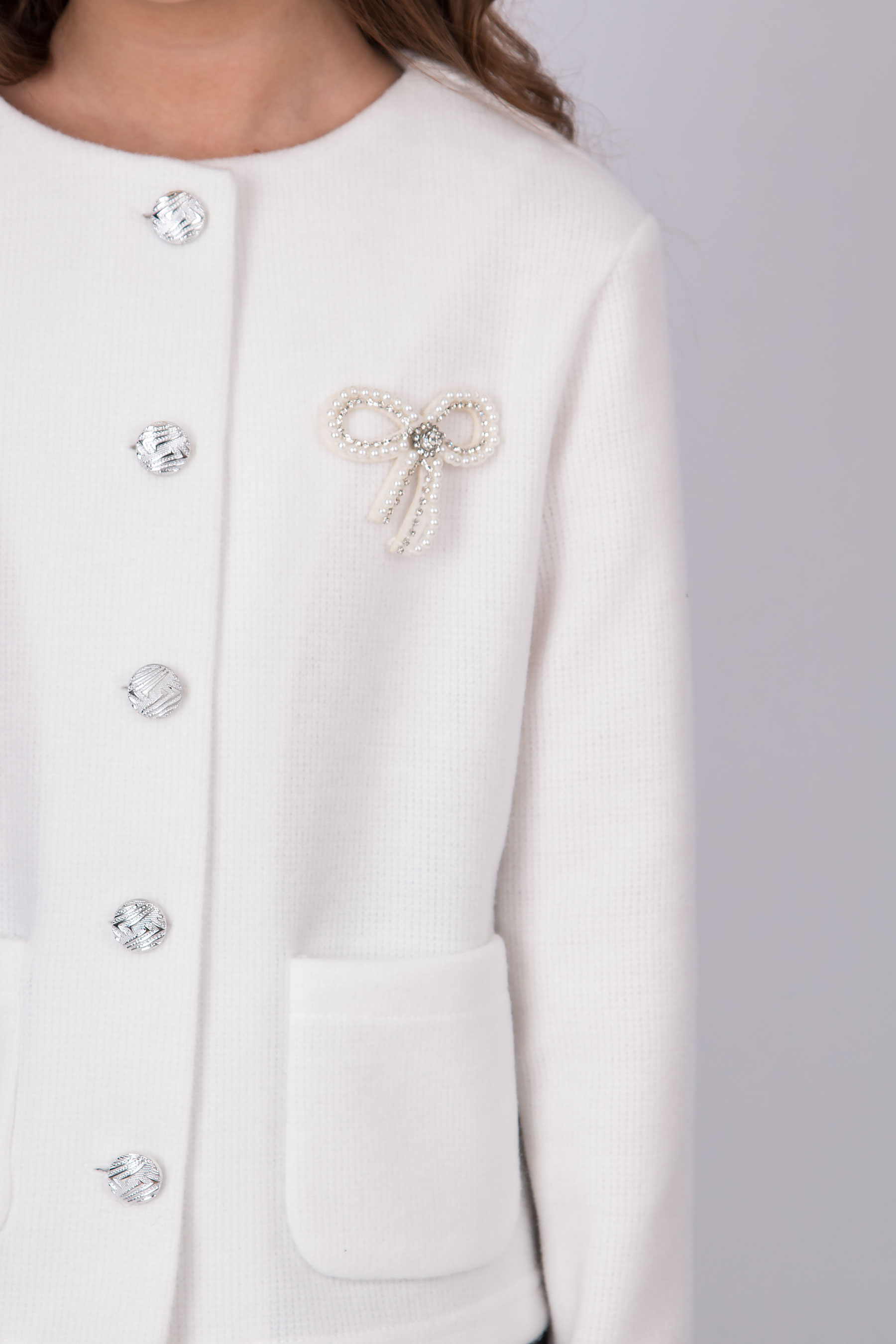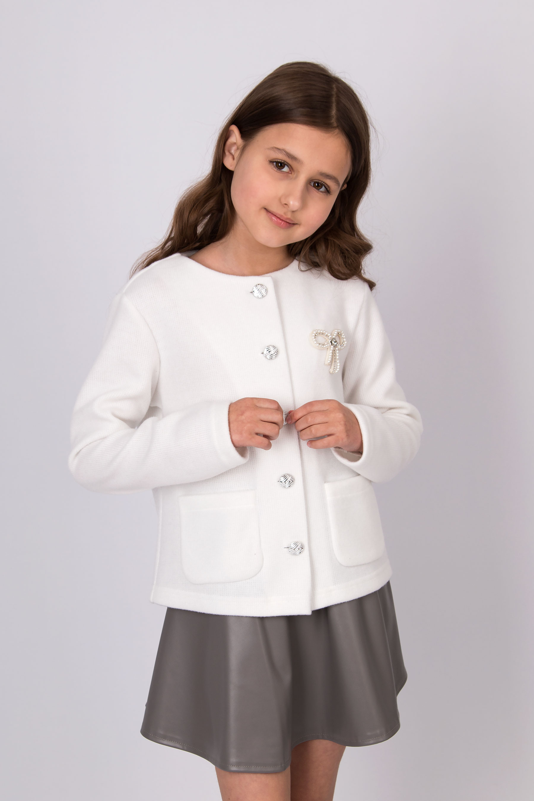 Жакет з трикотажної вʼязаної тканини з круглою горловиною та застібкою на ґудзики. Модель має довгі рукави та дві накладні кишені спереду. Ґудзики й кишені роблять дизайн більш виразним. Підходить для повсякденних образів і шкільного стилю.