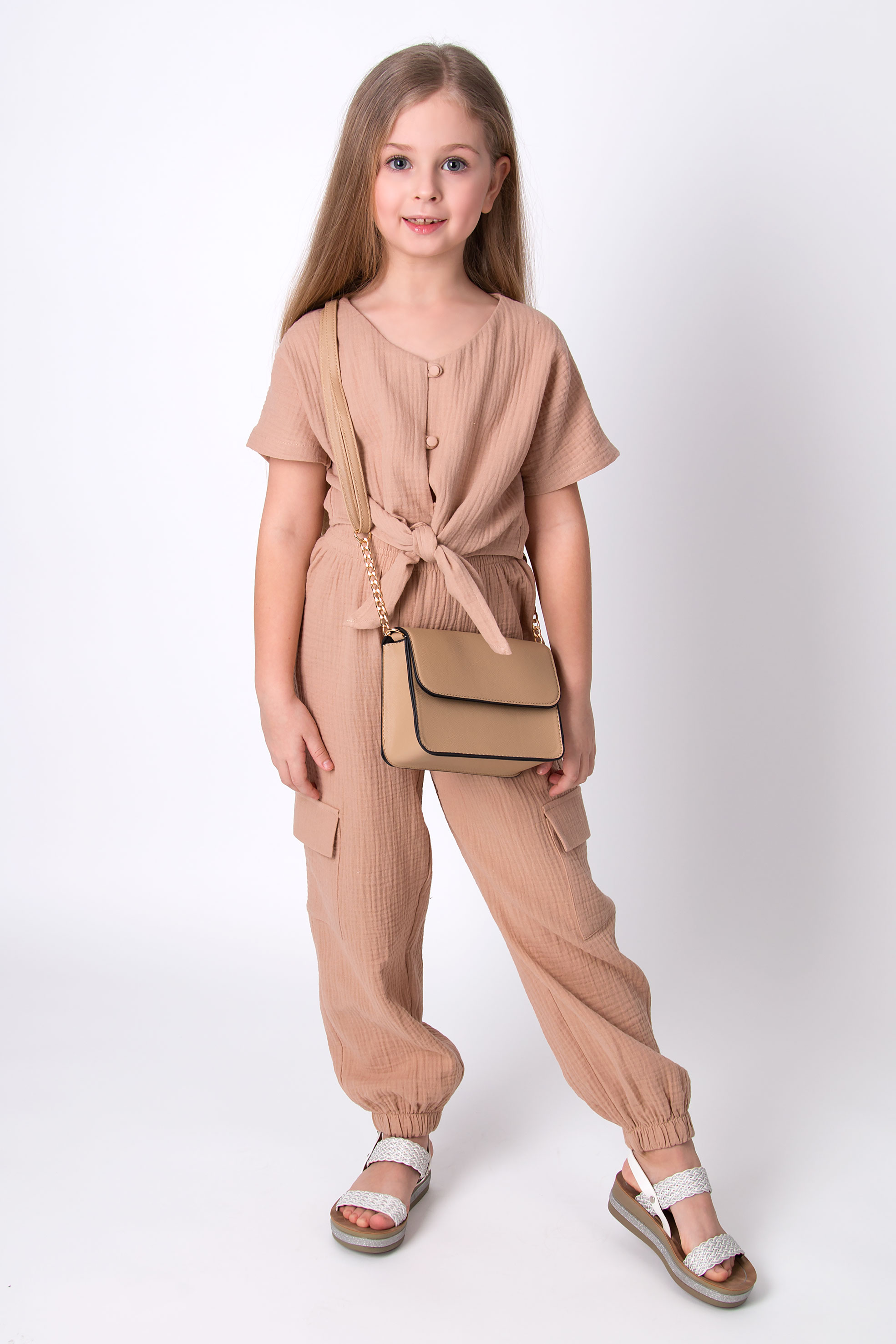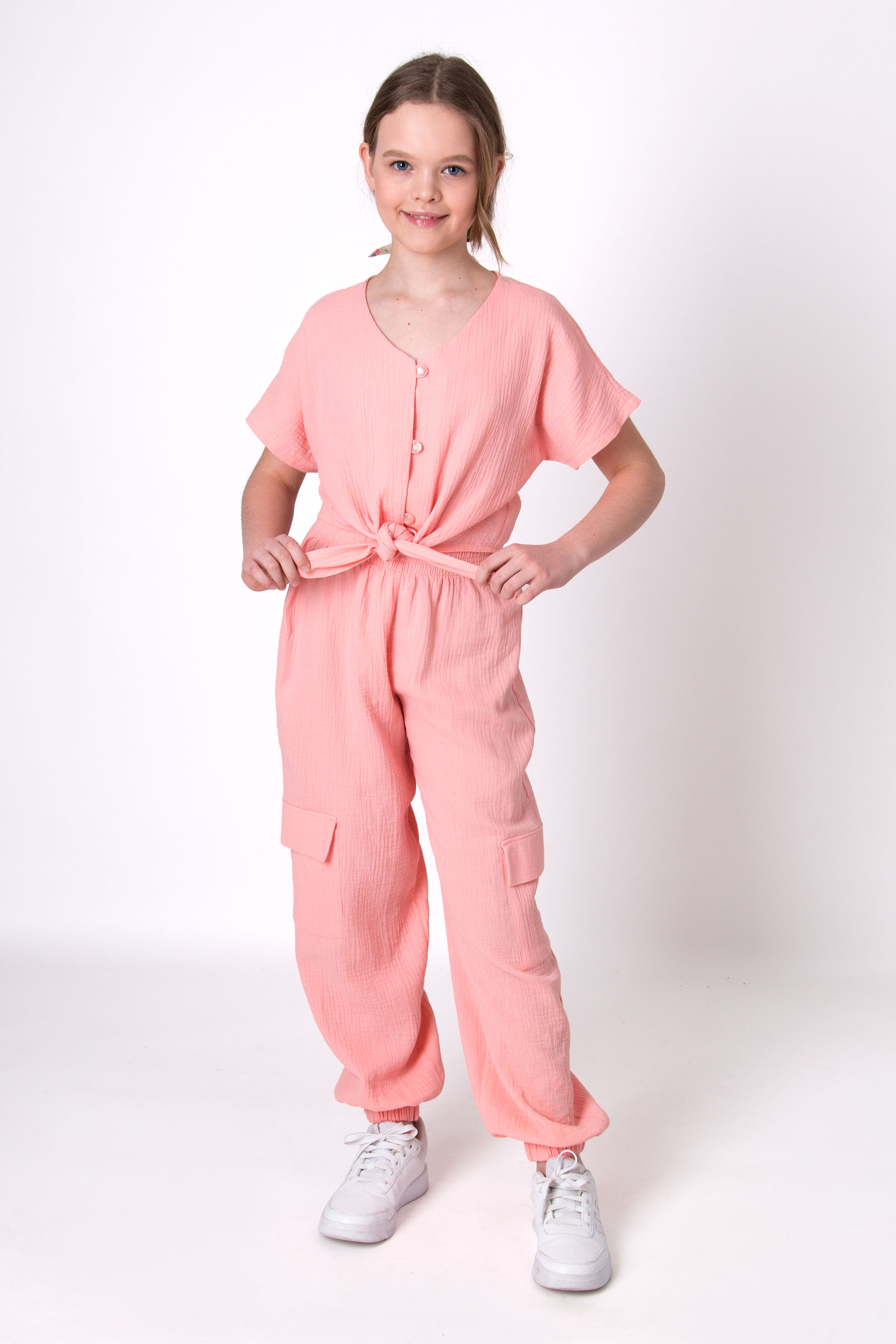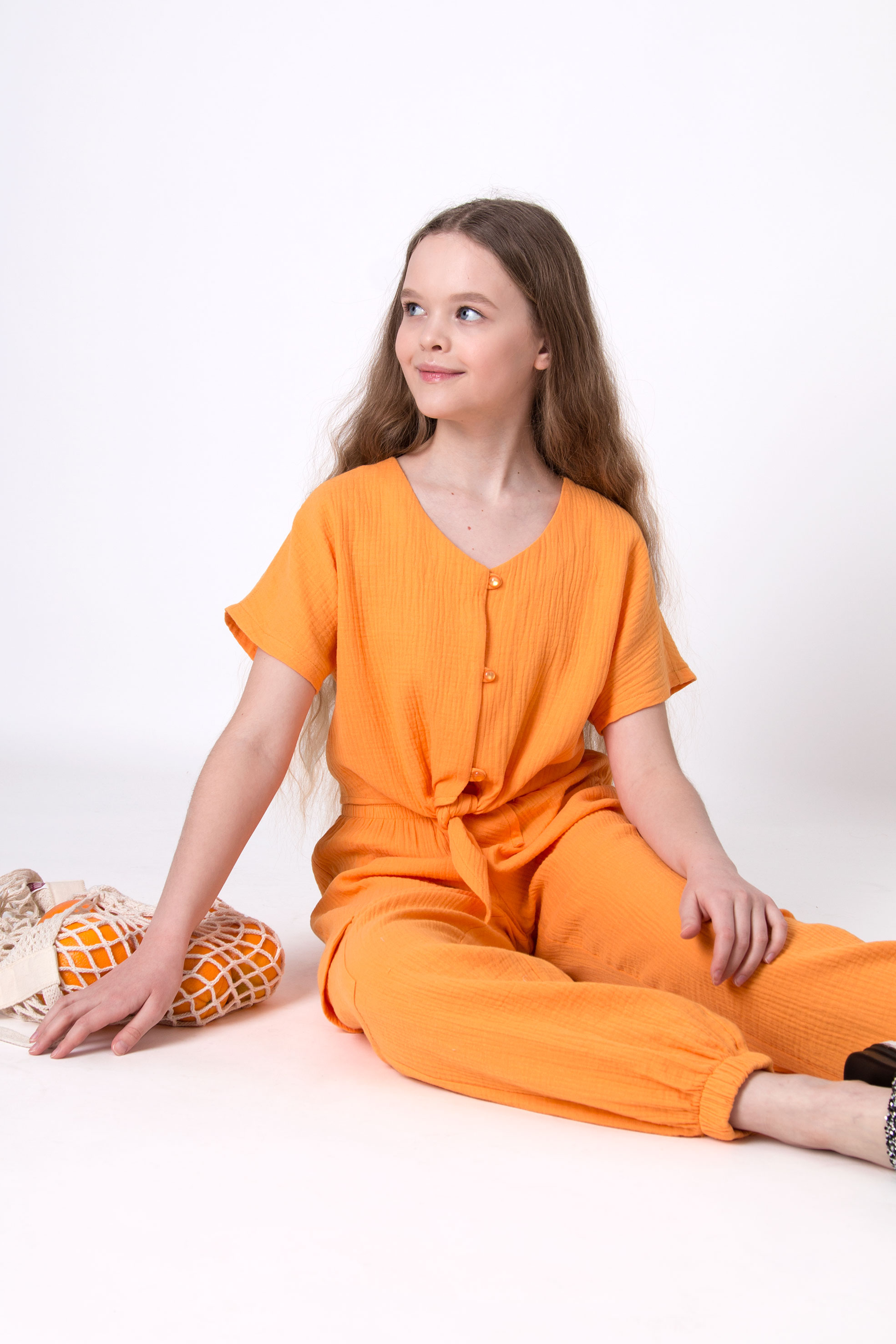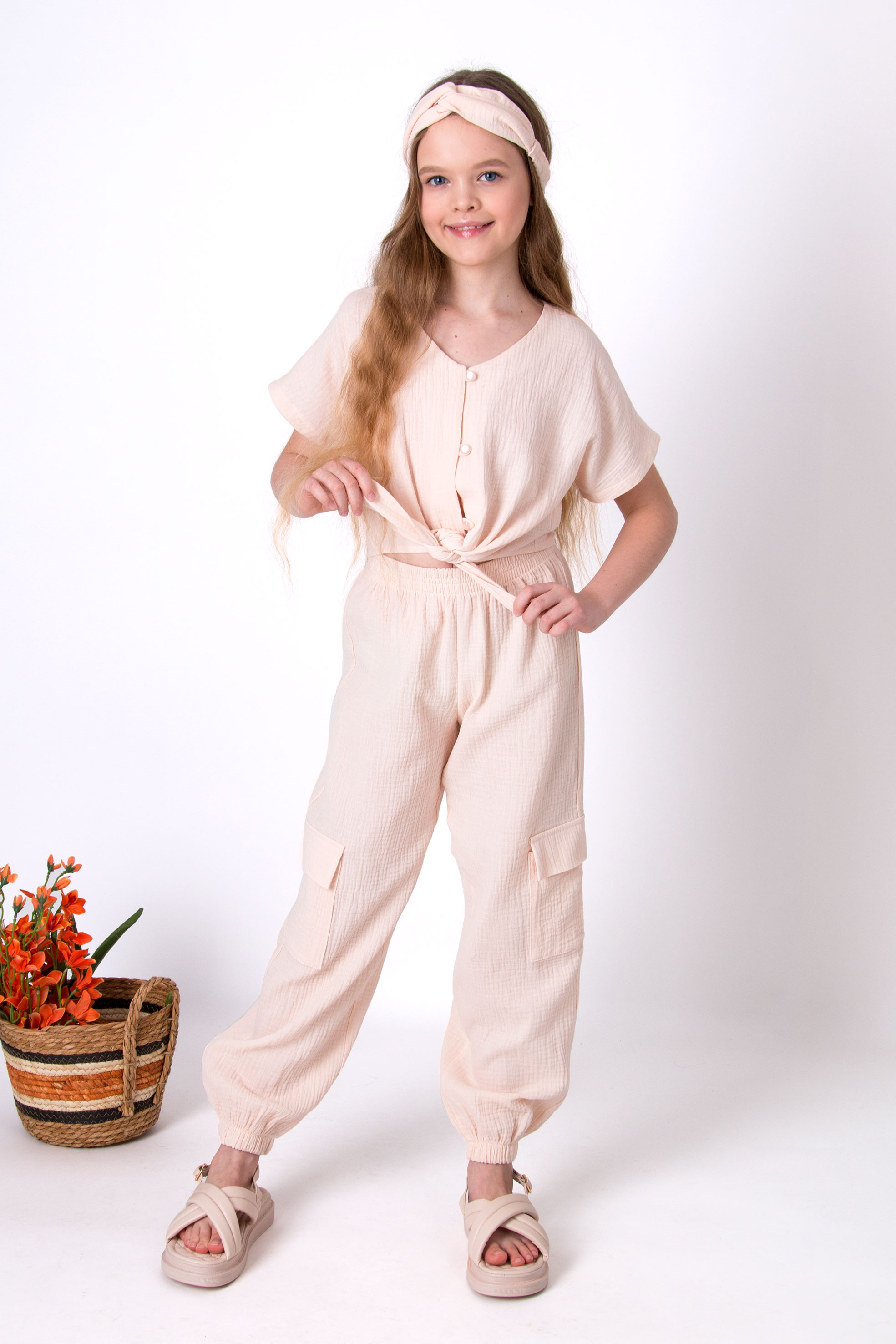 Костюм із мусліну, складається з сорочки та штанів. Сорочка з коротким рукавом, на ґудзиках, з вузликом спереду. Штани вільні, з накладними кишенями та зібрані внизу на манжет.
