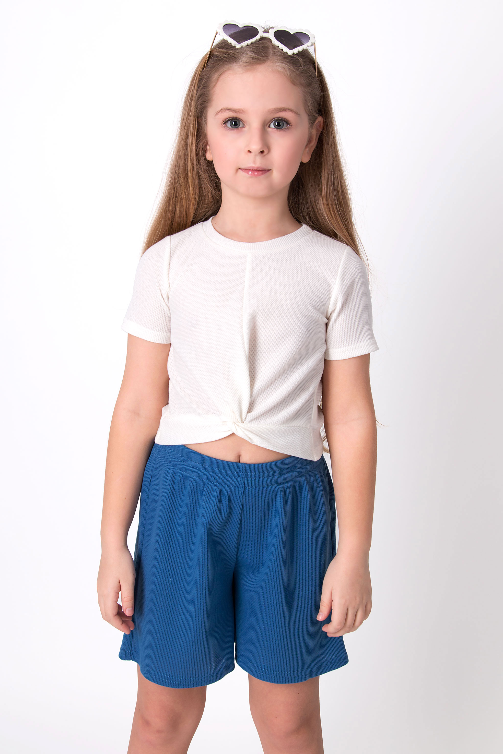 Костюм складається з футболки та шортів із трикотажної тканини. Футболка з коротким рукавом і акуратним вузликом спереду. Шорти вільні, з м’якою посадкою та рівним низом.