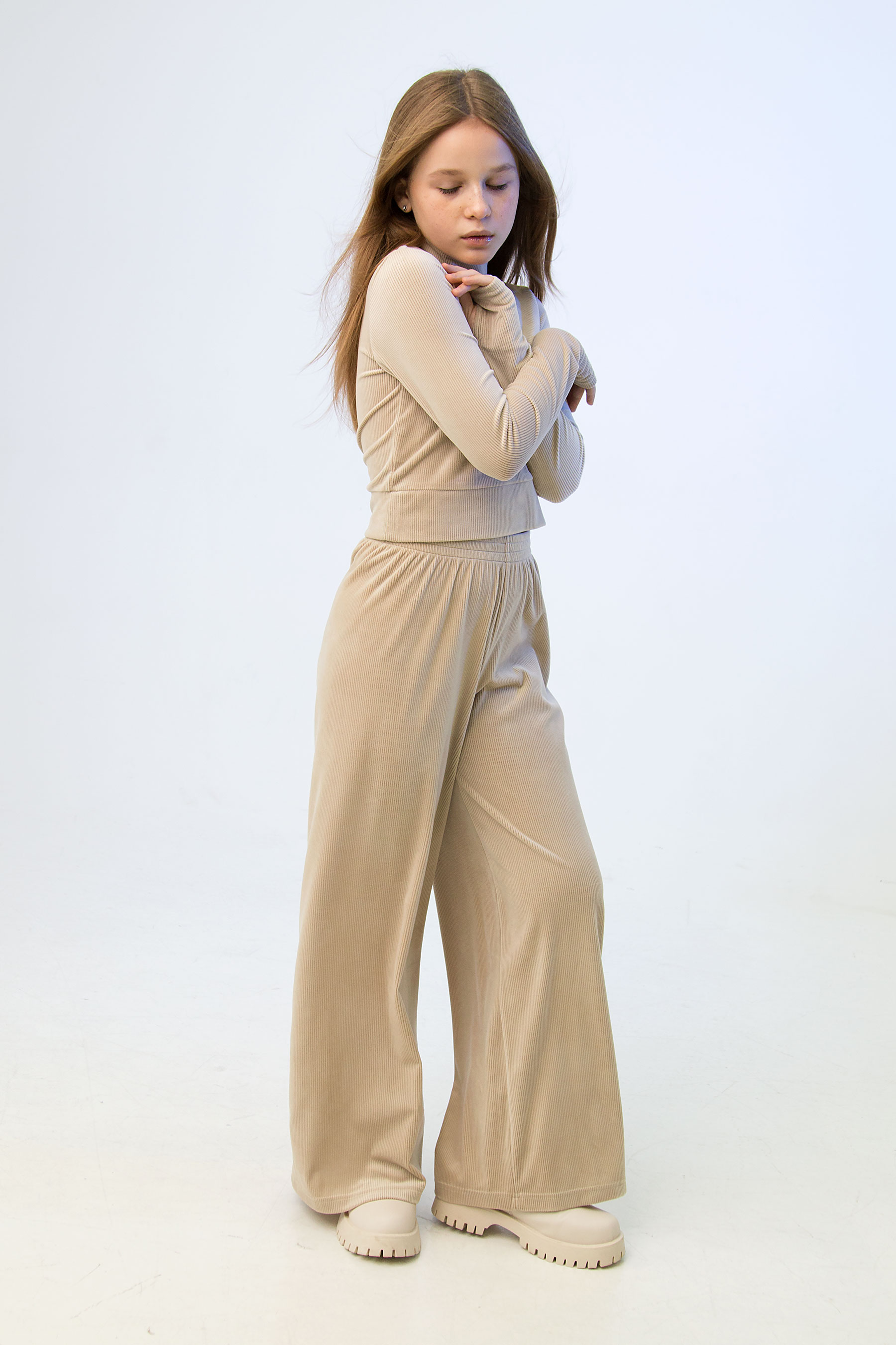 Костюм складається з кофти та штанів з м’якого велюру в рубчик. Кофта з довгим рукавом і невисоким коміром, акуратно прилягає до фігури. Штани широкі, вільні, з м’якими складками біля пояса.