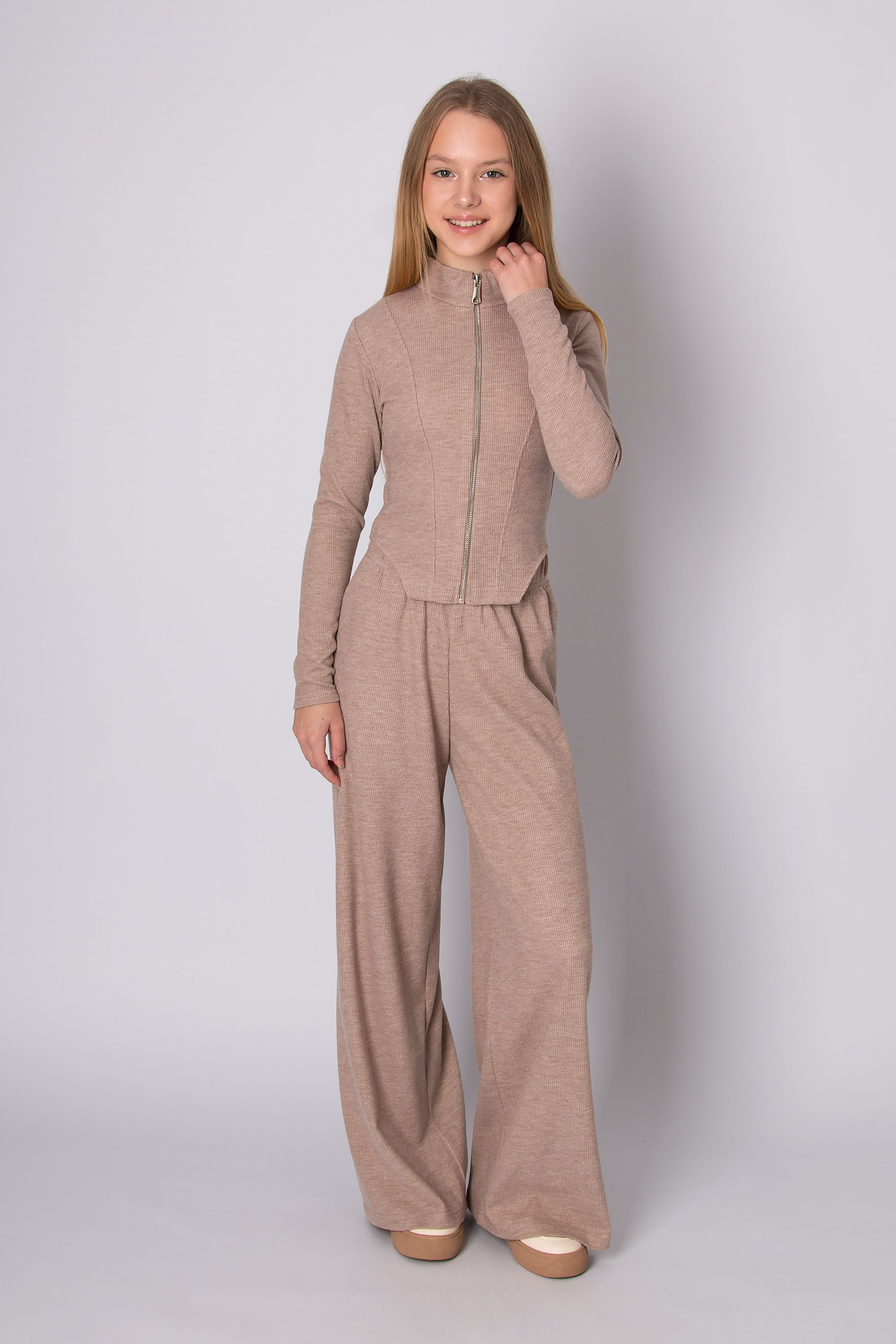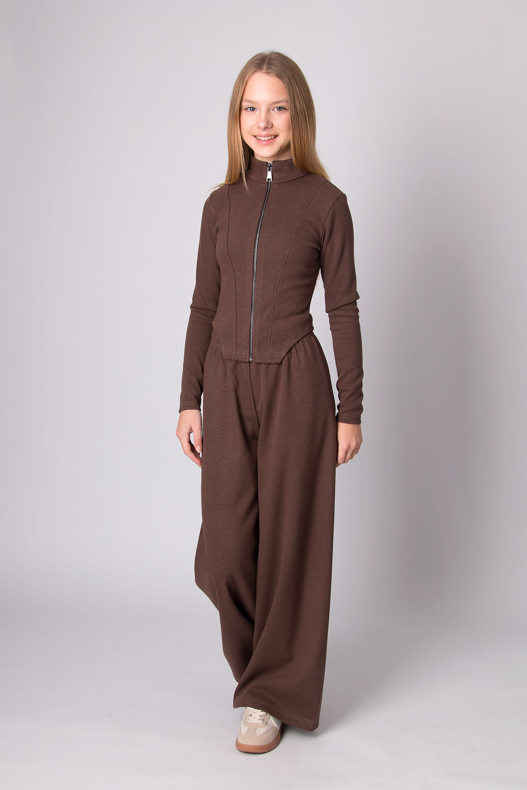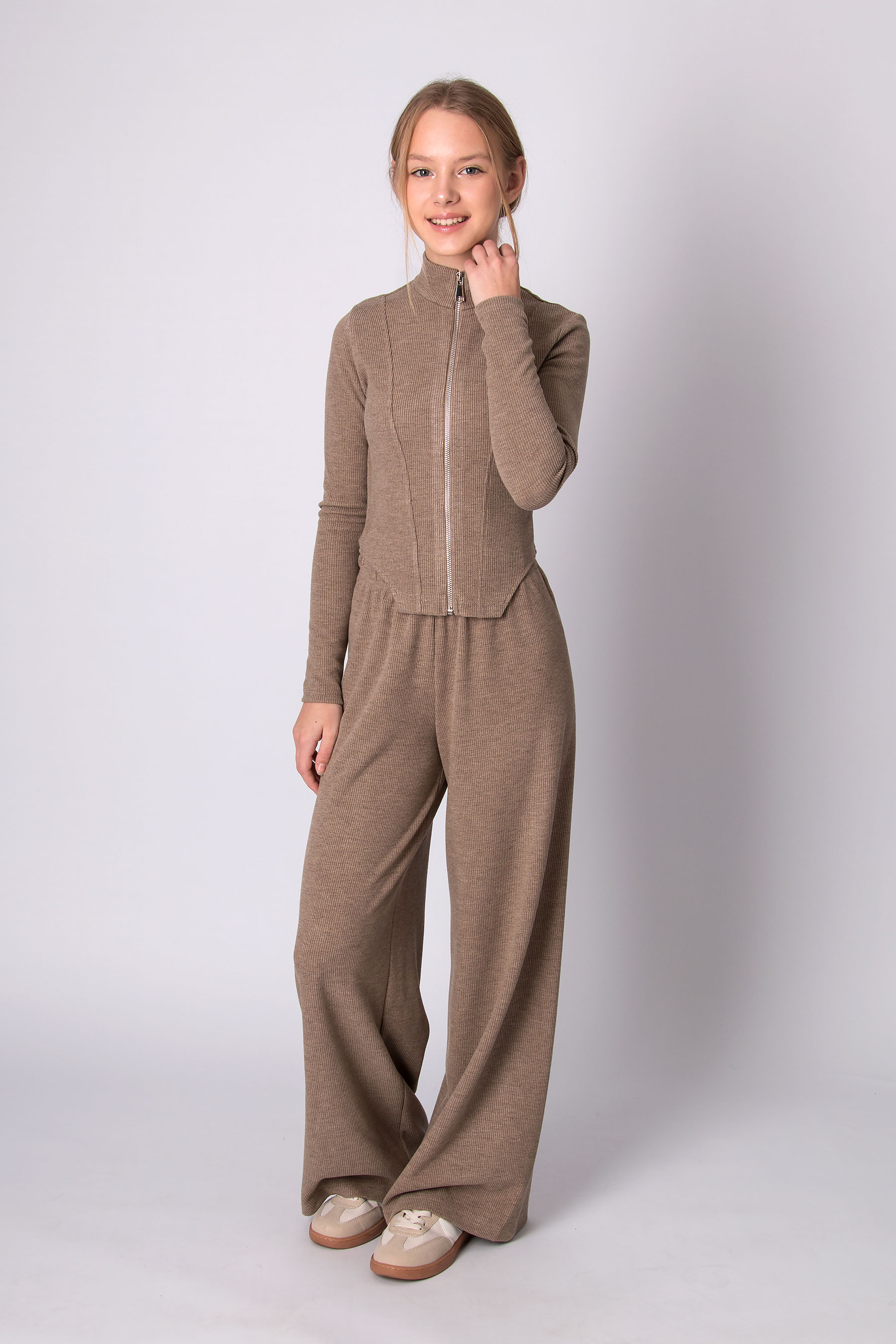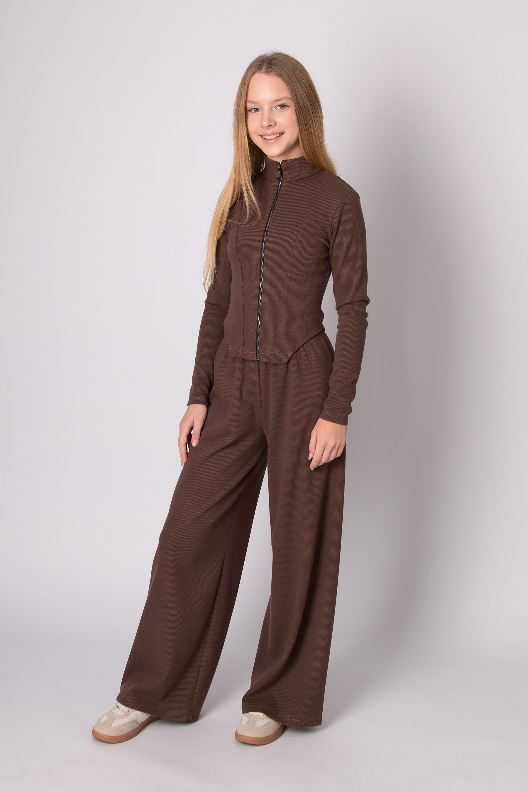 Костюм із щільного трикотажу в рубчик. Кофта приталеного крою на замку з довгим рукавом і високим коміром. Штани прямого крою, середньої посадки, пояс на еластичній резинці.