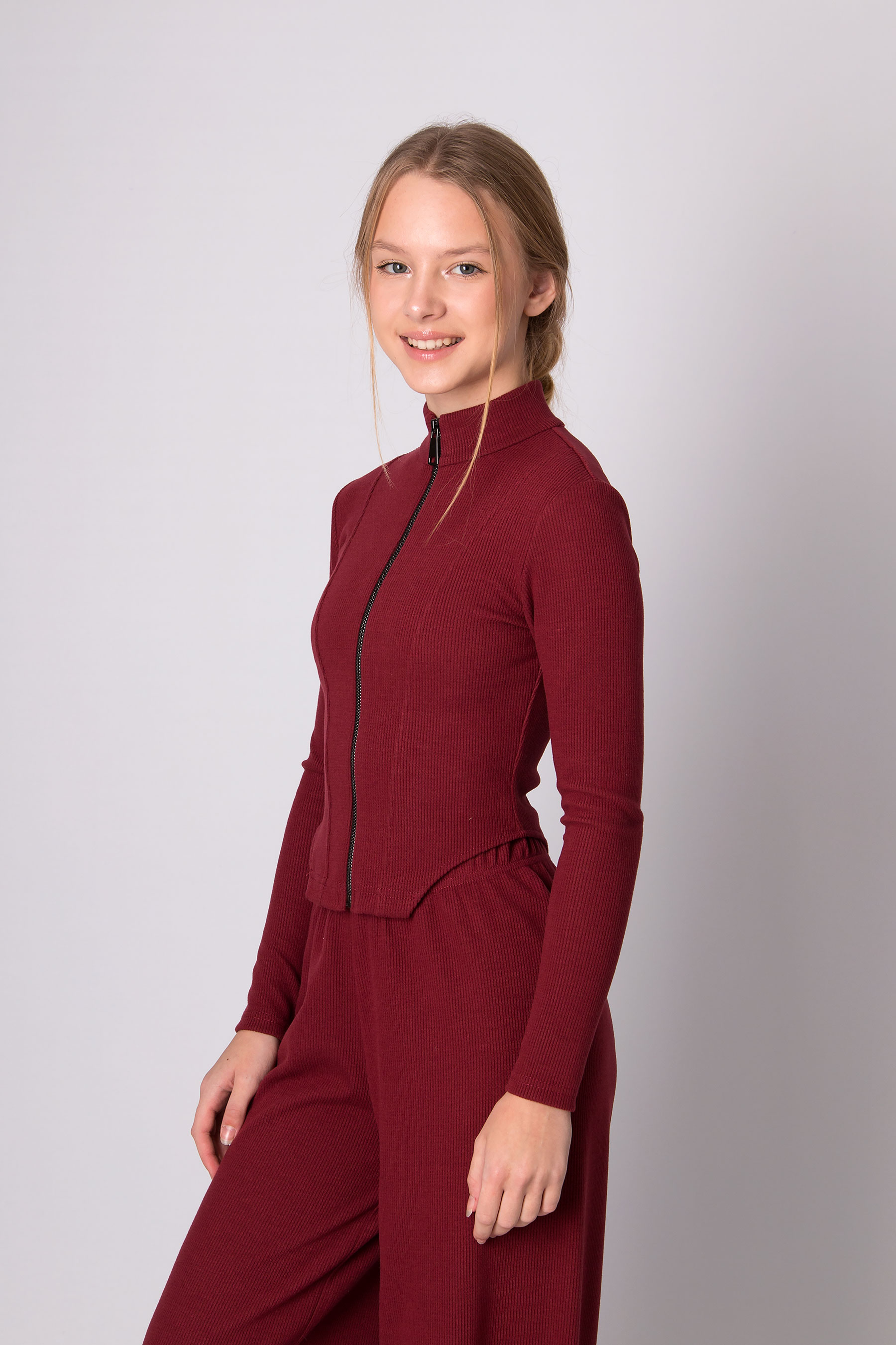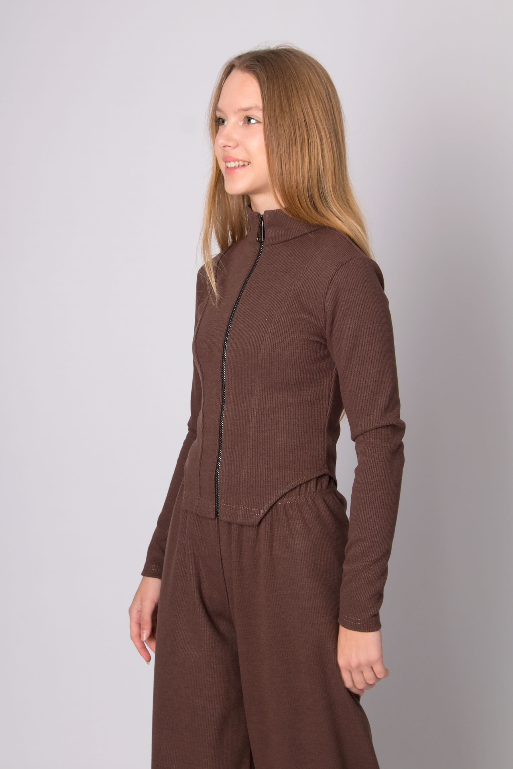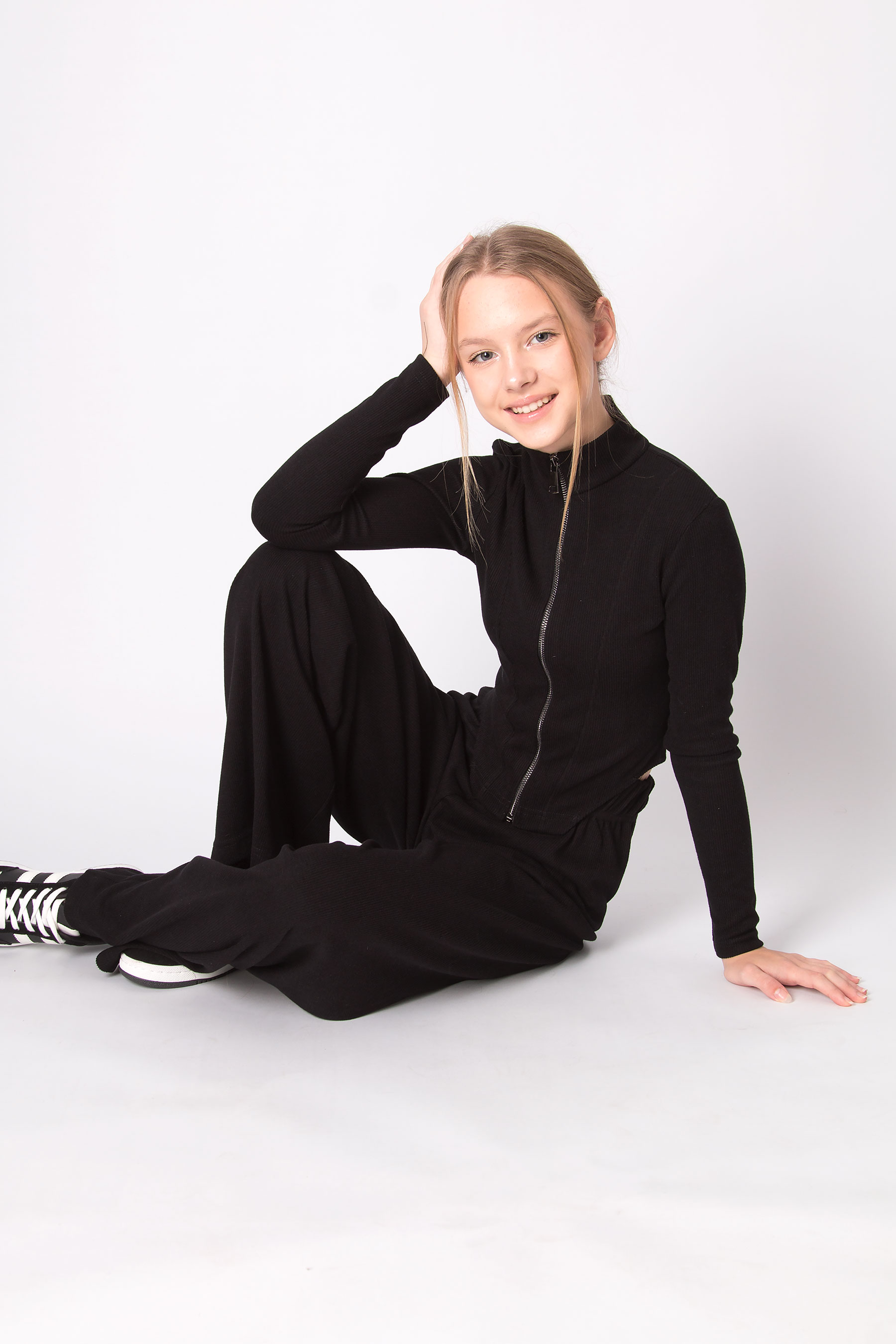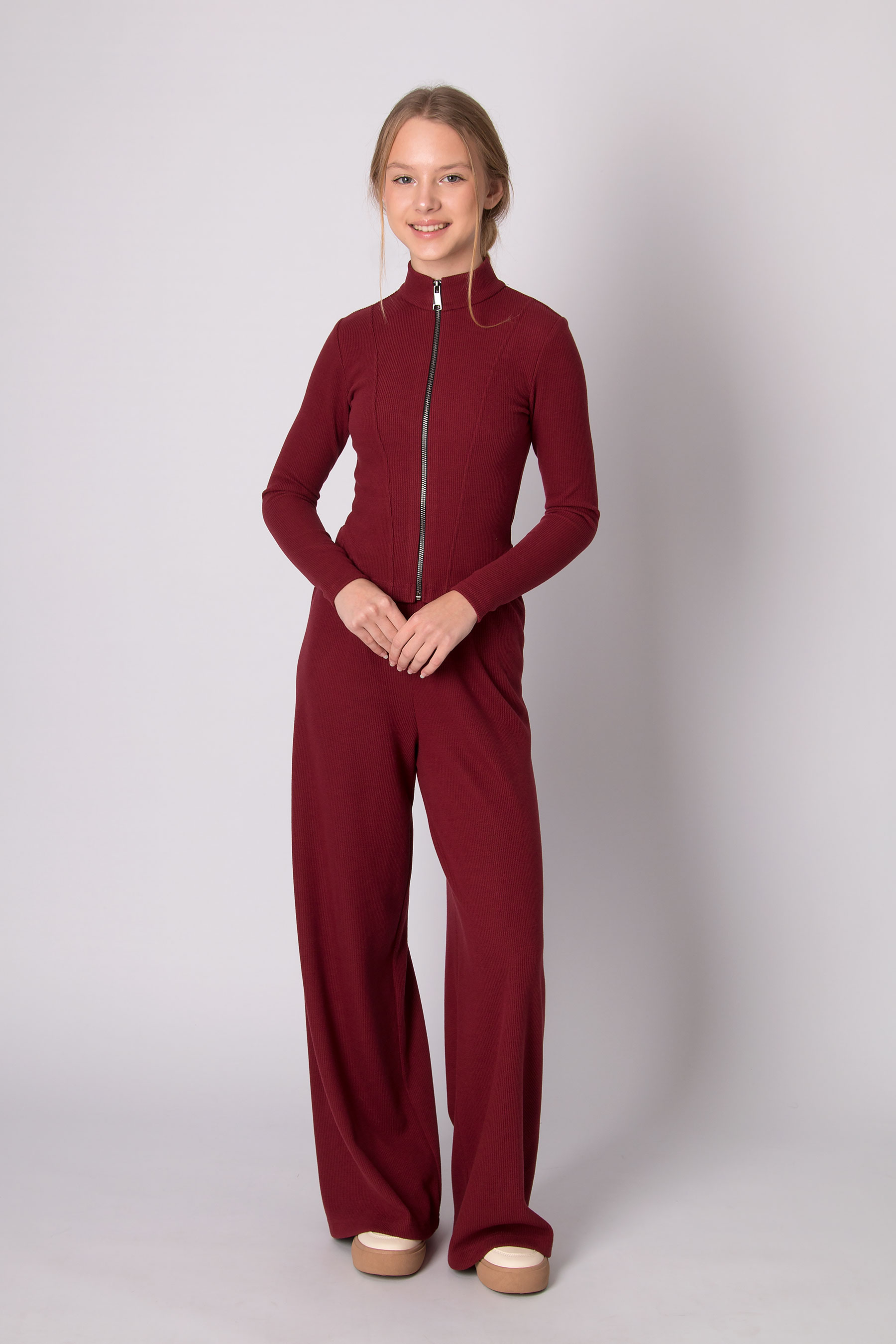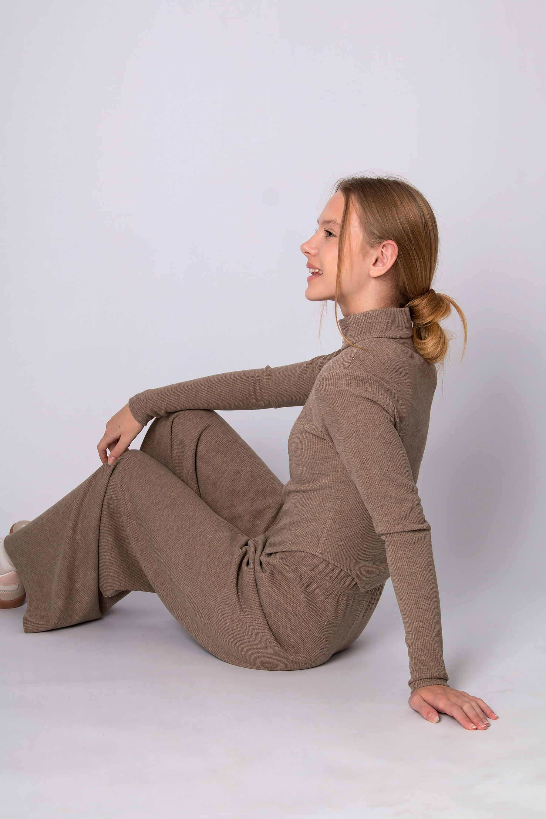 Костюм із щільного трикотажу в рубчик. Кофта приталеного крою на замку з довгим рукавом і високим коміром. Штани прямого крою, середньої посадки, пояс на еластичній резинці.