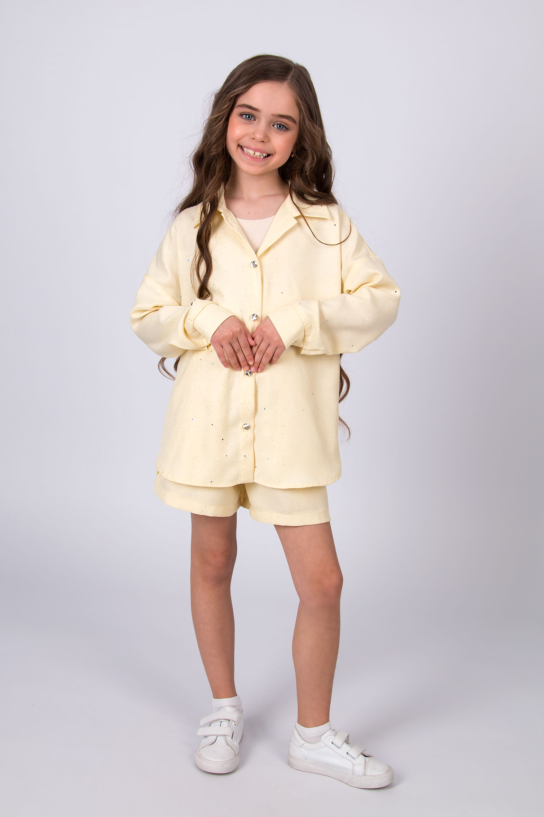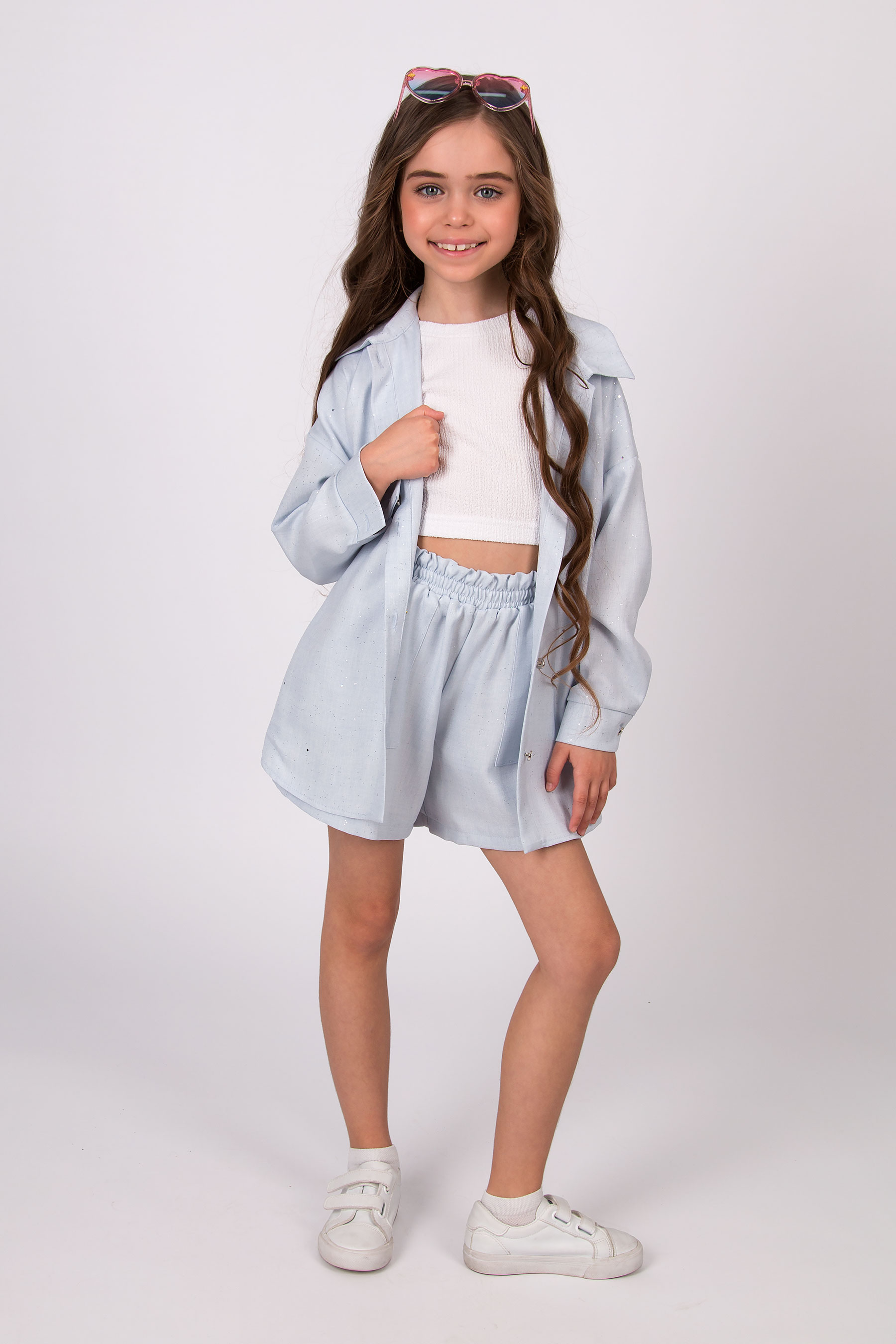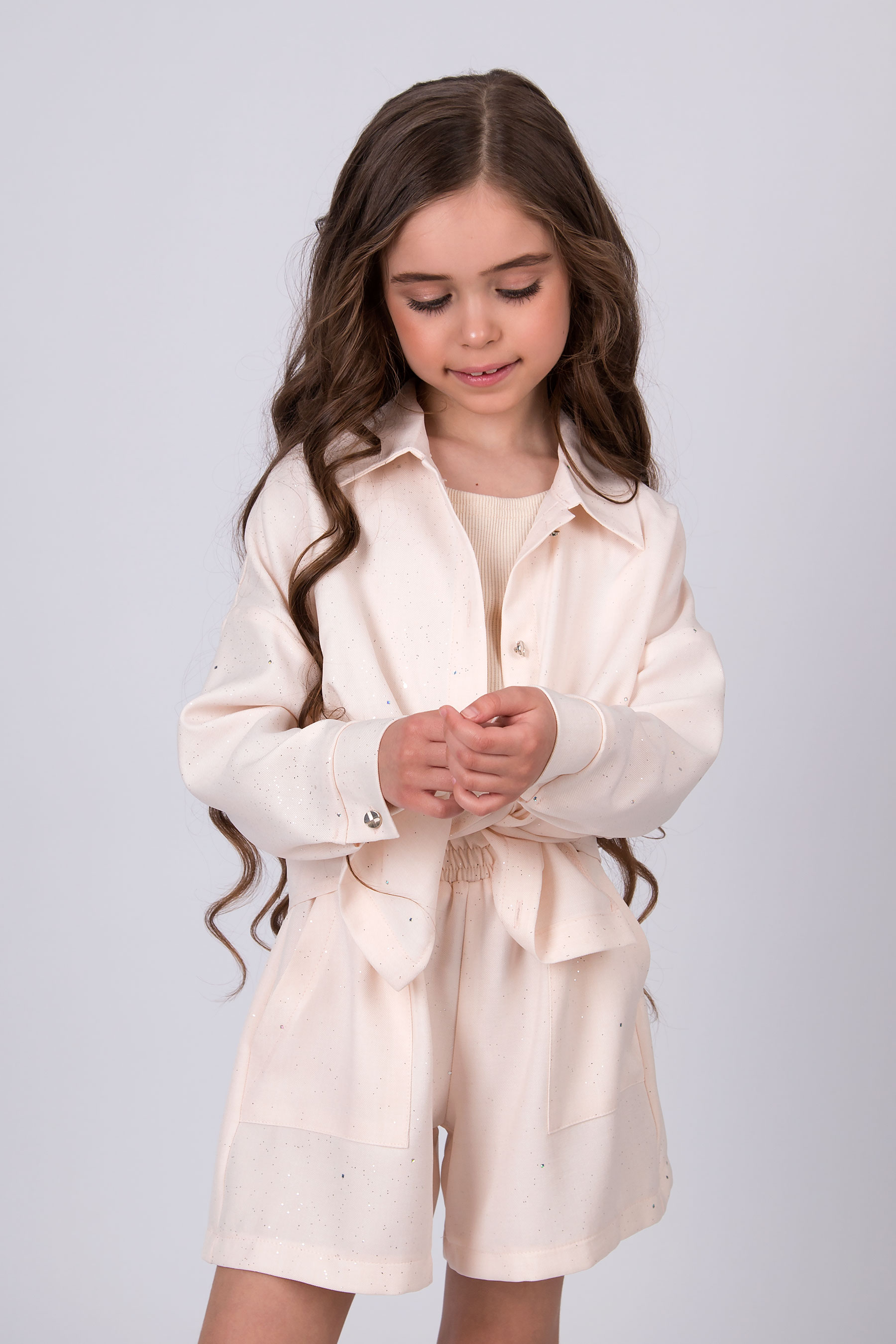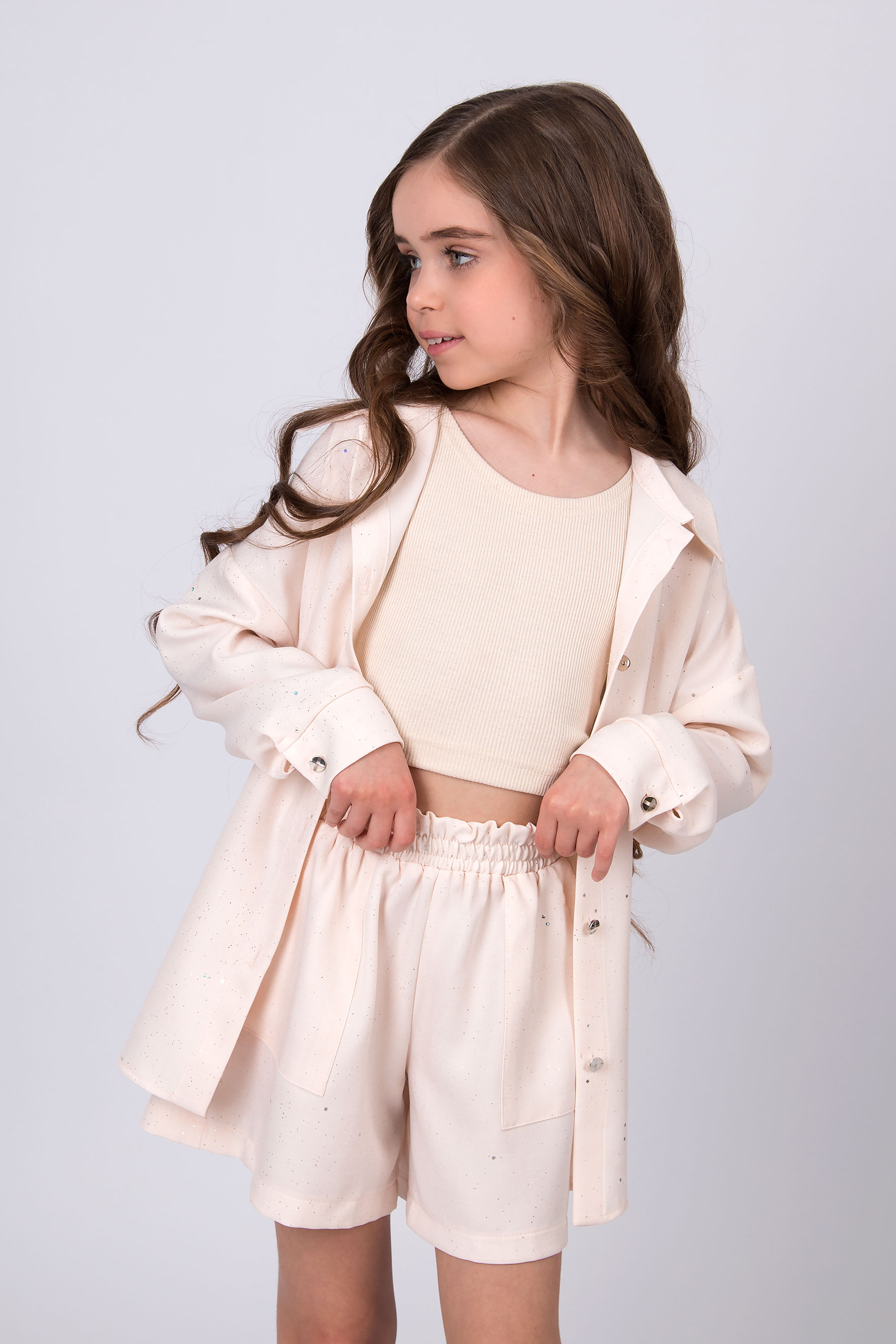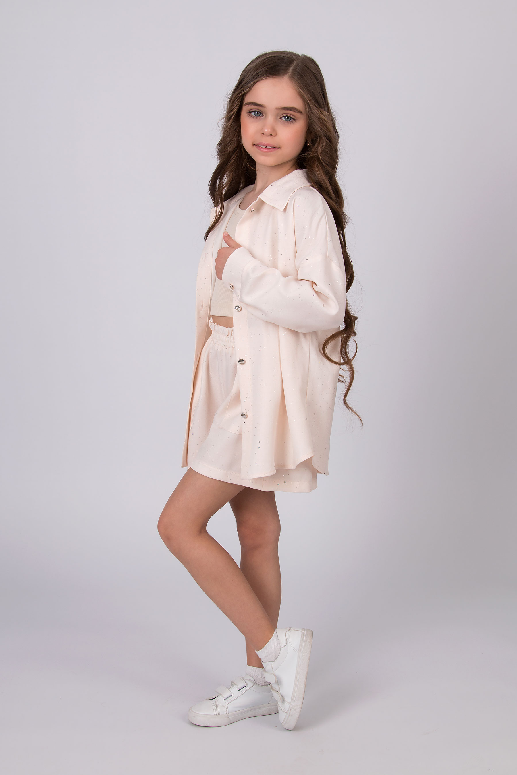 Костюм із штапелю з блискучим напиленням: сорочка вільного крою та шорти. Верх із застібкою на ґудзики, класичним коміром і довгими рукавами. Низ — шорти з м’яким поясом на резинці та кишенями. Матеріал має легку фактуру та невеликий блиск.