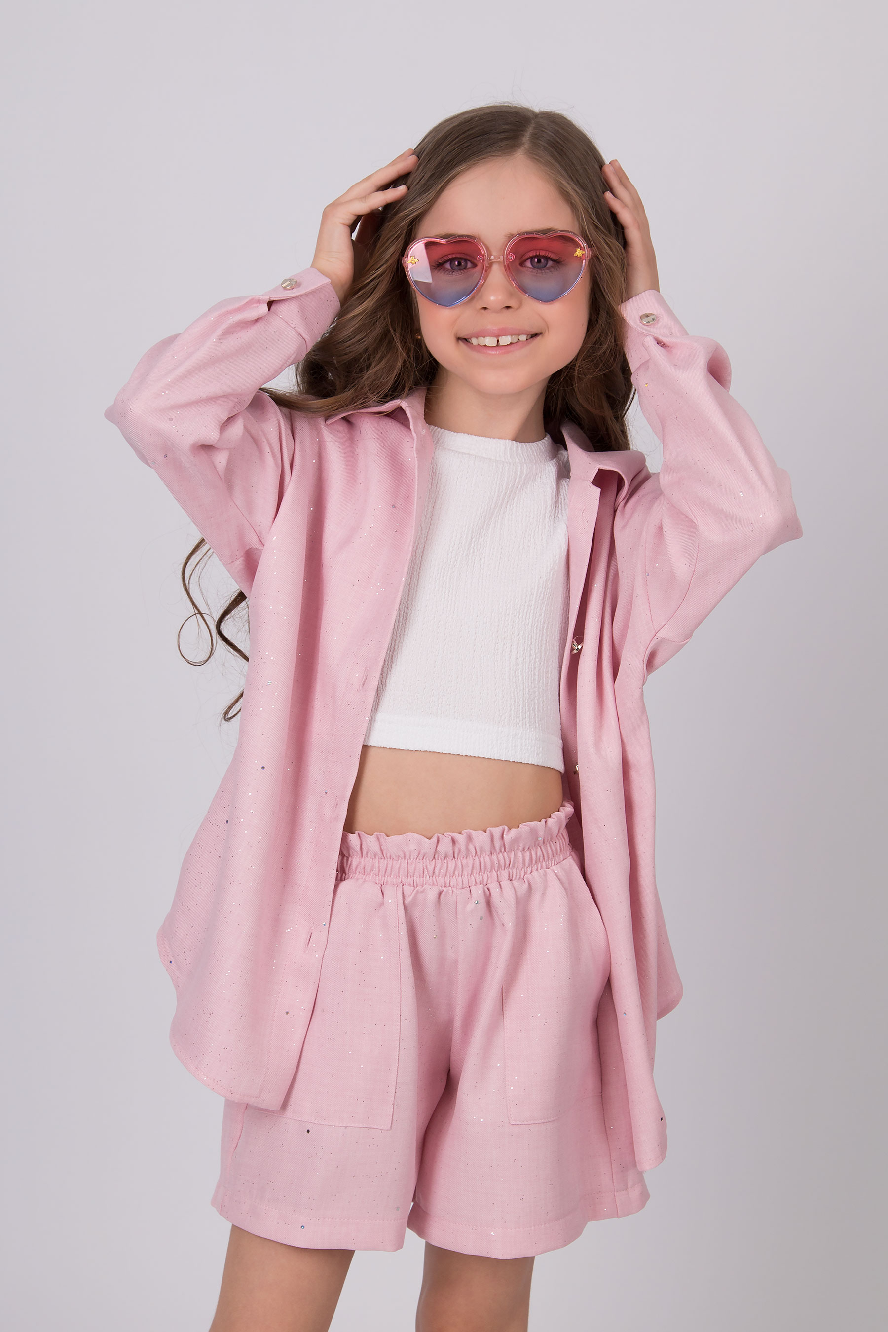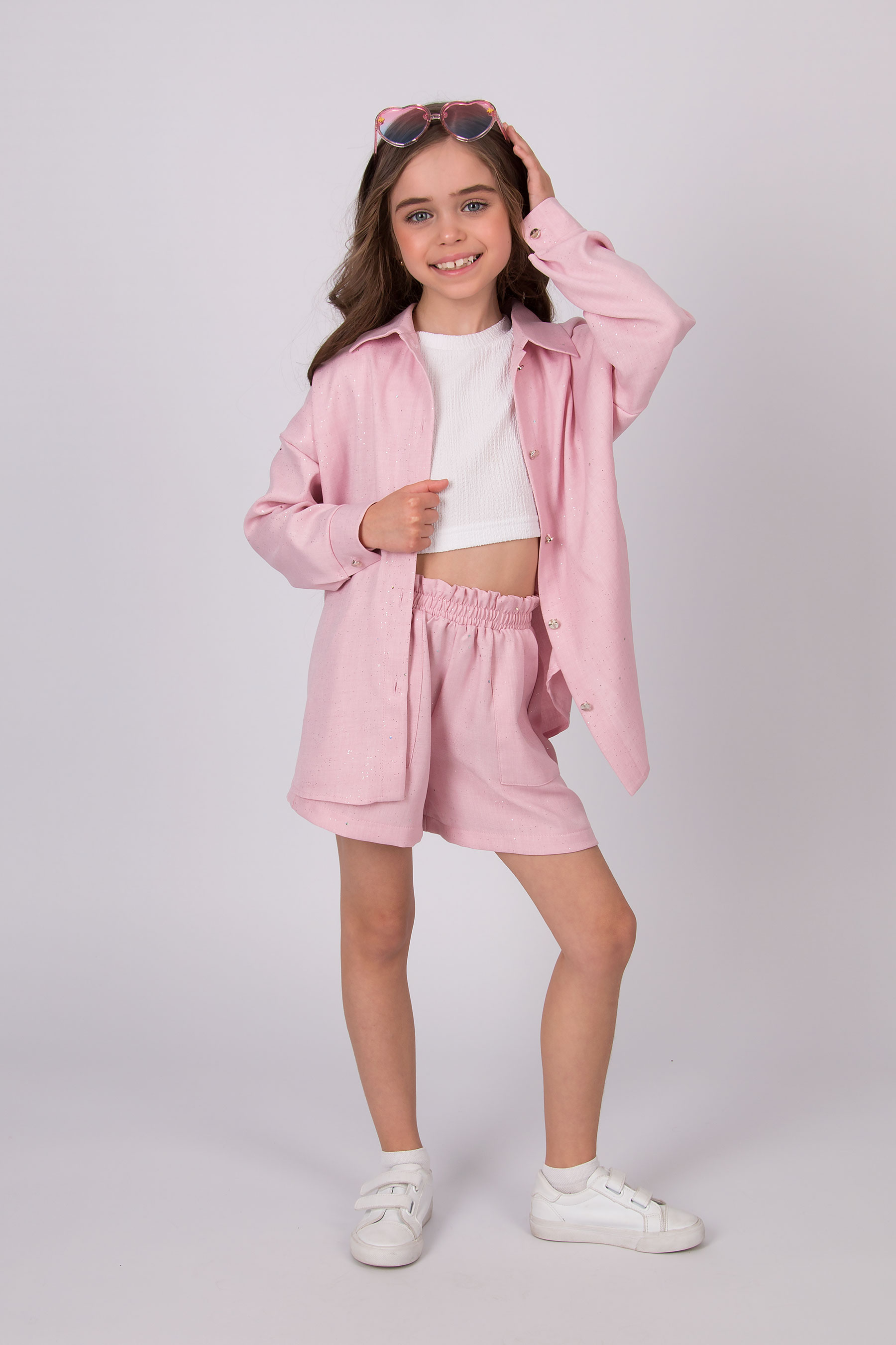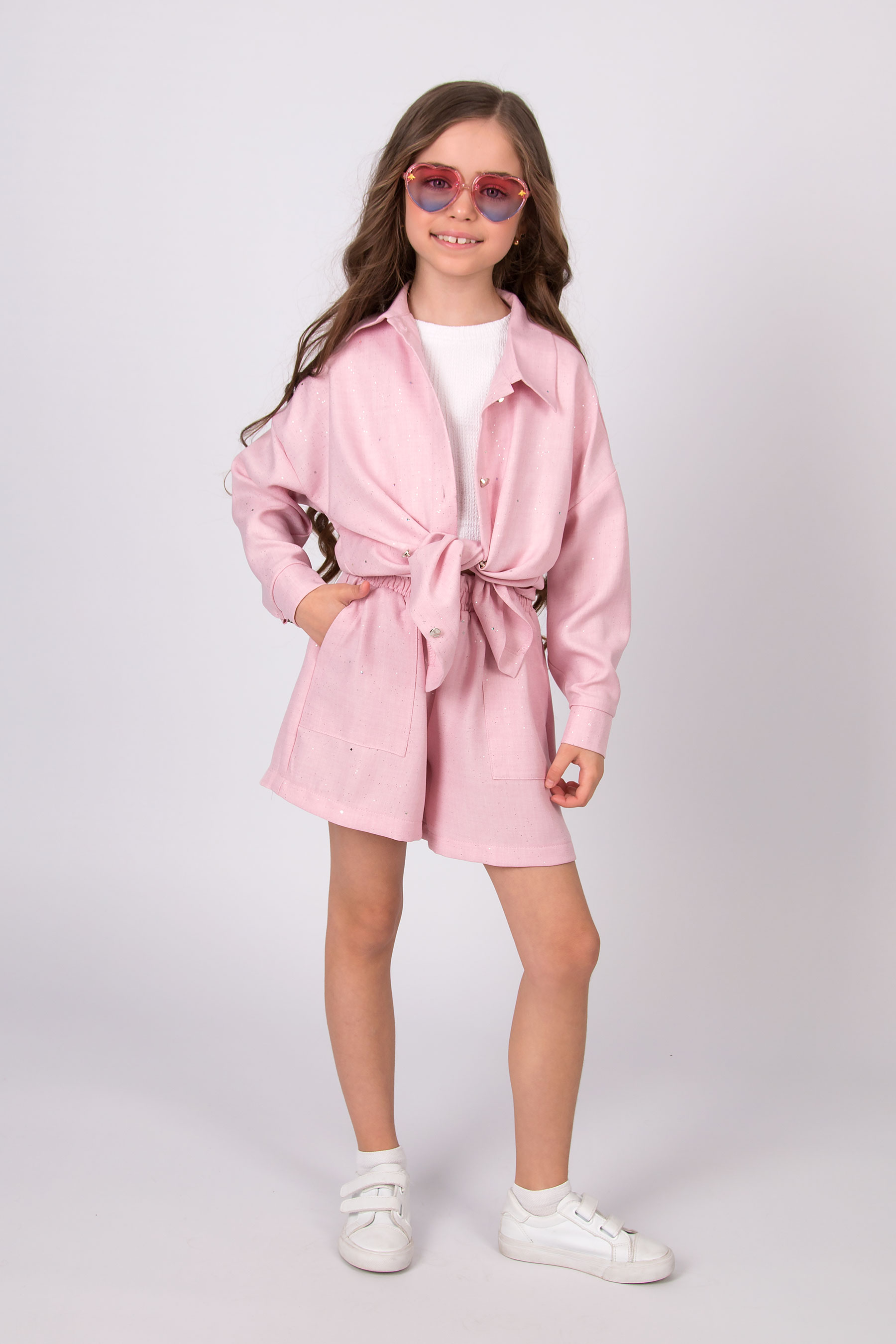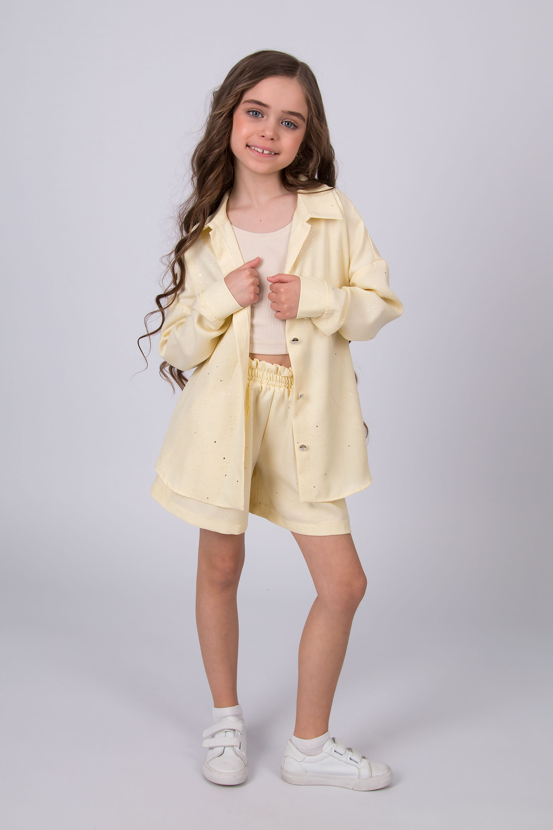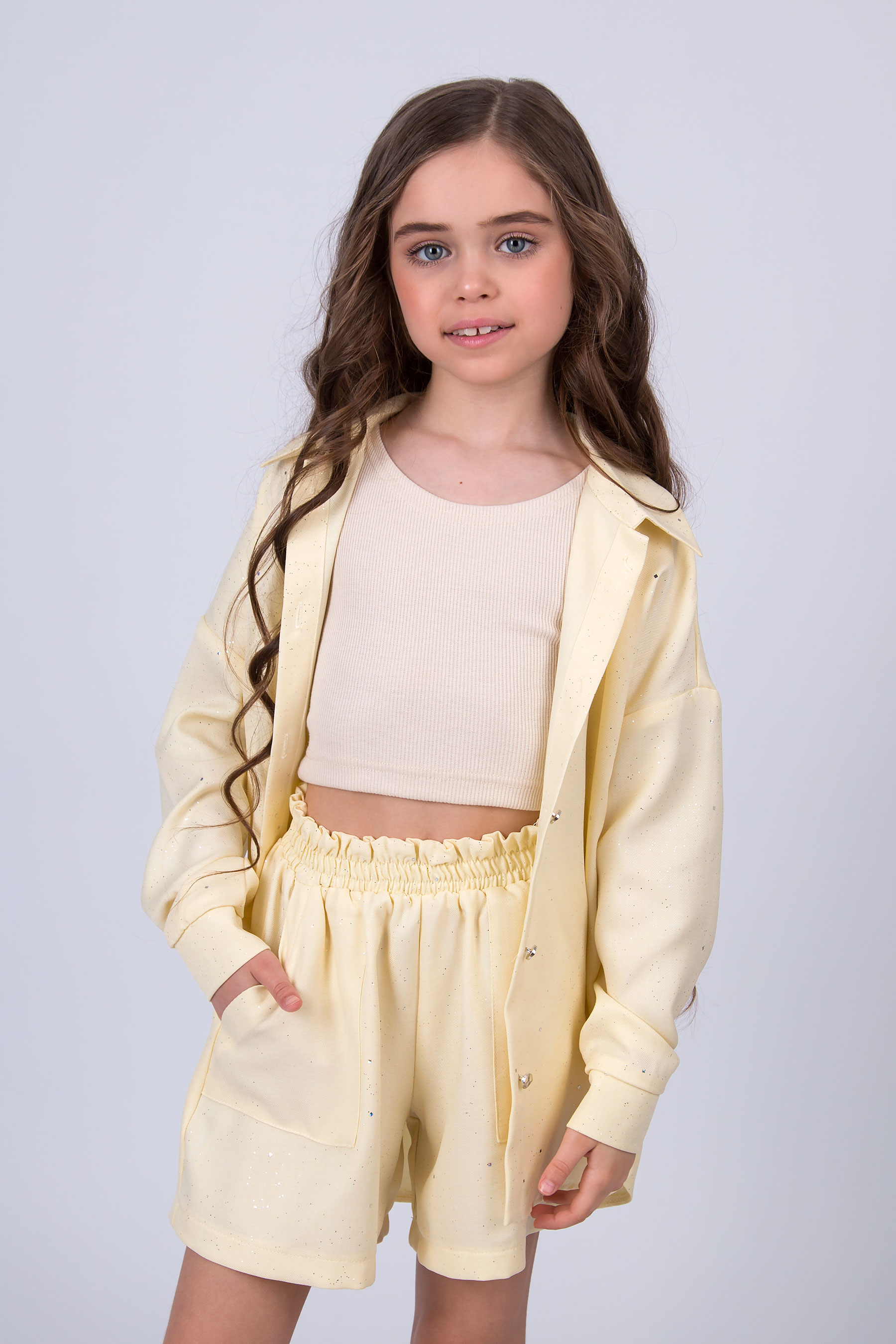 Костюм із штапелю з блискучим напиленням: сорочка вільного крою та шорти. Верх із застібкою на ґудзики, класичним коміром і довгими рукавами. Низ — шорти з м’яким поясом на резинці та кишенями. Матеріал має легку фактуру та невеликий блиск.