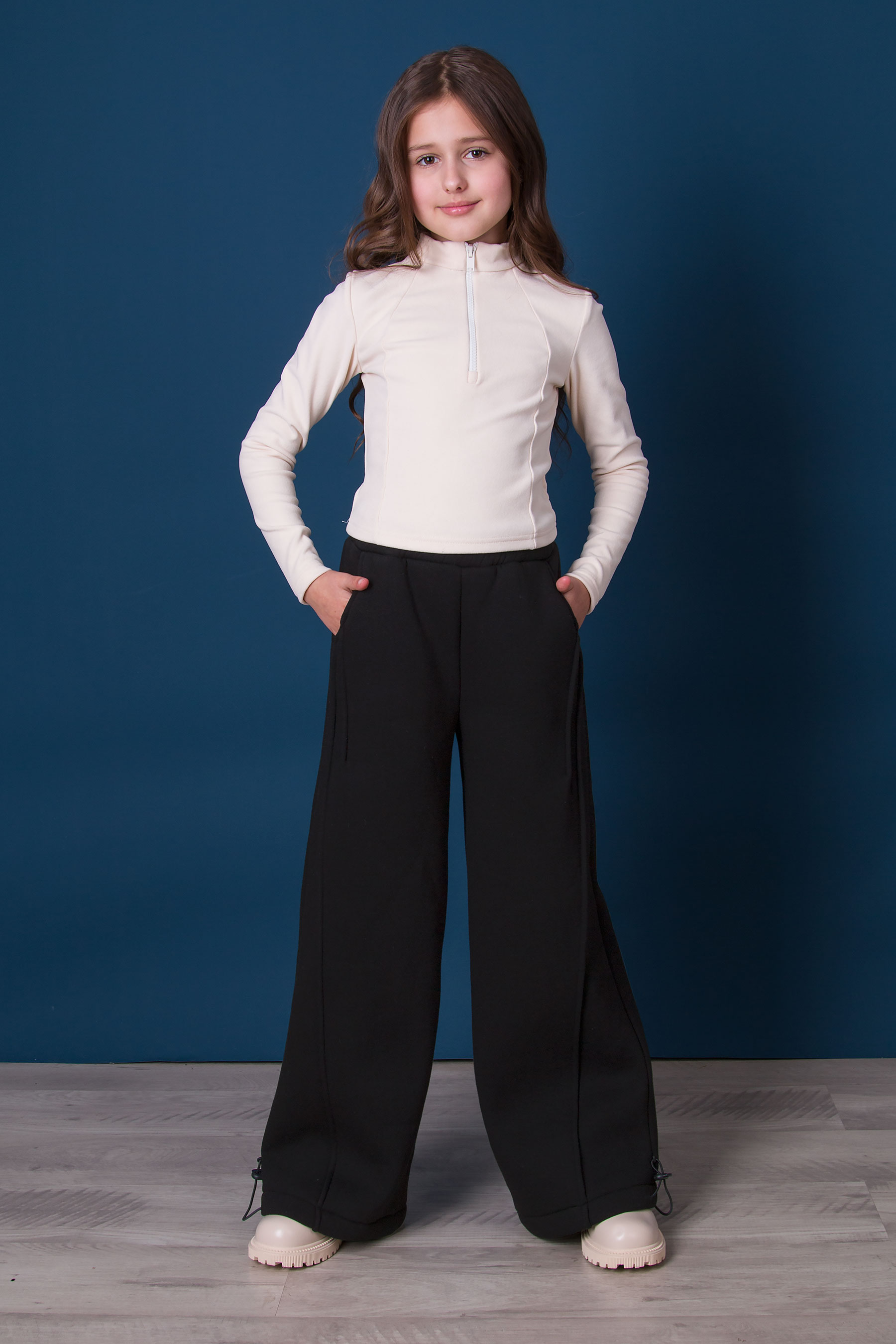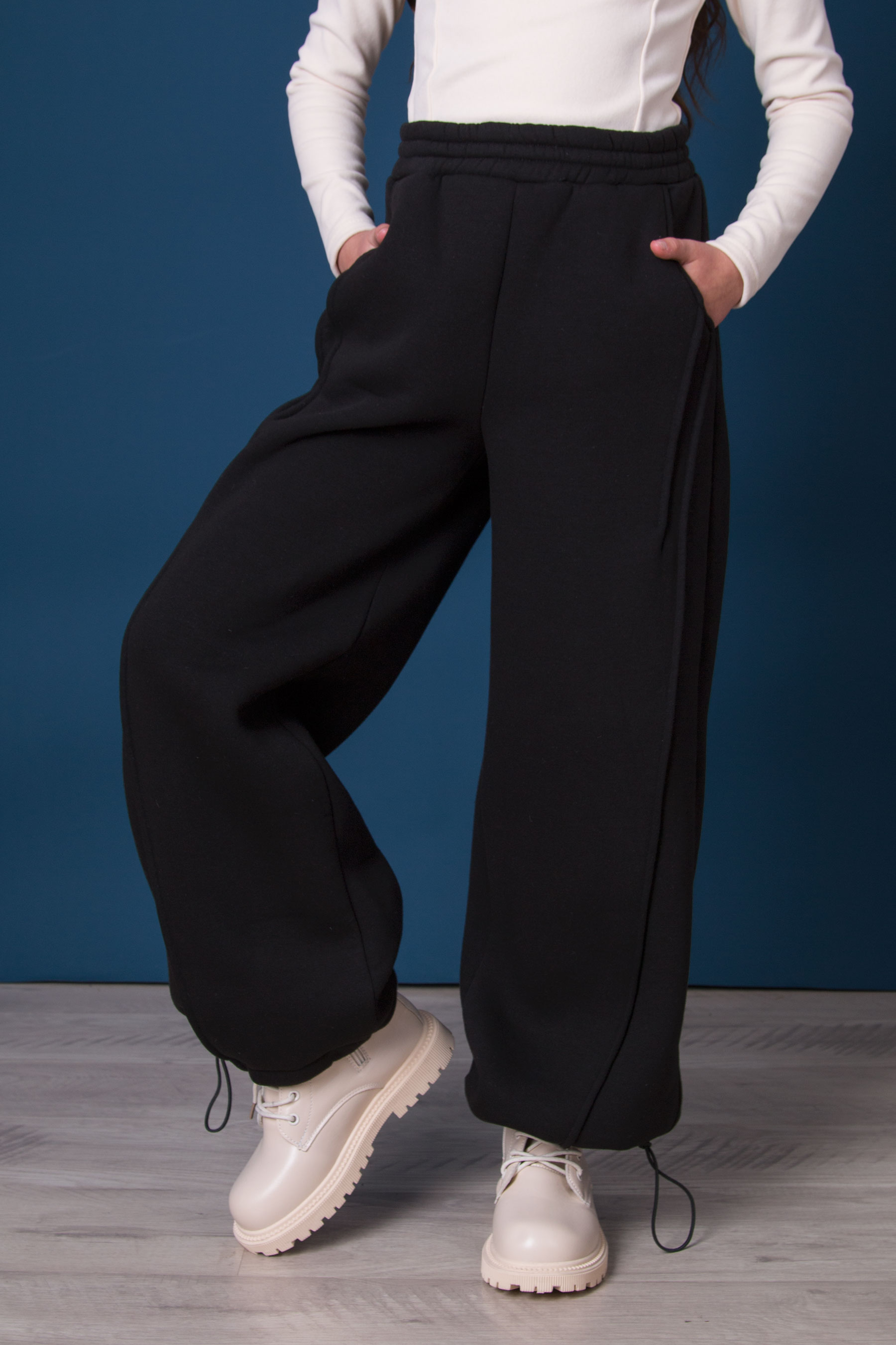 Трикотажні штани з широким вільним кроєм. Пояс на резинці, зручні кишені та шнурки знизу для регулювання довжини.