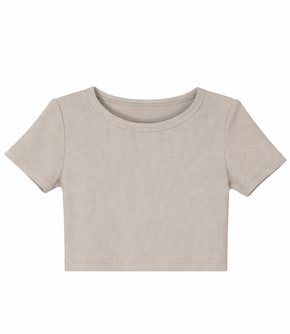 Укорочений кроп-топ з фактурного трикотажу рубчик. Базовий фасон дозволяє комбінувати модель з різним одягом — від повсякденного до спортивного стилю.