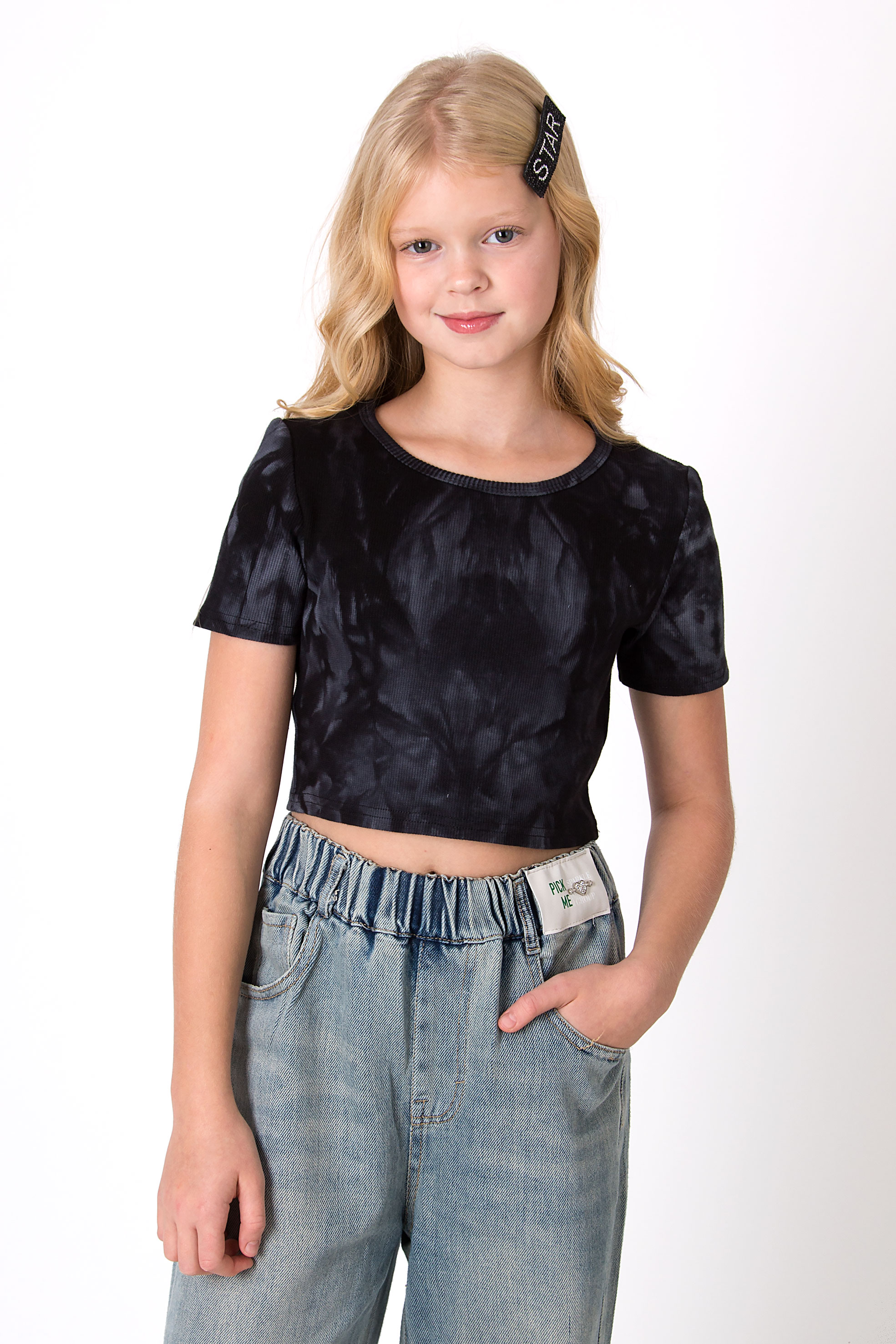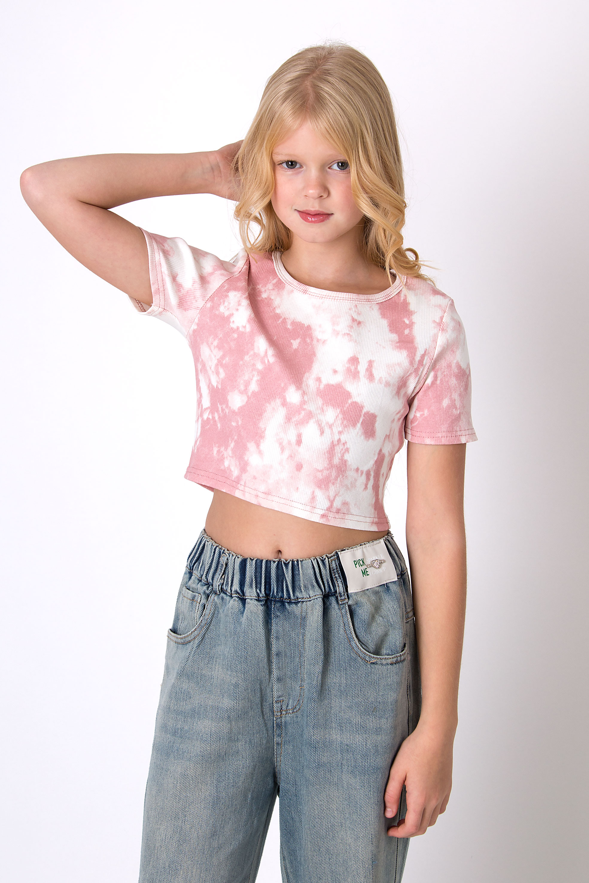 Укорочений топ з трикотажу рубчик з ефектом тай-дай. Модель з короткими рукавами, круглою горловиною . Добре поєднується з джинсами, шортами та спідницями.