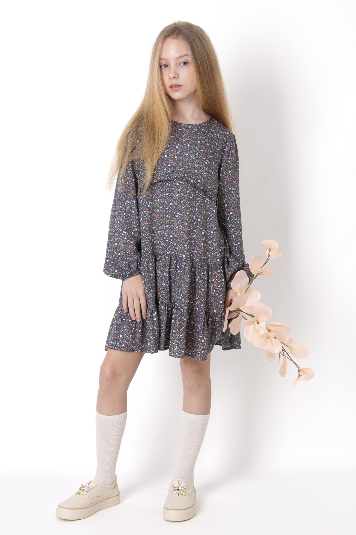 Cукня з тканини штапель. Кругла горловина. Довгий рукав. Манжети по низу рукавів. Зборка по лінії талії. Розширений низ. Квітковий принт. Довжина вище коліна.