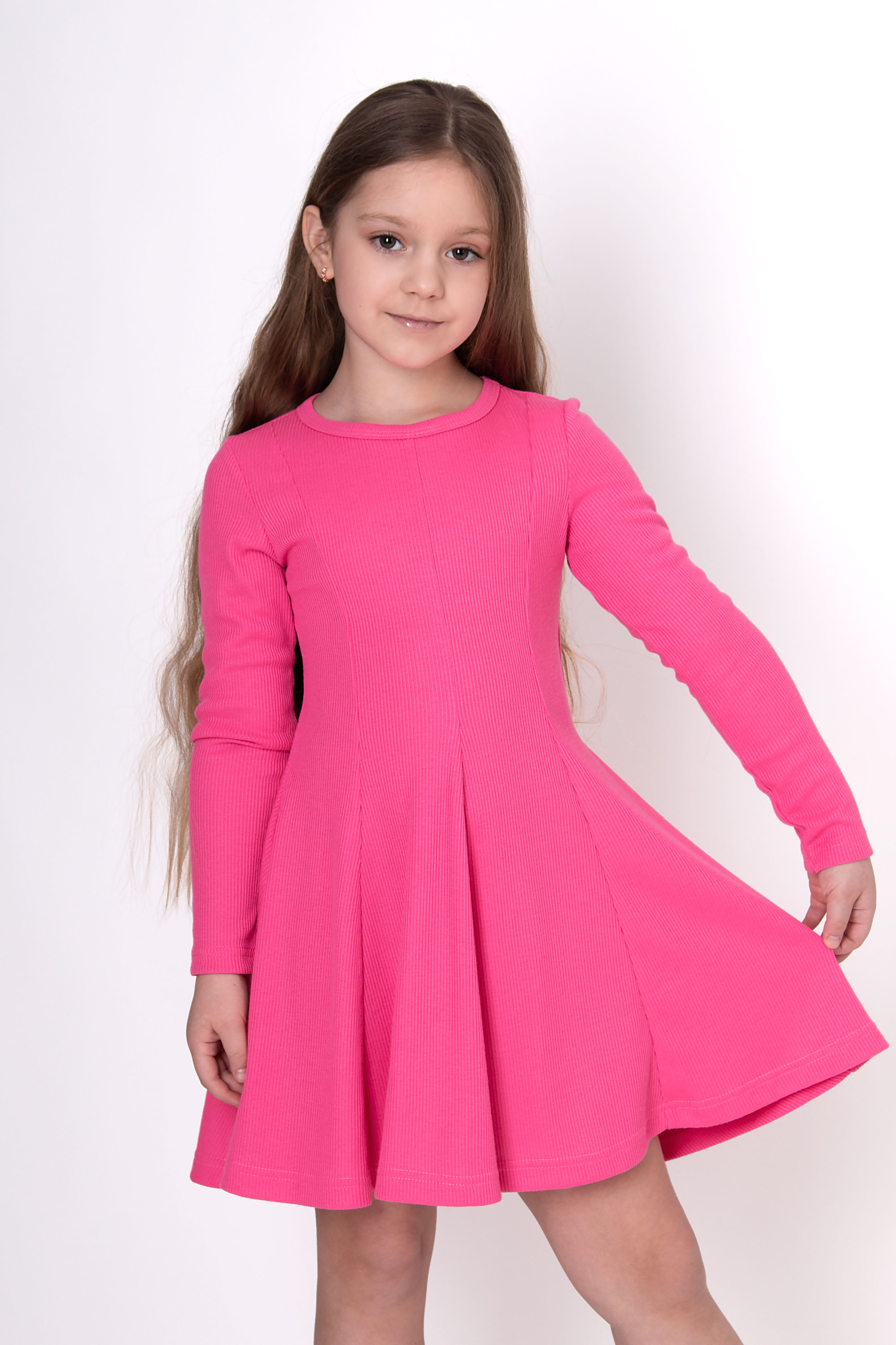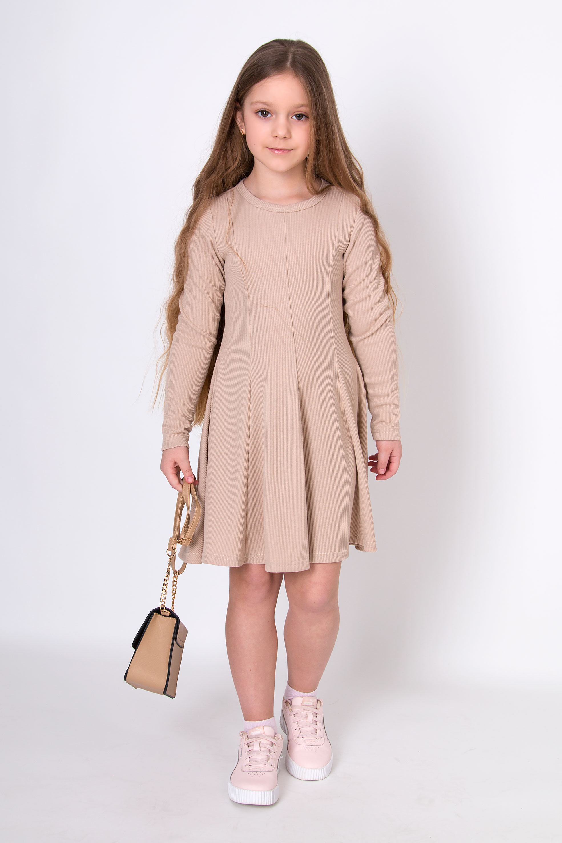 Сукня з трикотажу в рубчик в бежевому кольорі виглядає стримано й акуратно. Довгі рукави та округла горловина створюють зручний силует. Вертикальні шви спереду створюють цікавий силует. Підійде як для повсякденного використання, так і для більш зібраних образів.