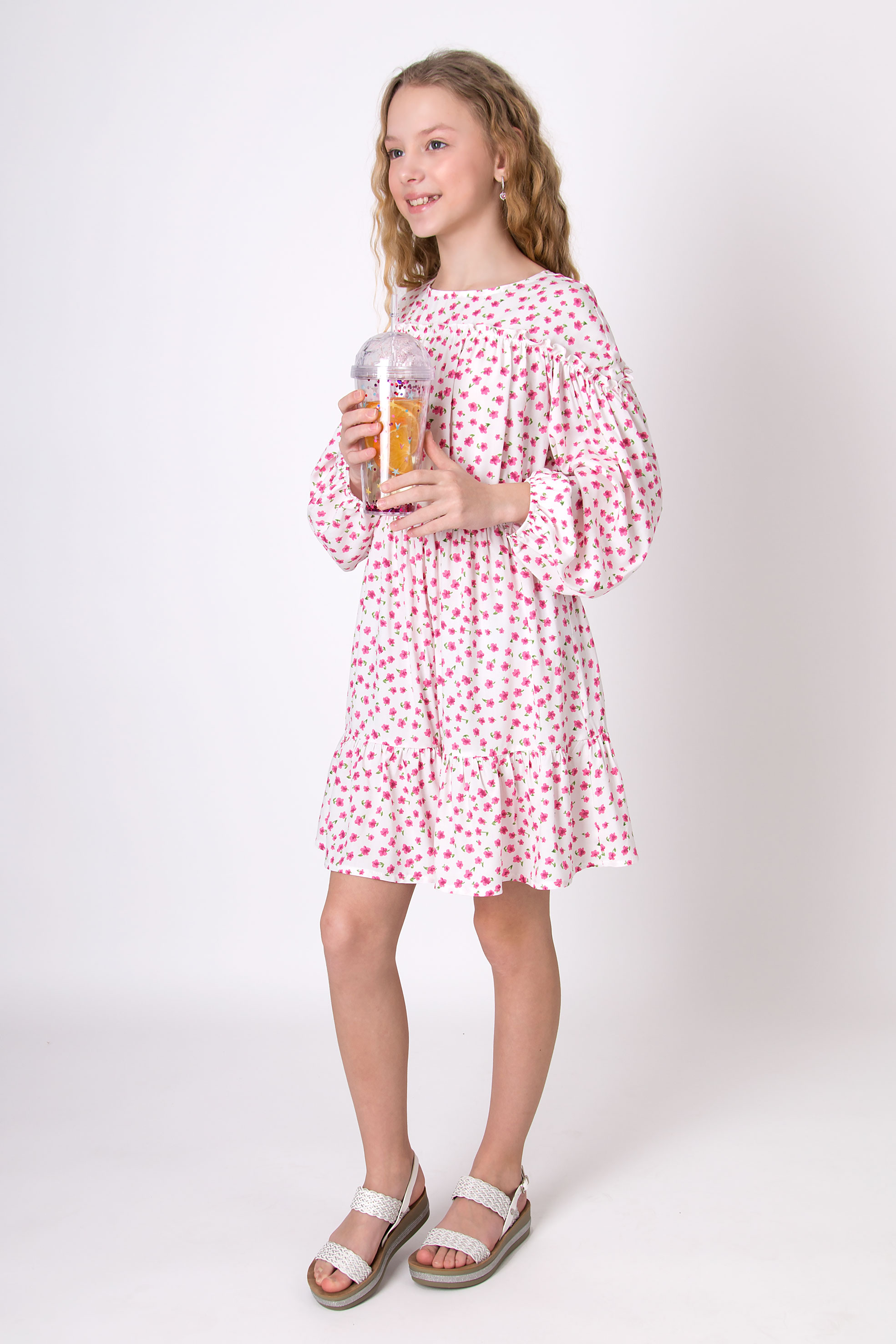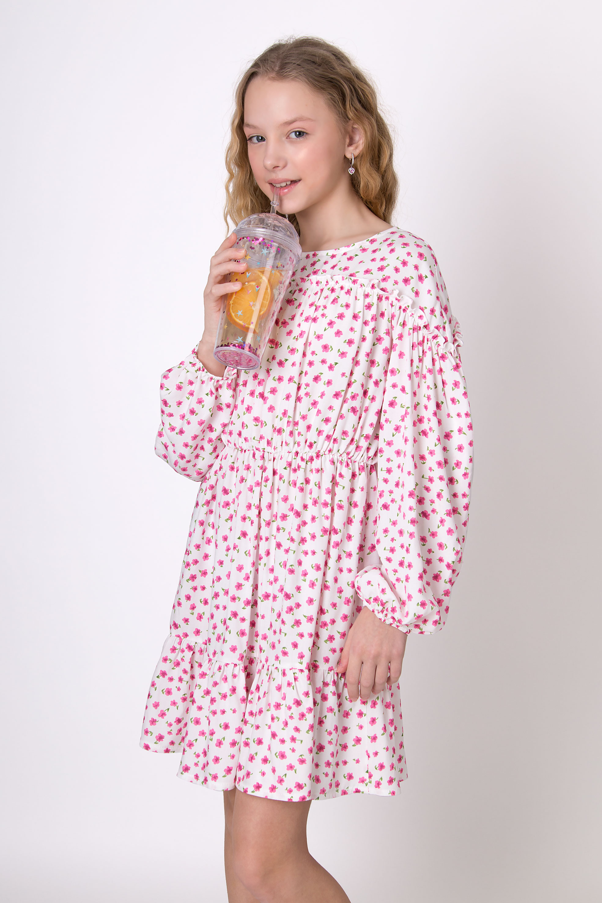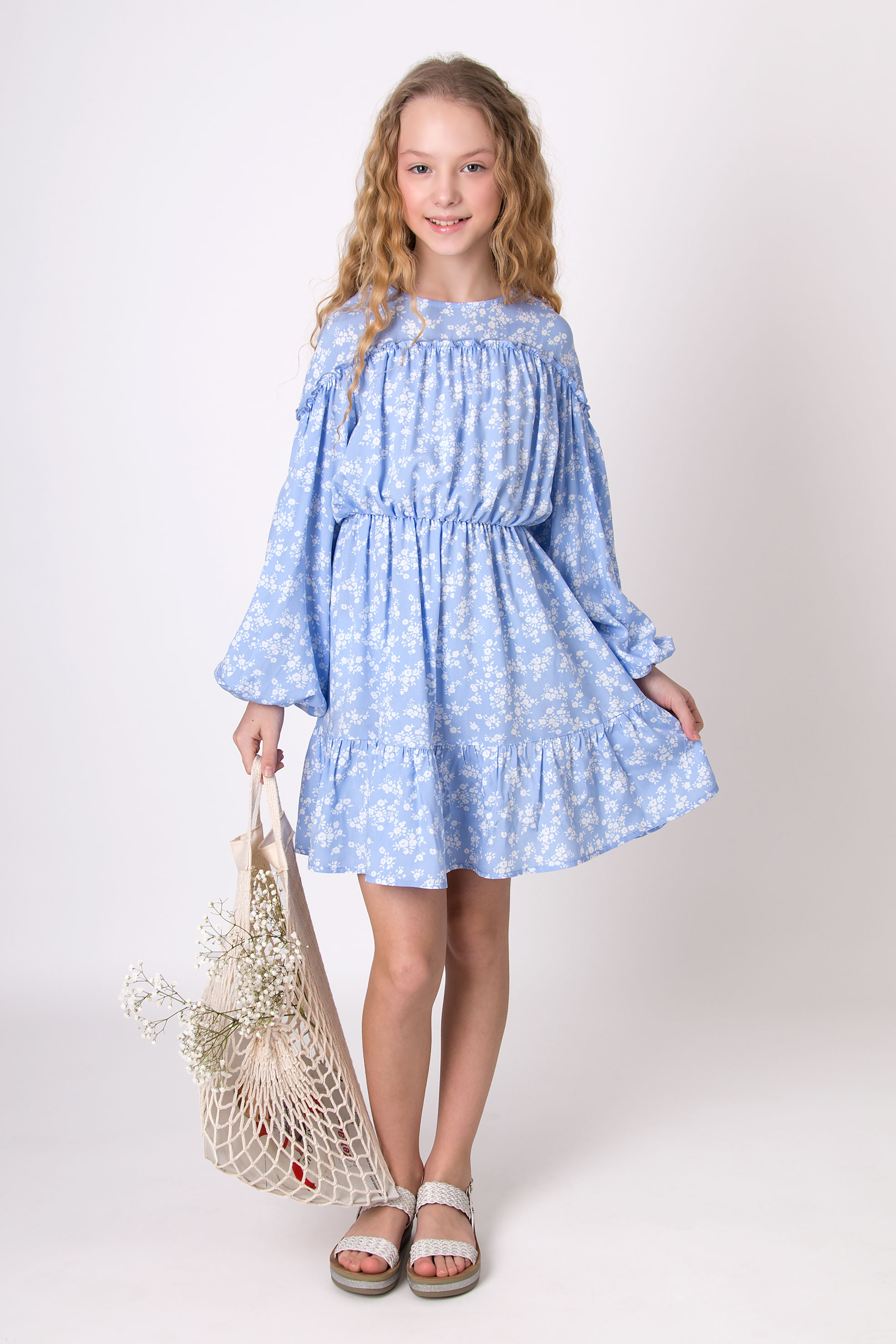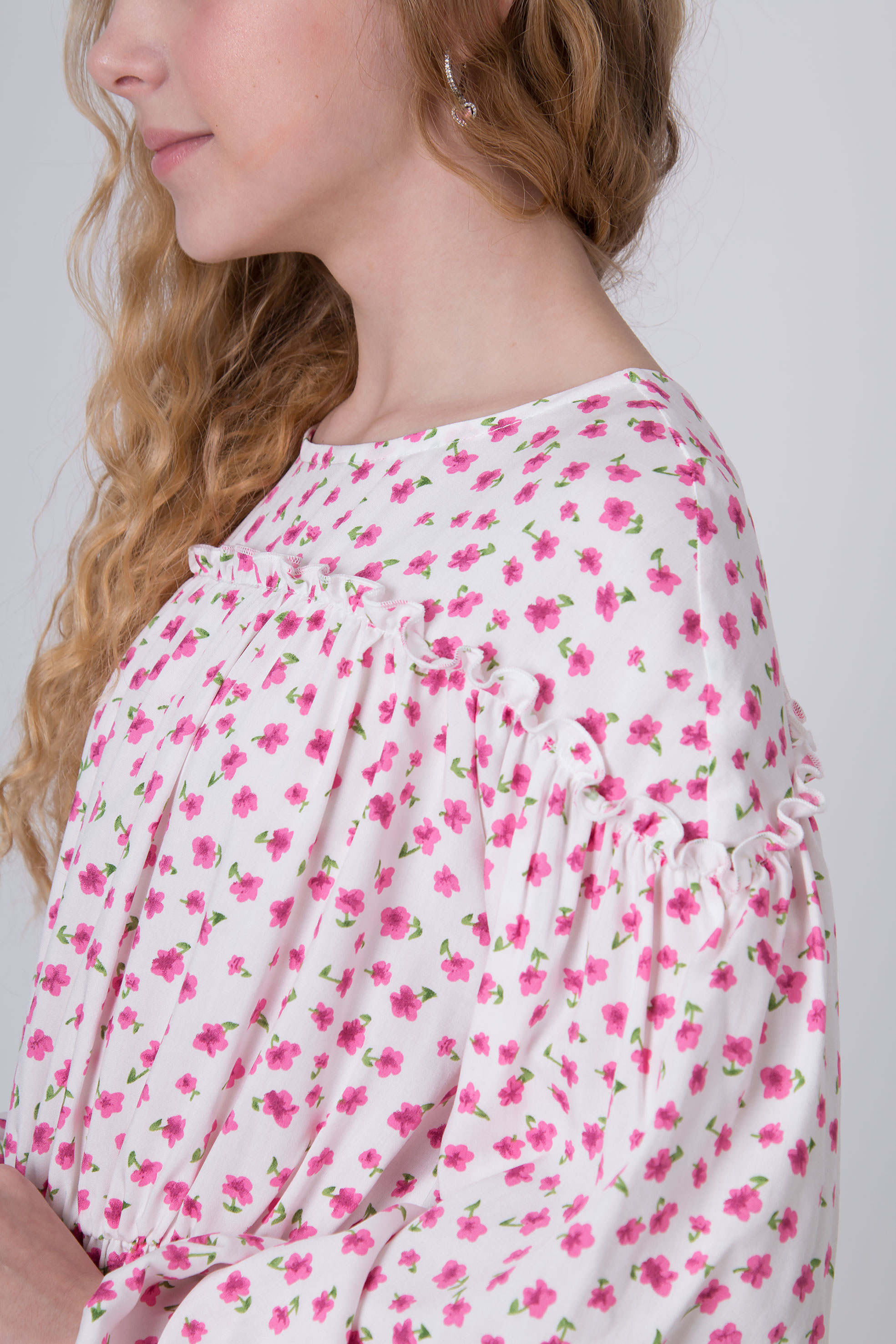Сукня з тканини штапель. Квітковий принт. Округла горловина. Довгий рукав. Манжети по низу рукавів. Зборка по талії. Ярусний низ. Довжина вище коліна.