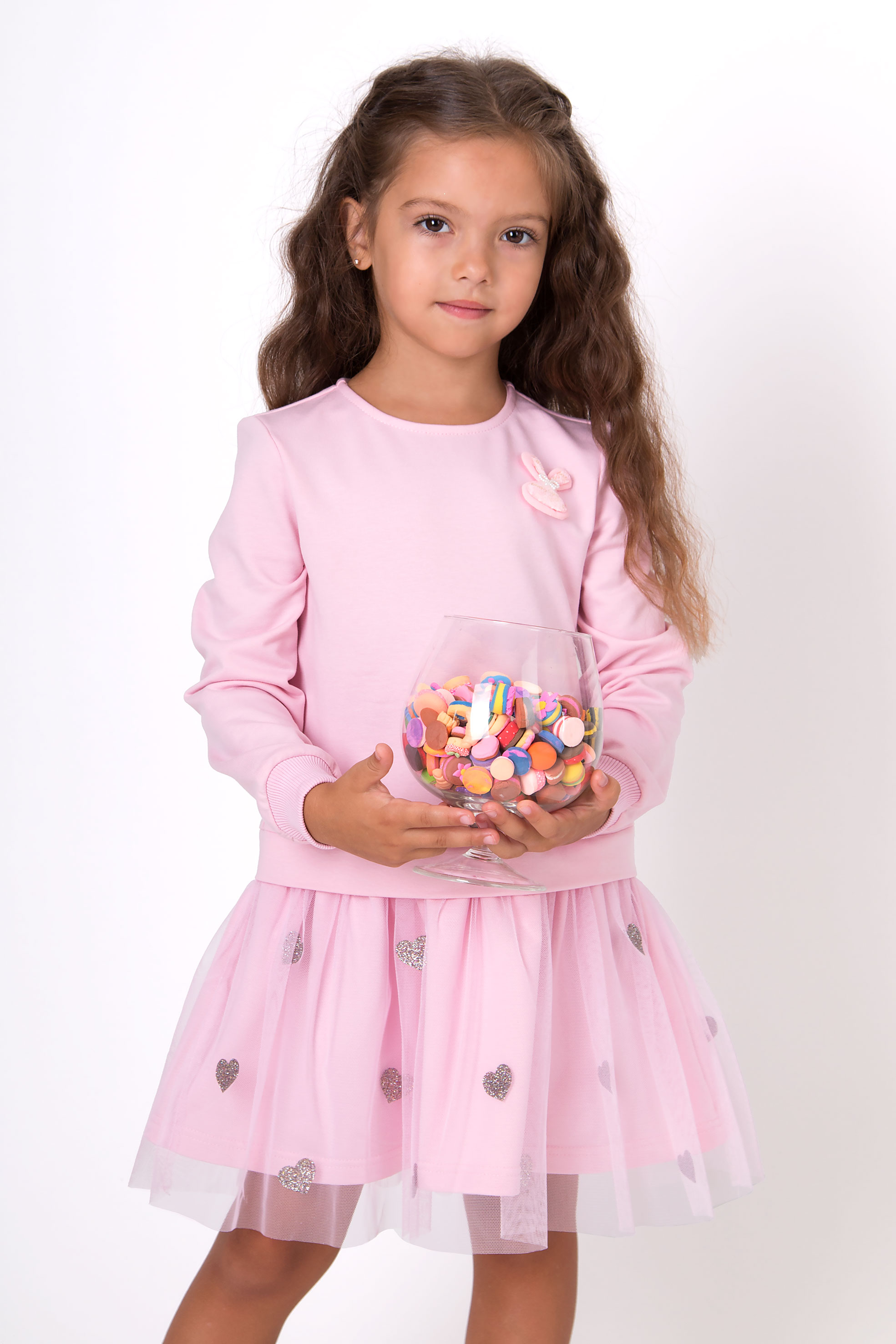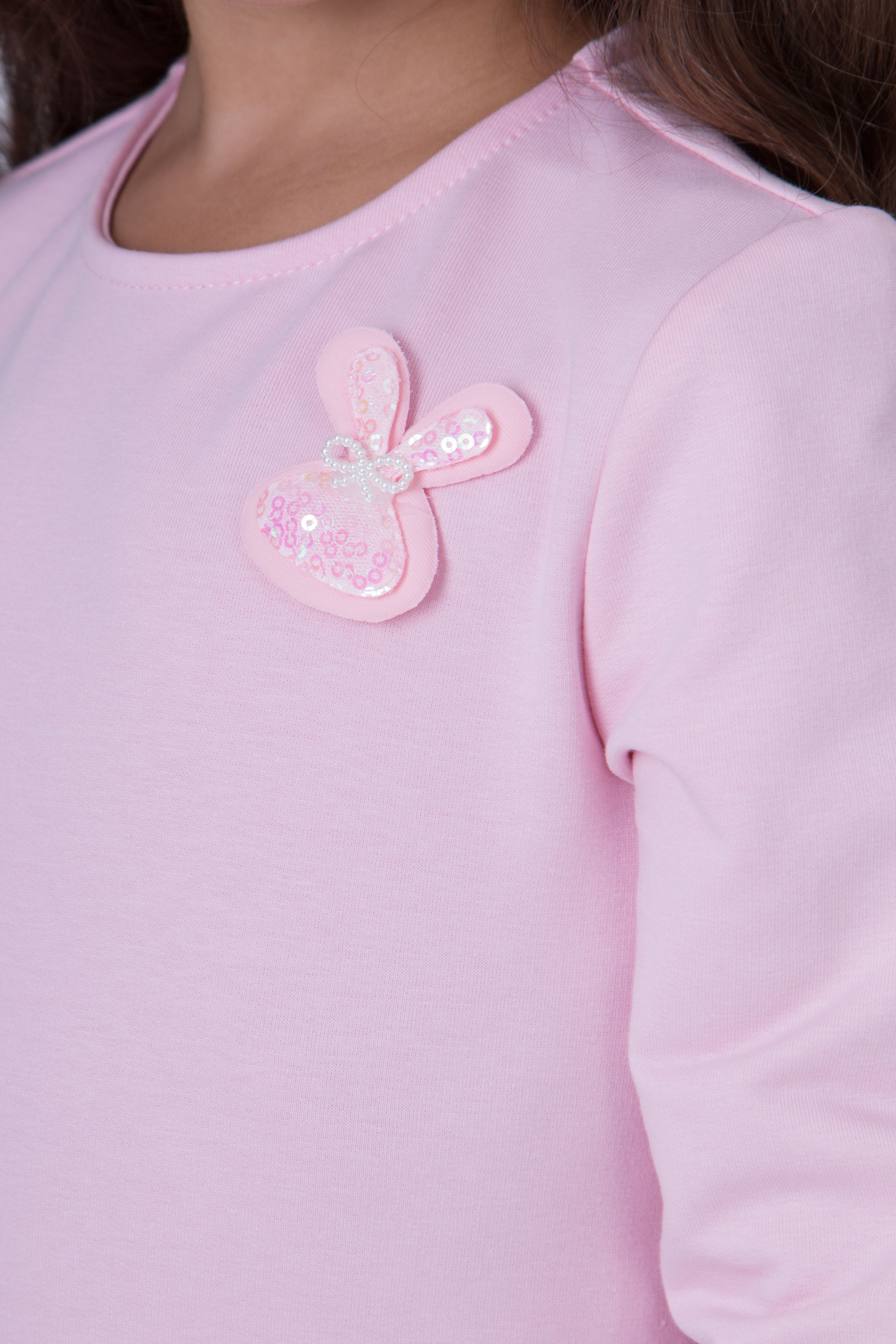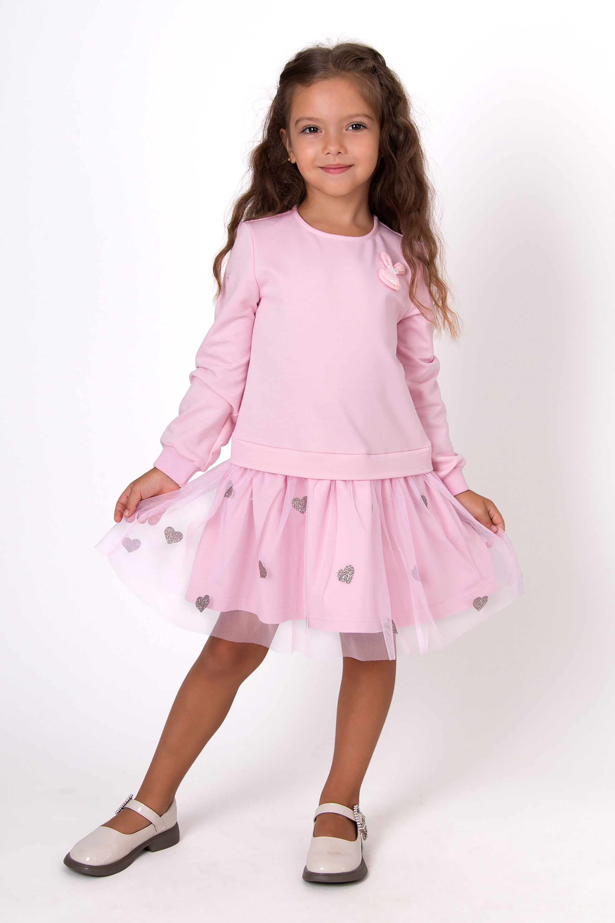 Сукня з двонитки з сіткою. Верх виконаний у вигляді світшота з довгим рукавом на манжеті, декоративна нашивка зайчика. Спідничка з прозорої фатинової сітки прикрашена блискучими сердечками. Підходить як для свята, так і для повсякденних образів.