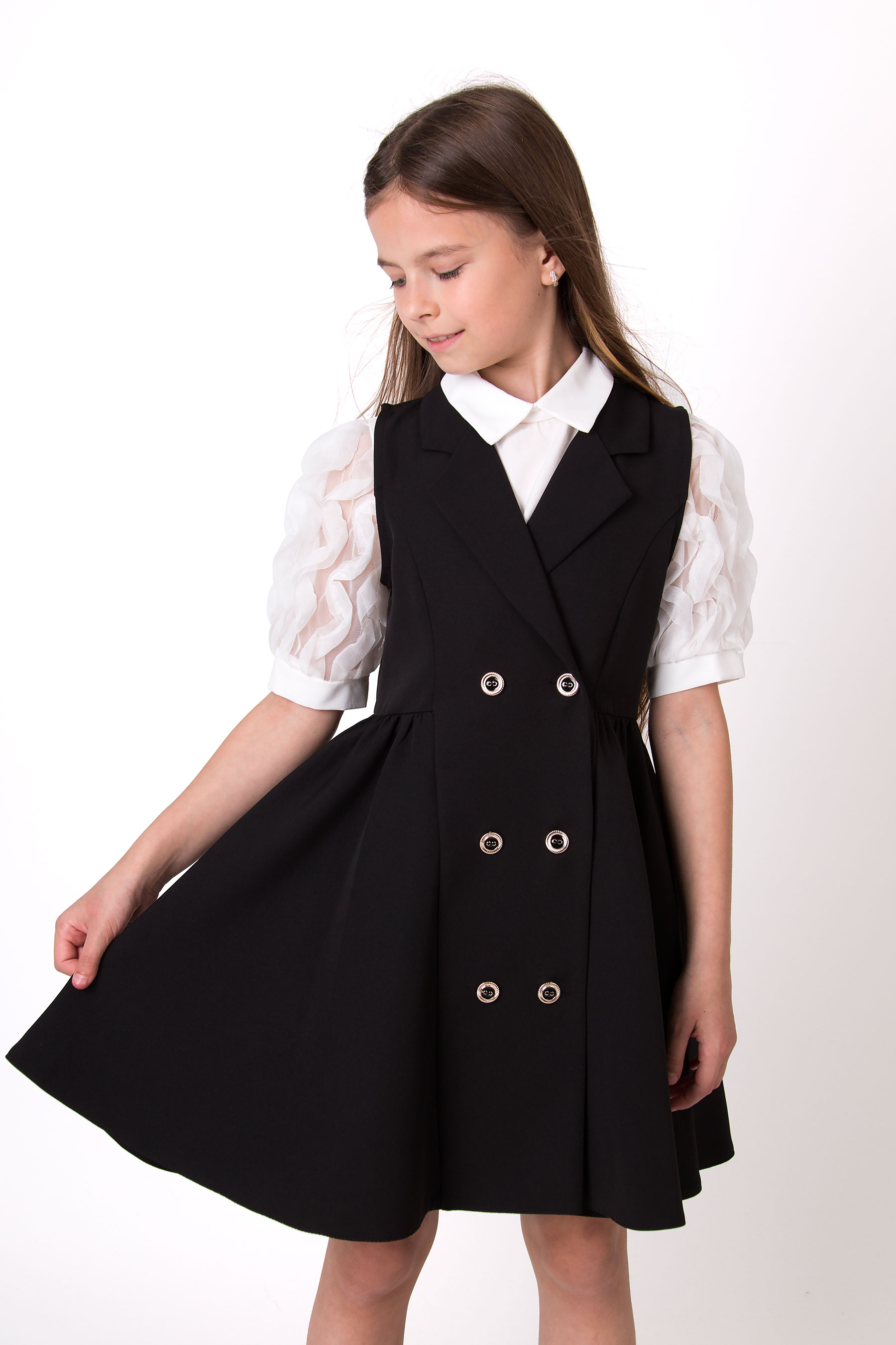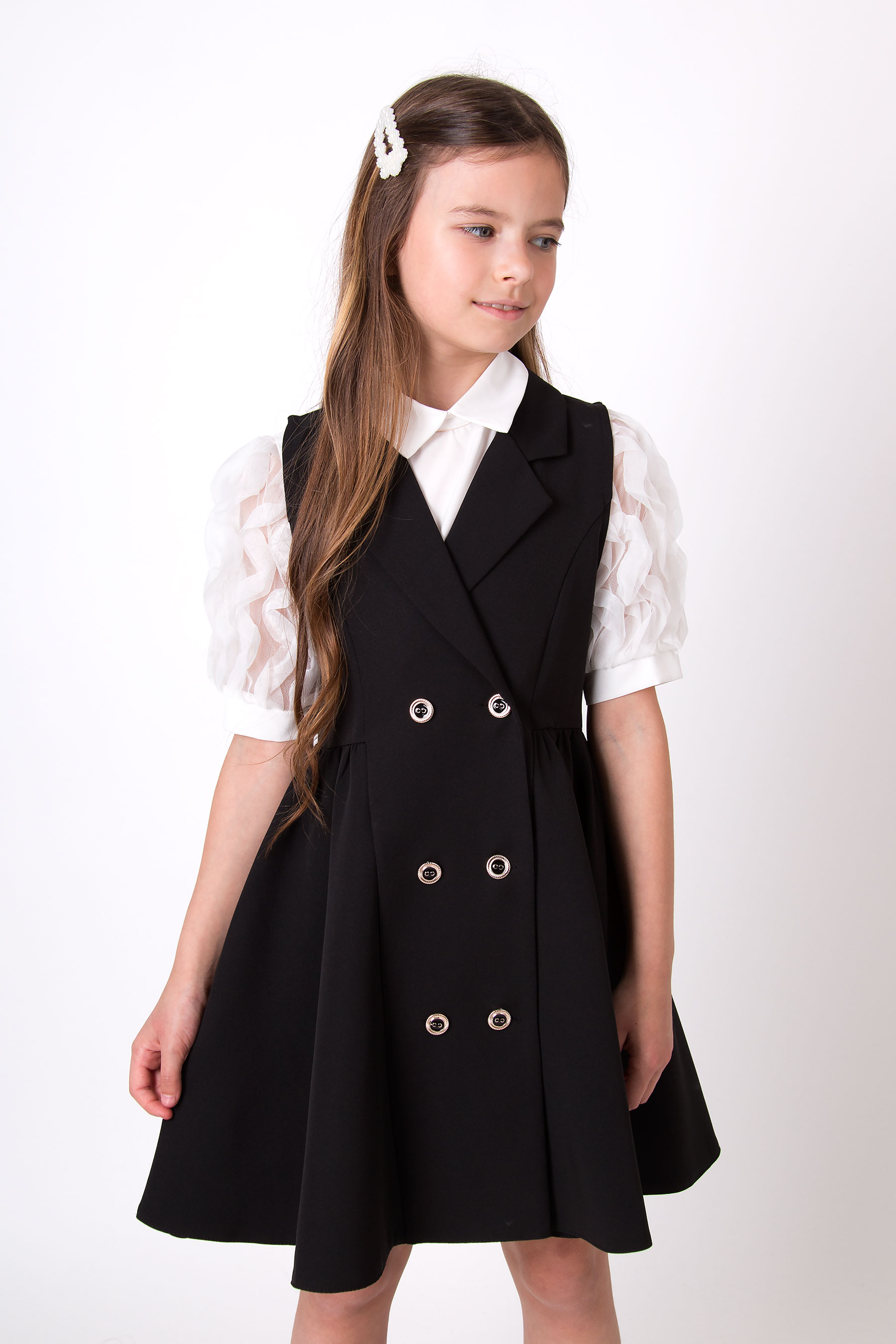 Сарафан для дівчинки у класичному стилі. Модель має двобортний крій з декоративними ґудзиками та акуратний V-подібний виріз.