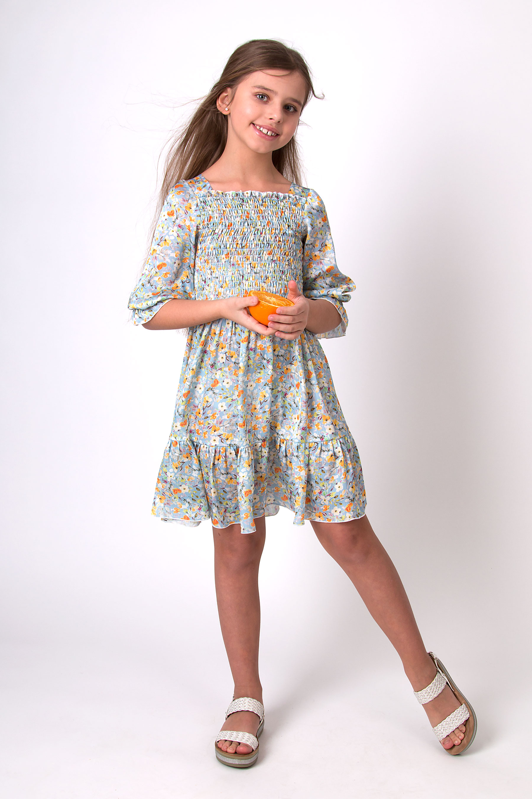 Сукня з легкого штучного шовку з ніжним квітковим принтом. Еластичний верх зі зборкою забезпечує зручну посадку, а спідниця з рюшею додає легкості образу.
