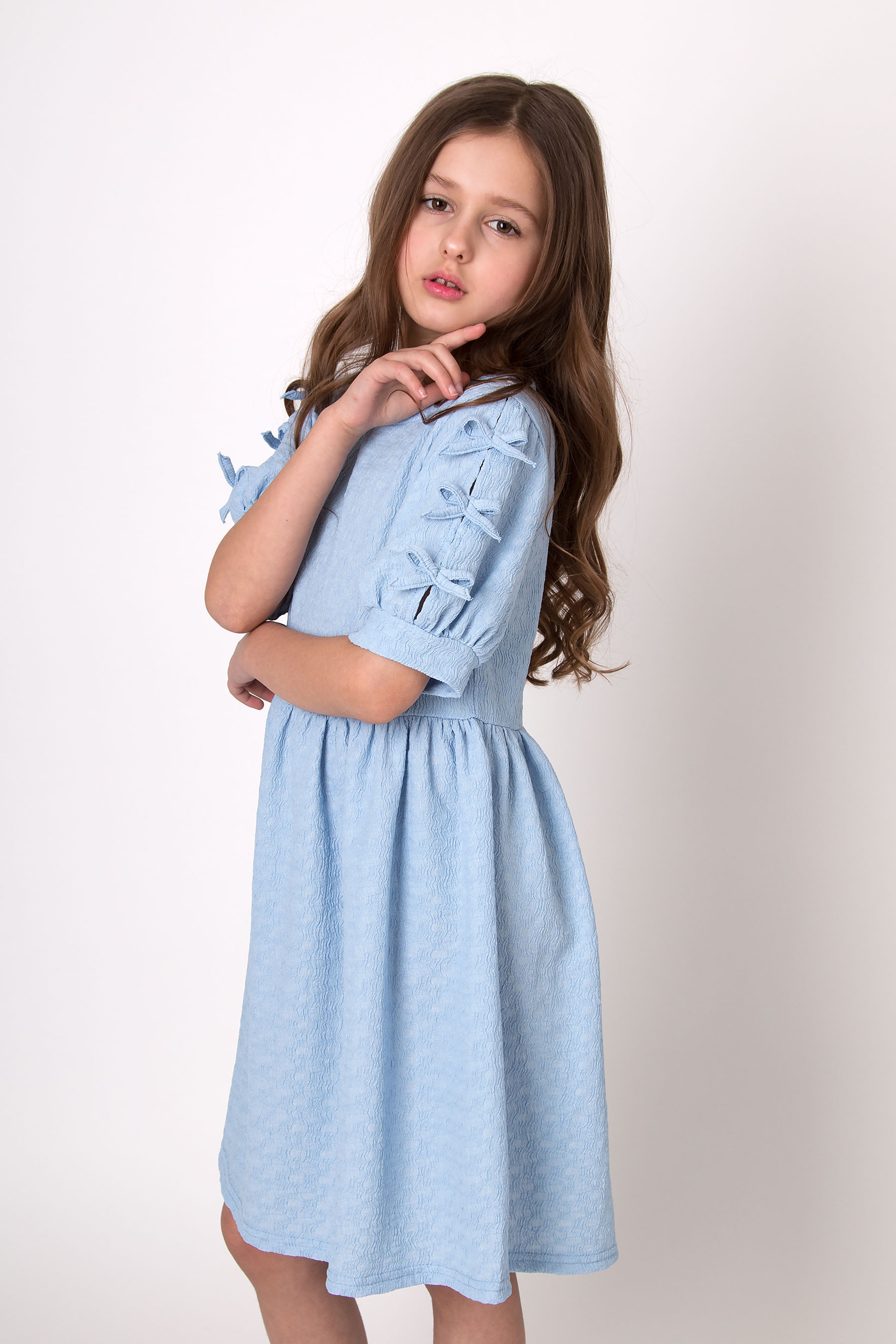 Сукня виконана з трикотажу жатка — еластичного та приємного до тіла матеріалу. Верх прямого крою з круглою горловиною. Нижня частина зі збіркою формує об’єм. Рукави оздоблені бантиками з основної тканини.