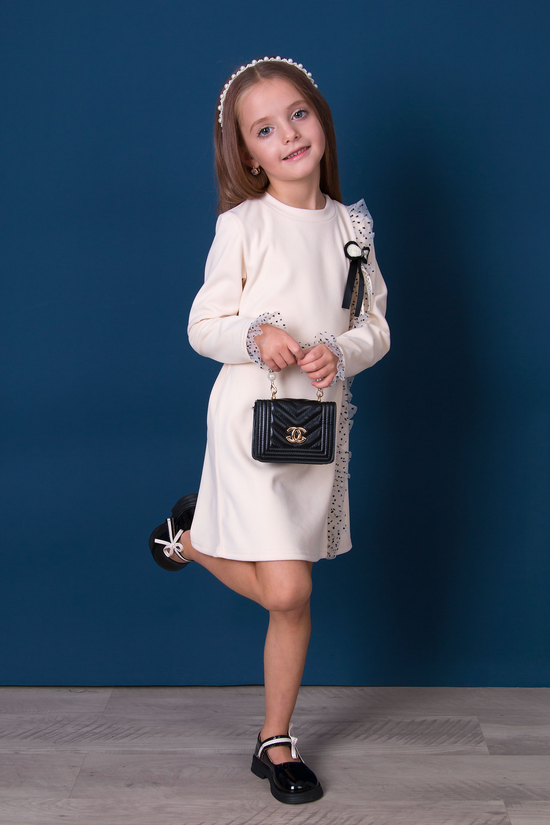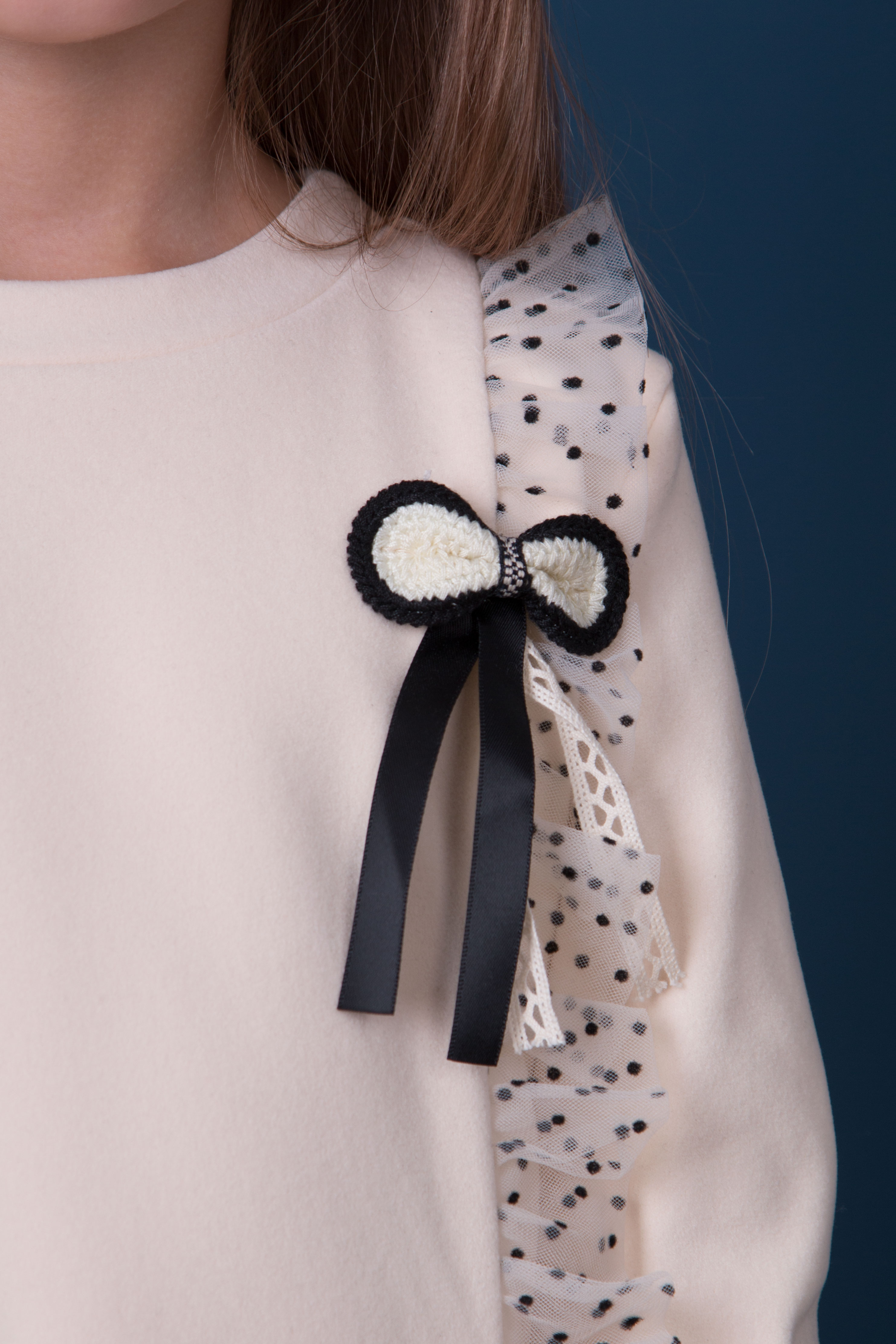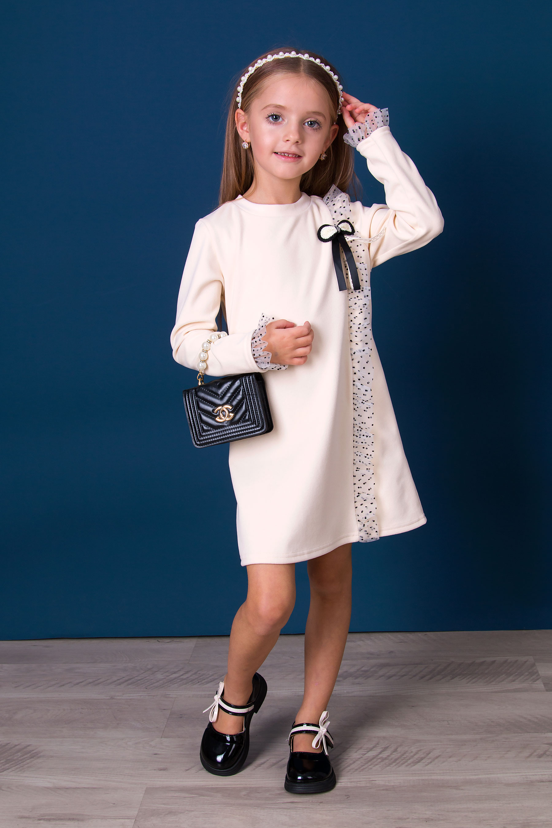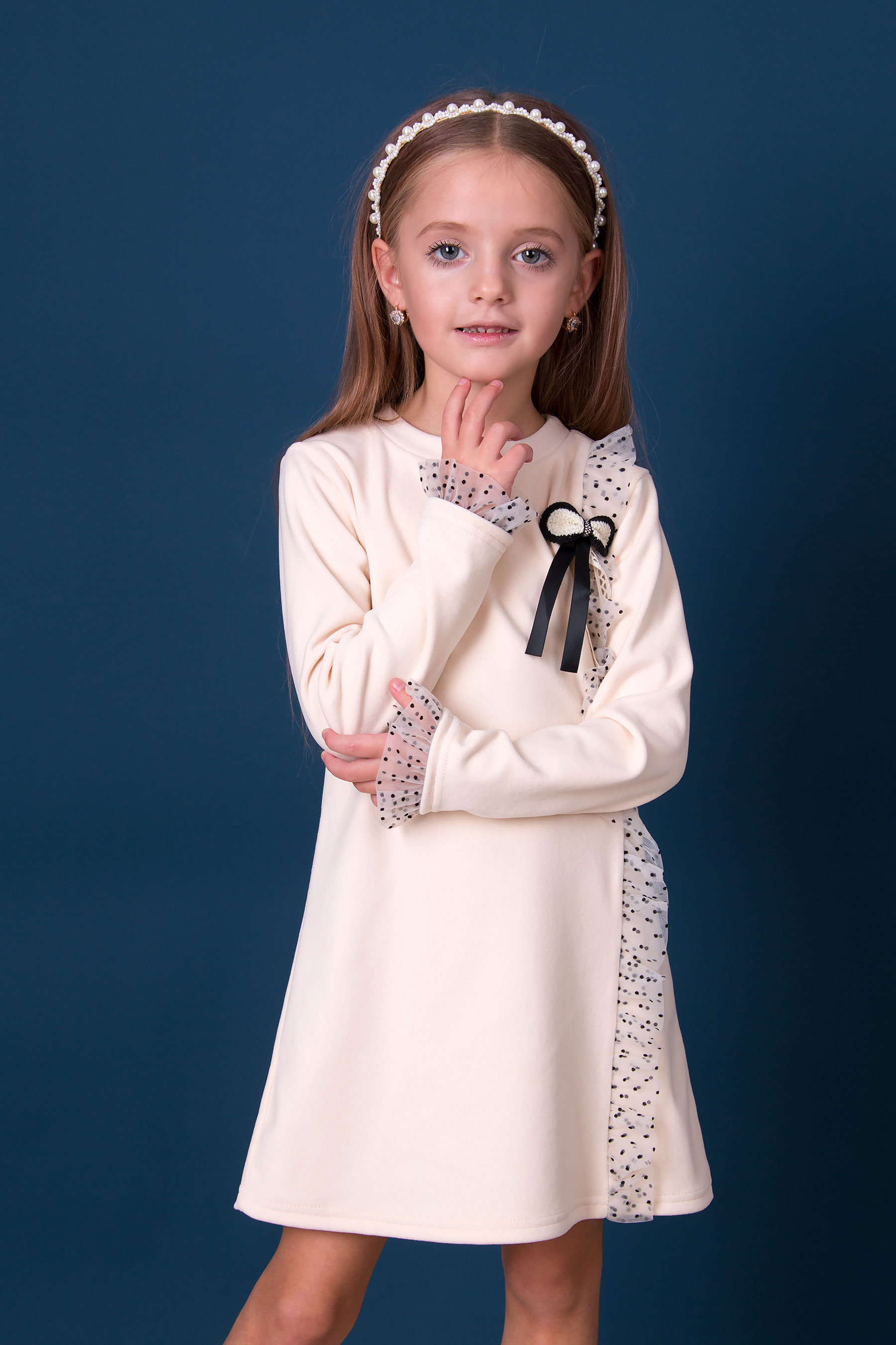 Сукня з теплого трикотажу з акцентом із фатину в горох. Декоративний бант надає образу святковості. Гарний варіант як для подій, так і на кожен день. М’яка тканина добре тримає форму.