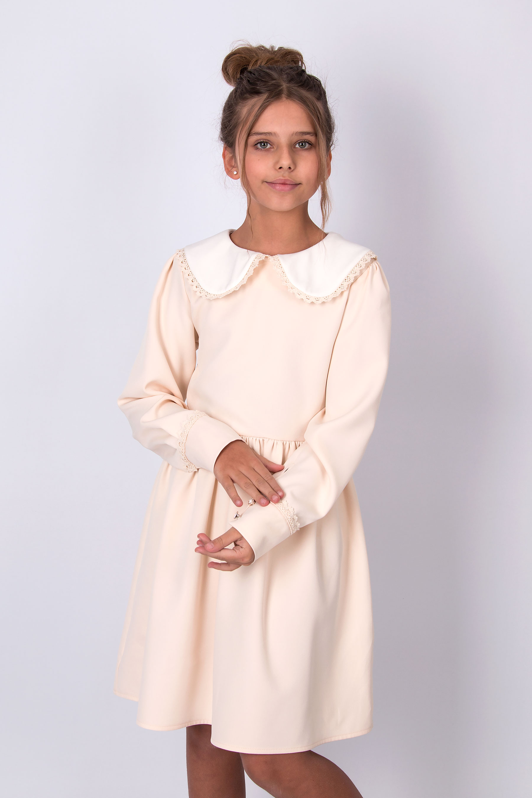Сукня виконана з текстилю, відкладний комір доповнений мереживною обробкою, що створює виразний акцент виробу. Спідниця розширена, зі зборкою по лінії талії, завдяки чому модель виглядає об’ємною та легкою. Рукави довгі, з оформленими манжетами.