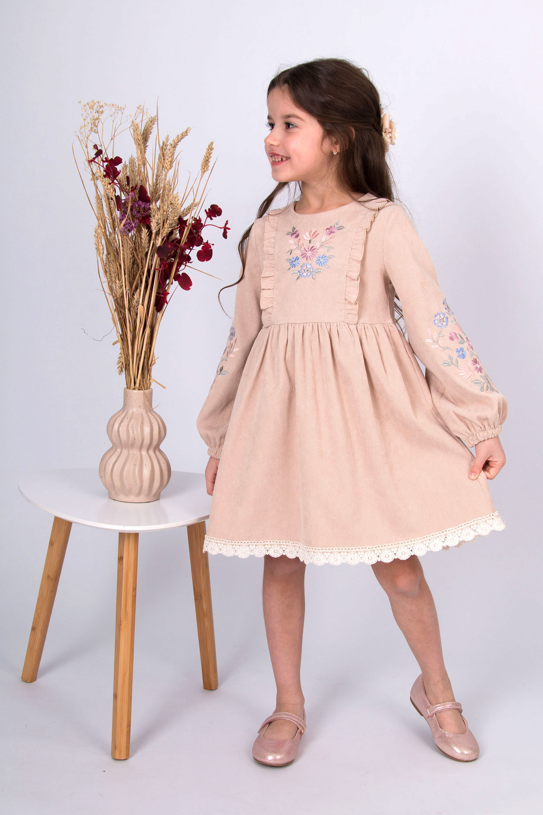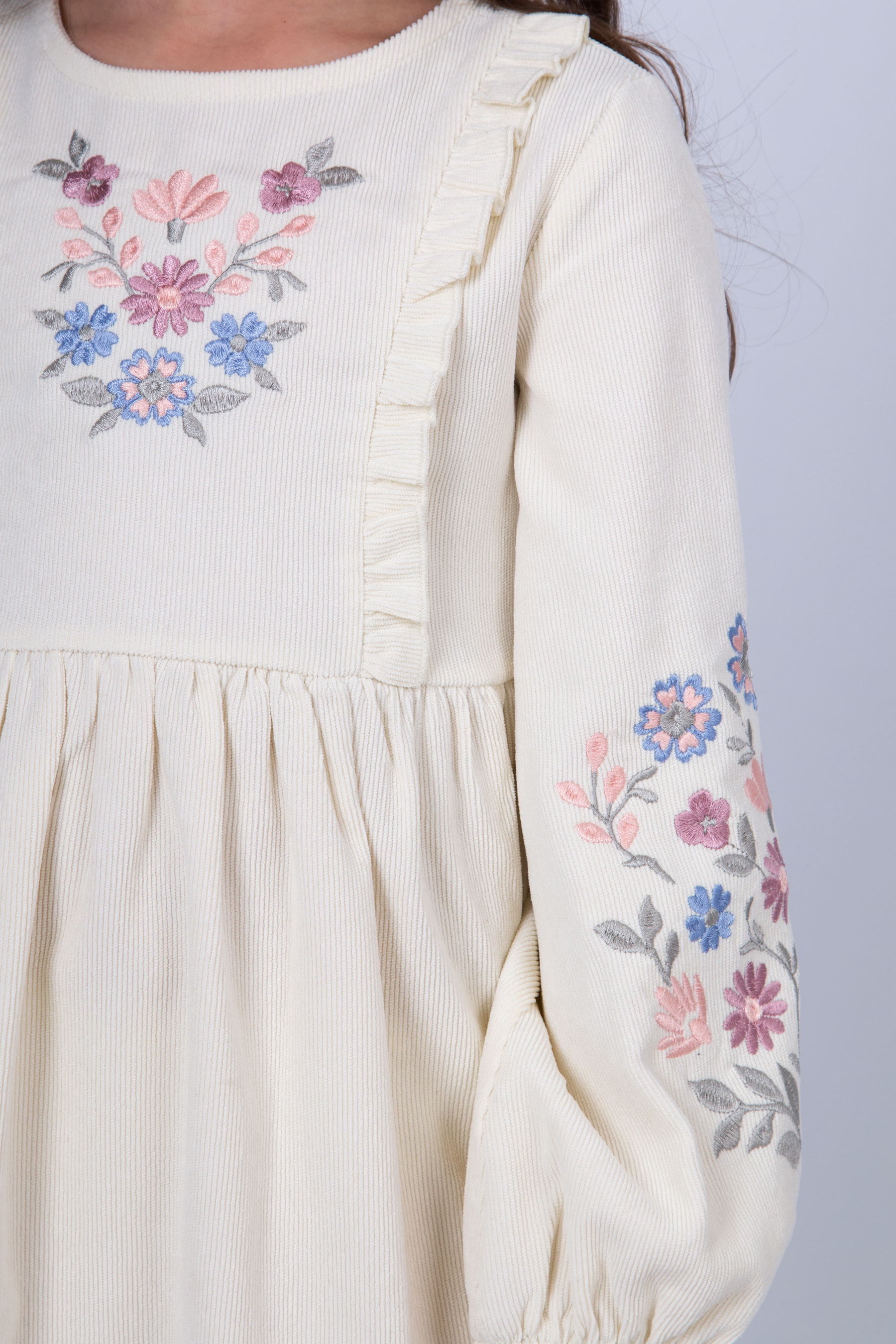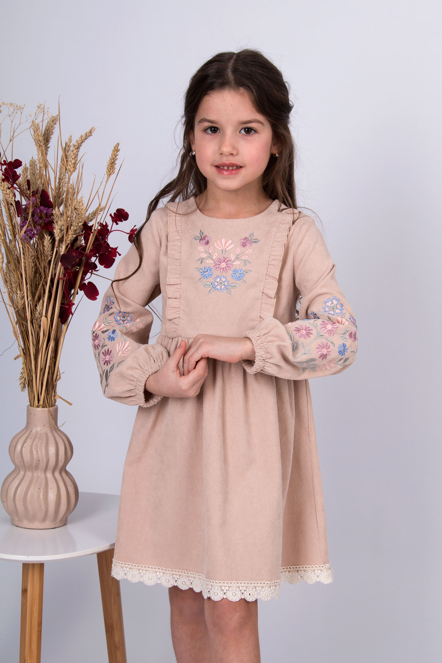 Вельветова сукня відрізна вище лінії талії, зі спідницею на зборку. Верхня частина сукні та рукави оздоблені квітковою вишивкою і декоративними вертикальними рюшами. Спідниця вільного крою на рівномірну зборку. Довжина сукні до колін. По низу сукні настрочене мереживо.