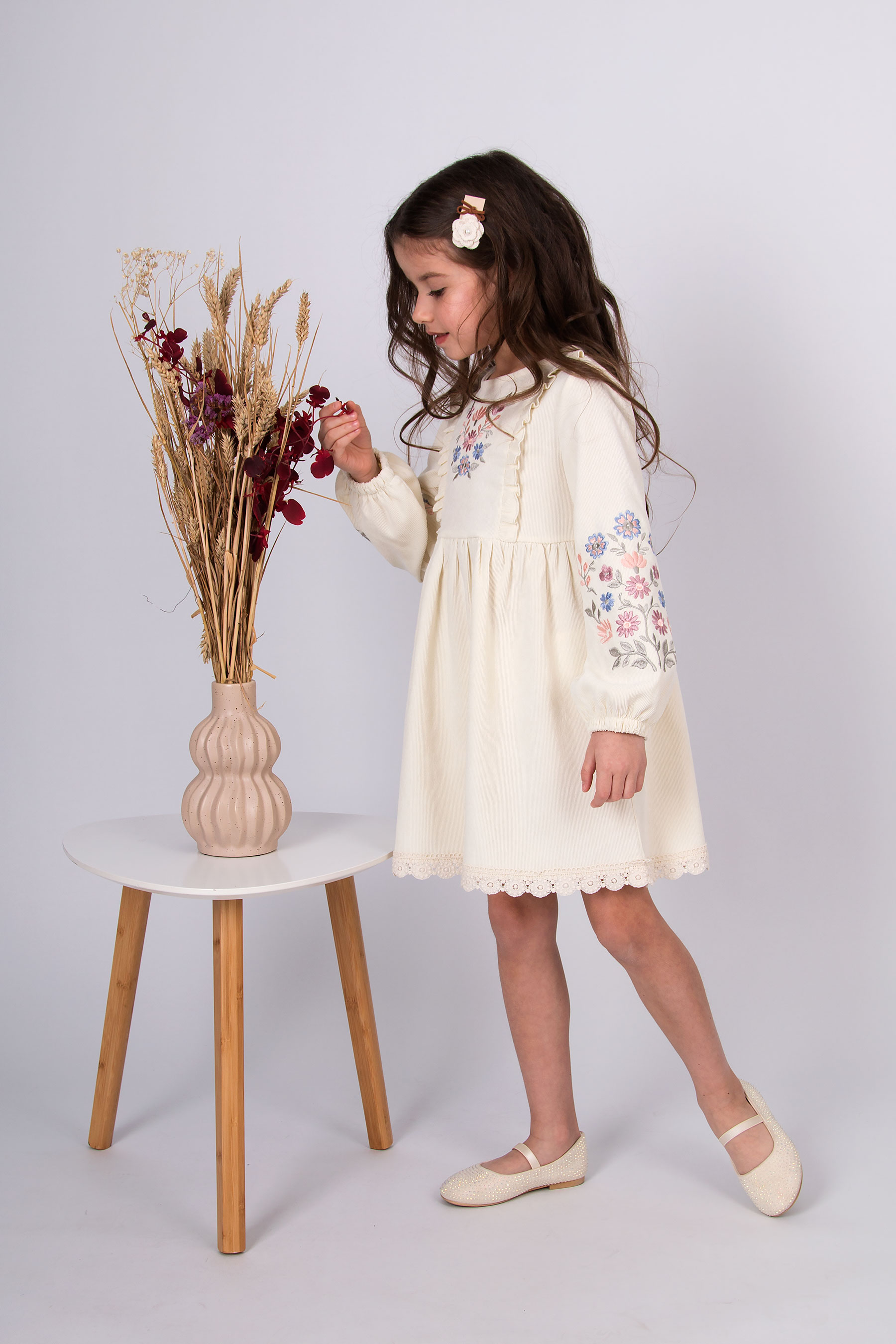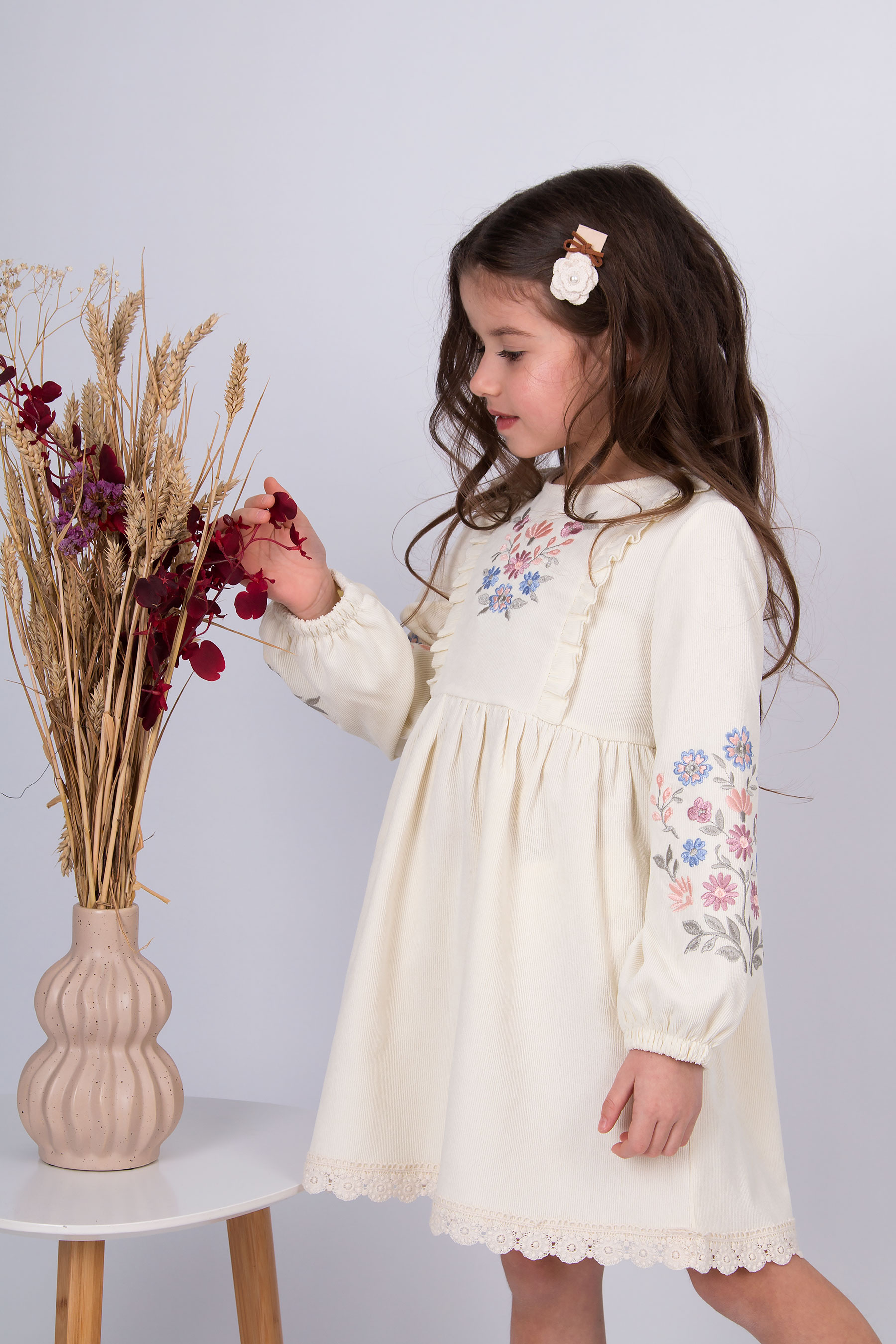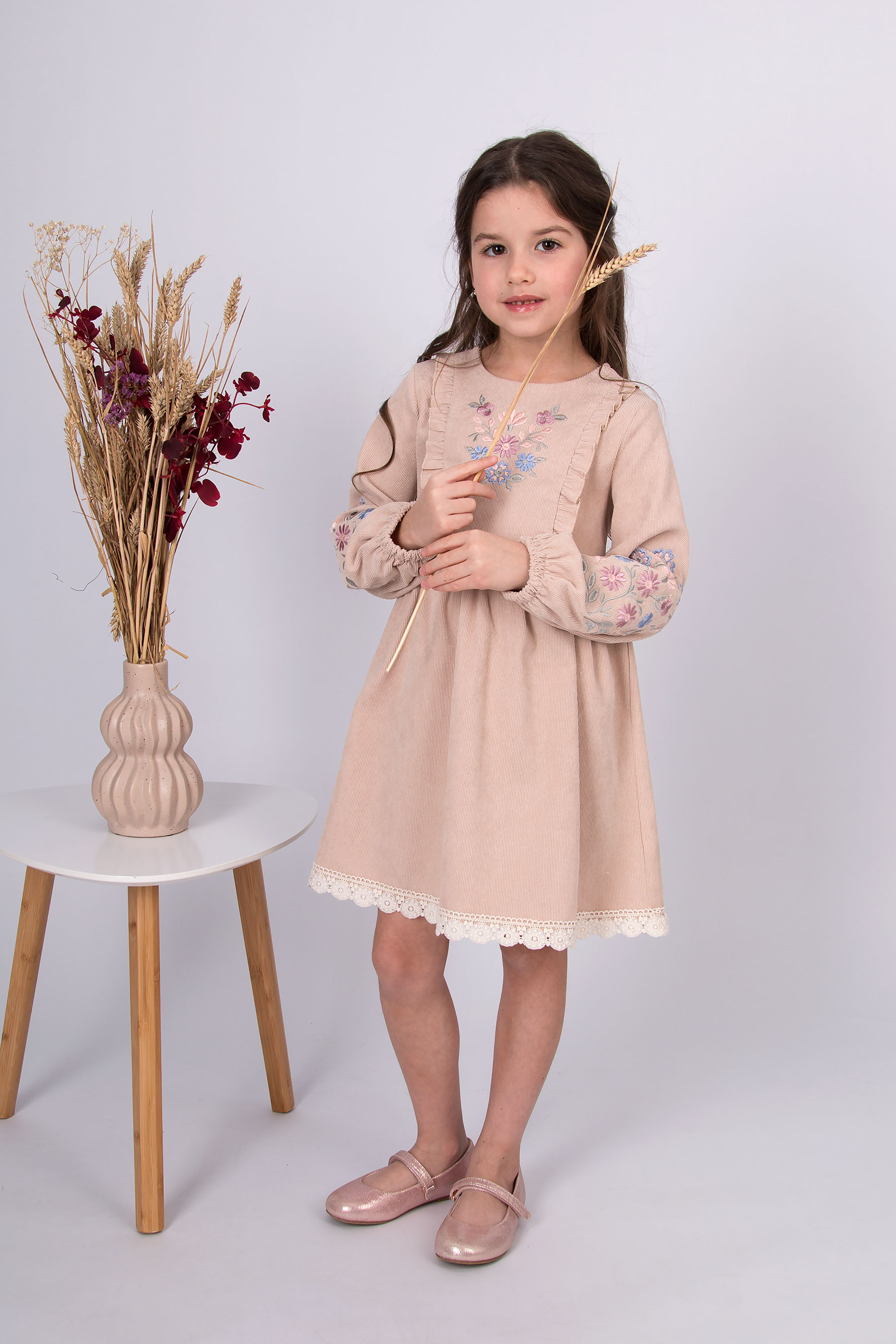 Вельветова сукня відрізна вище лінії талії, зі спідницею на зборку. Верхня частина сукні та рукави оздоблені квітковою вишивкою і декоративними вертикальними рюшами. Спідниця вільного крою на рівномірну зборку. Довжина сукні до колін. По низу сукні настрочене мереживо.
