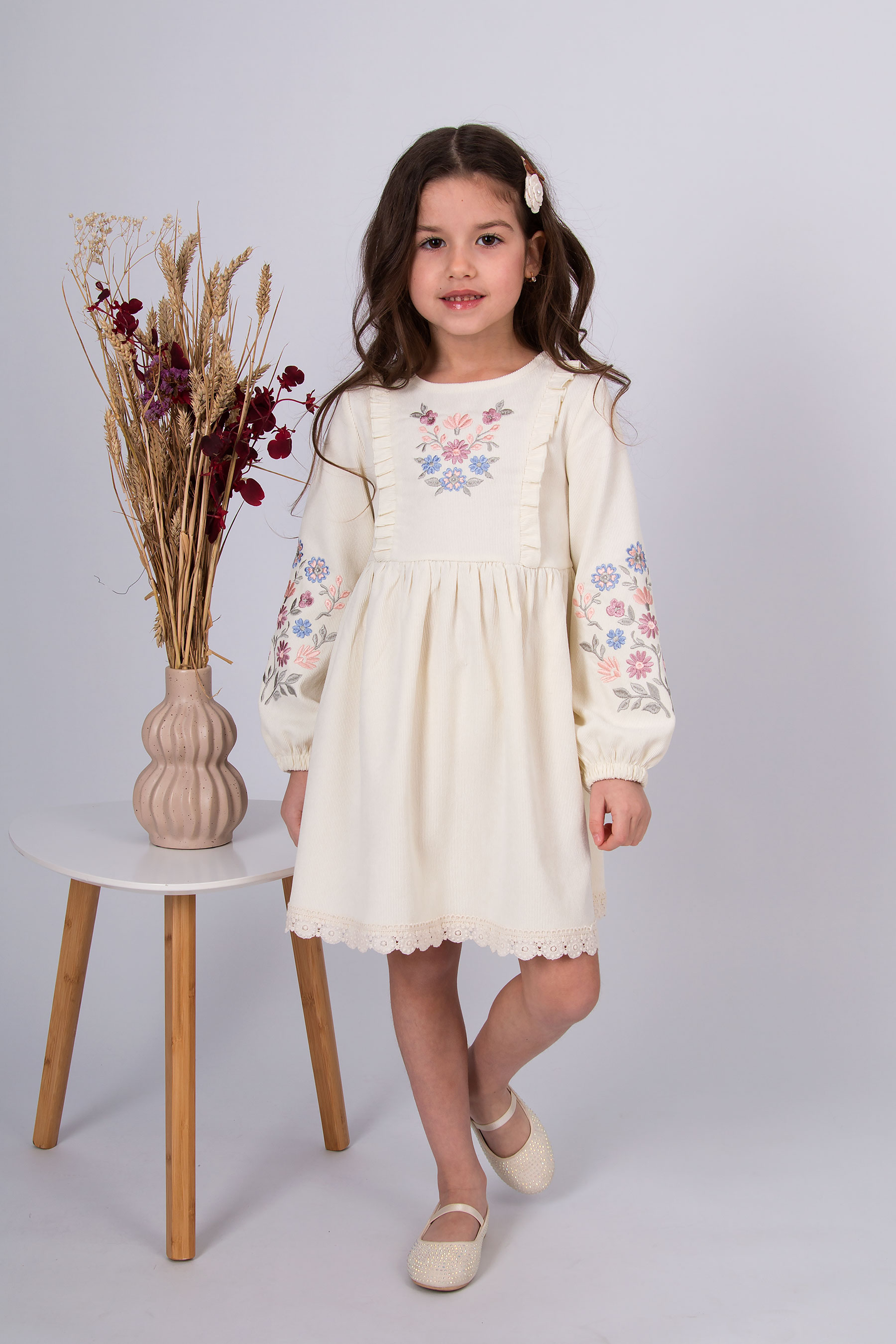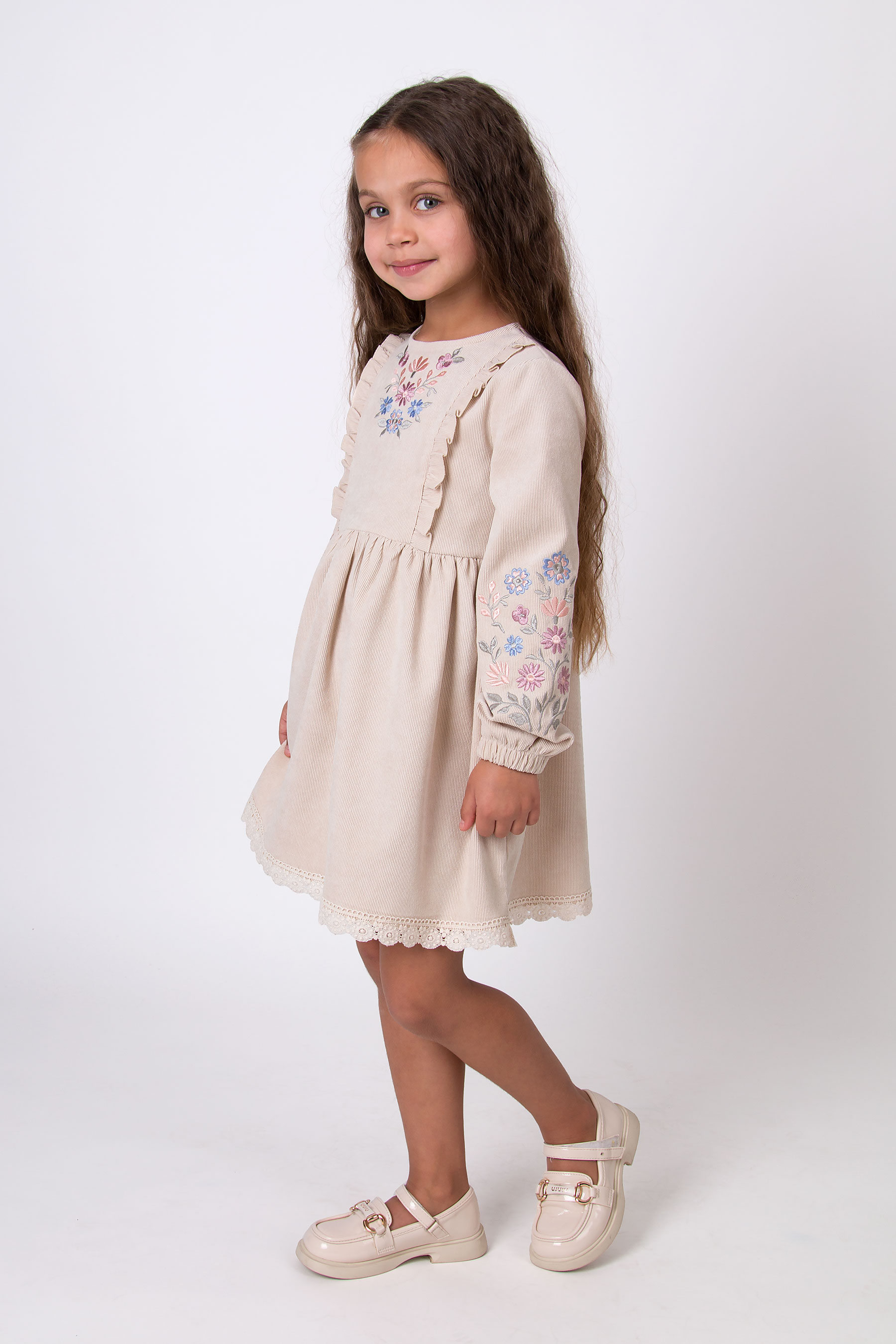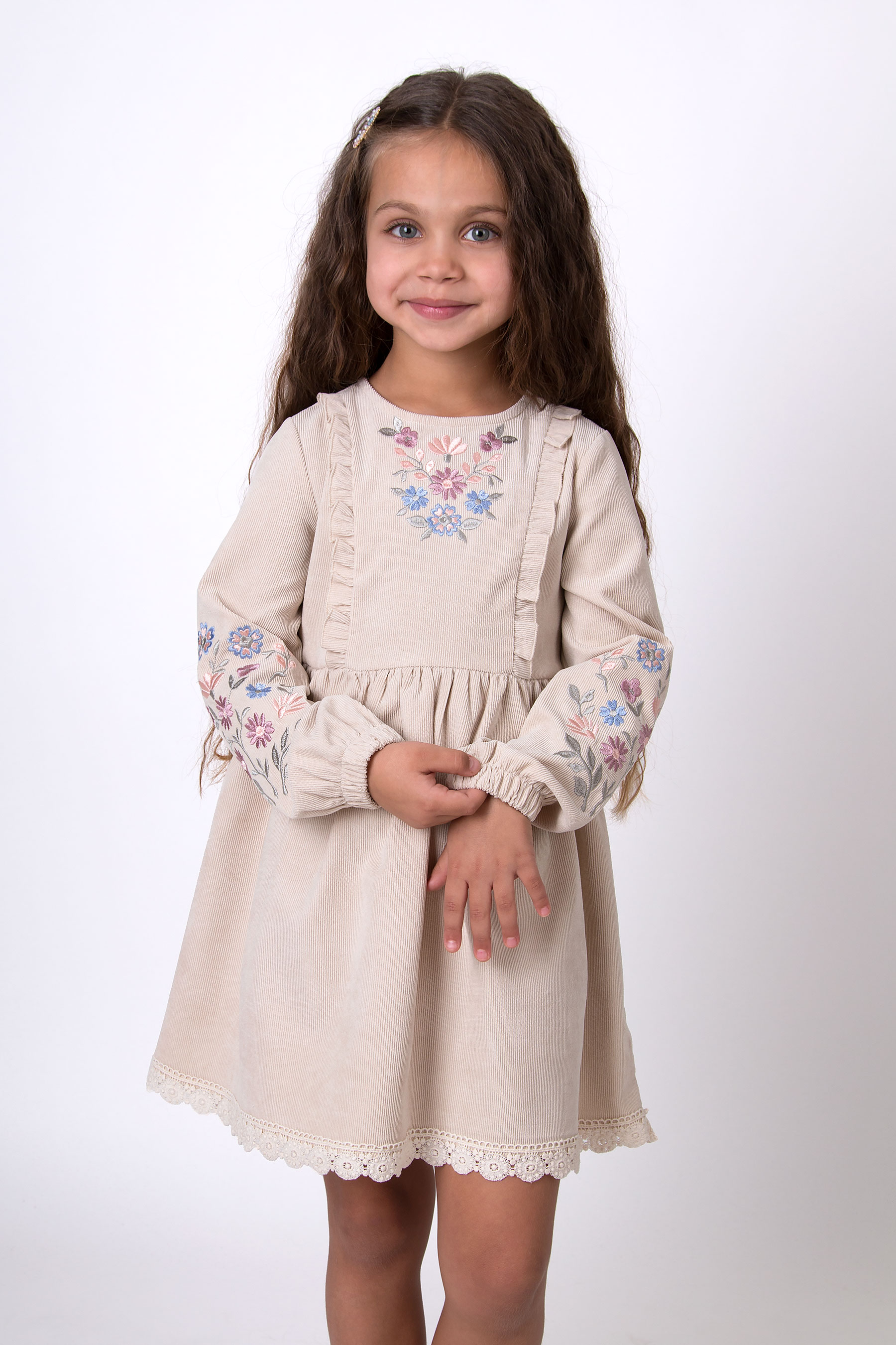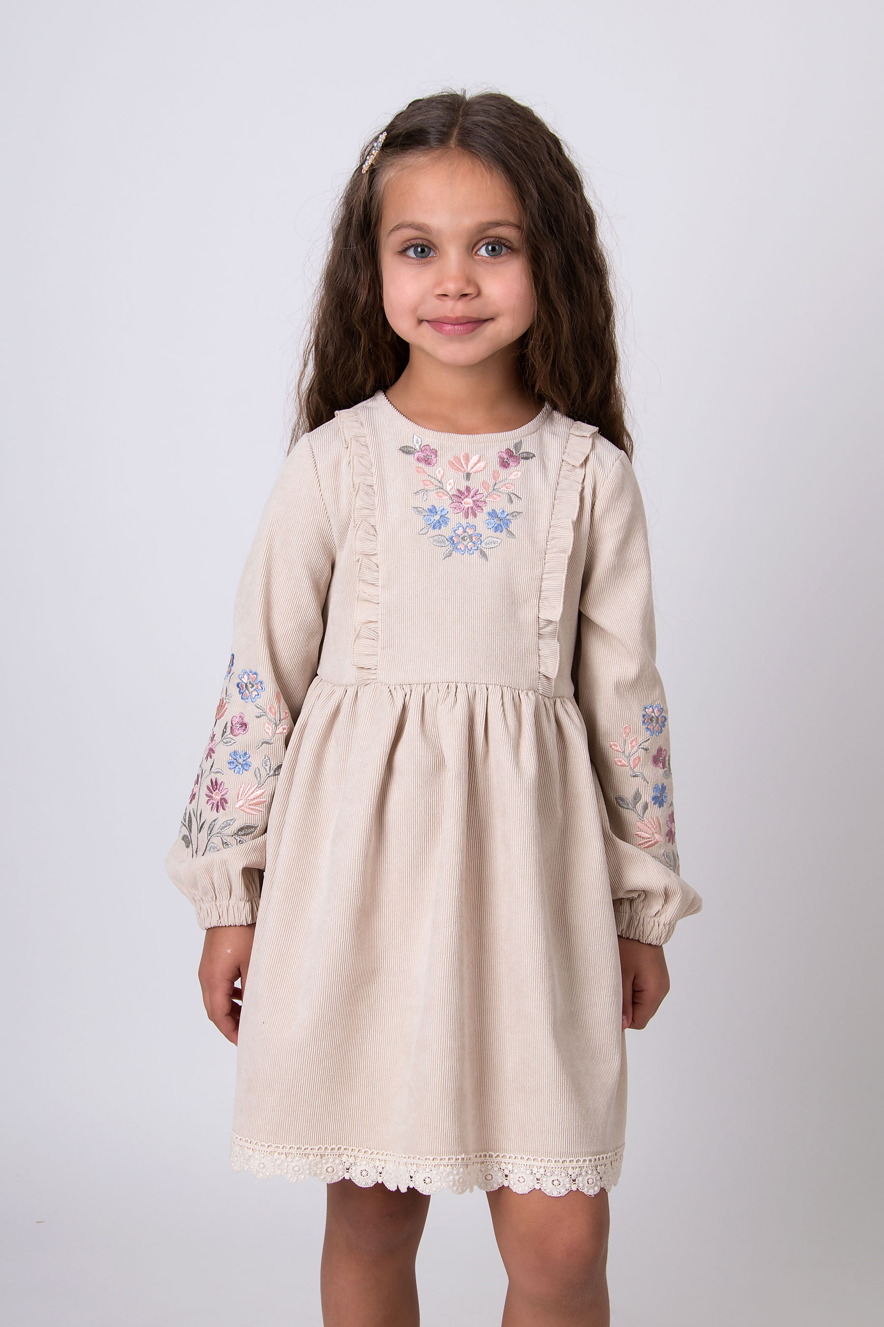 Вельветова сукня відрізна вище лінії талії, зі спідницею на зборку. Верхня частина сукні та рукави оздоблені квітковою вишивкою і декоративними вертикальними рюшами. Спідниця вільного крою на рівномірну зборку. Довжина сукні до колін. По низу сукні настрочене мереживо.