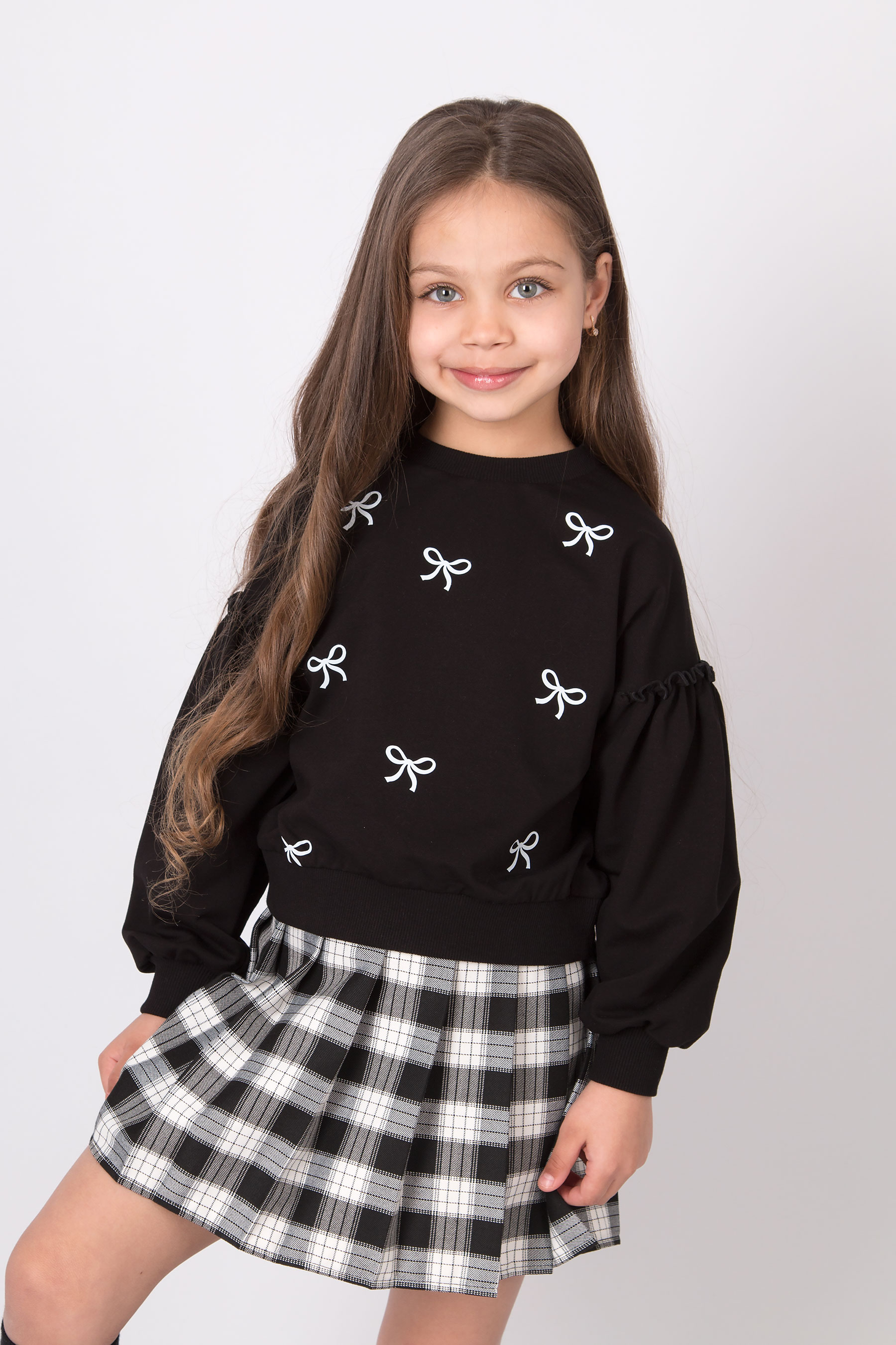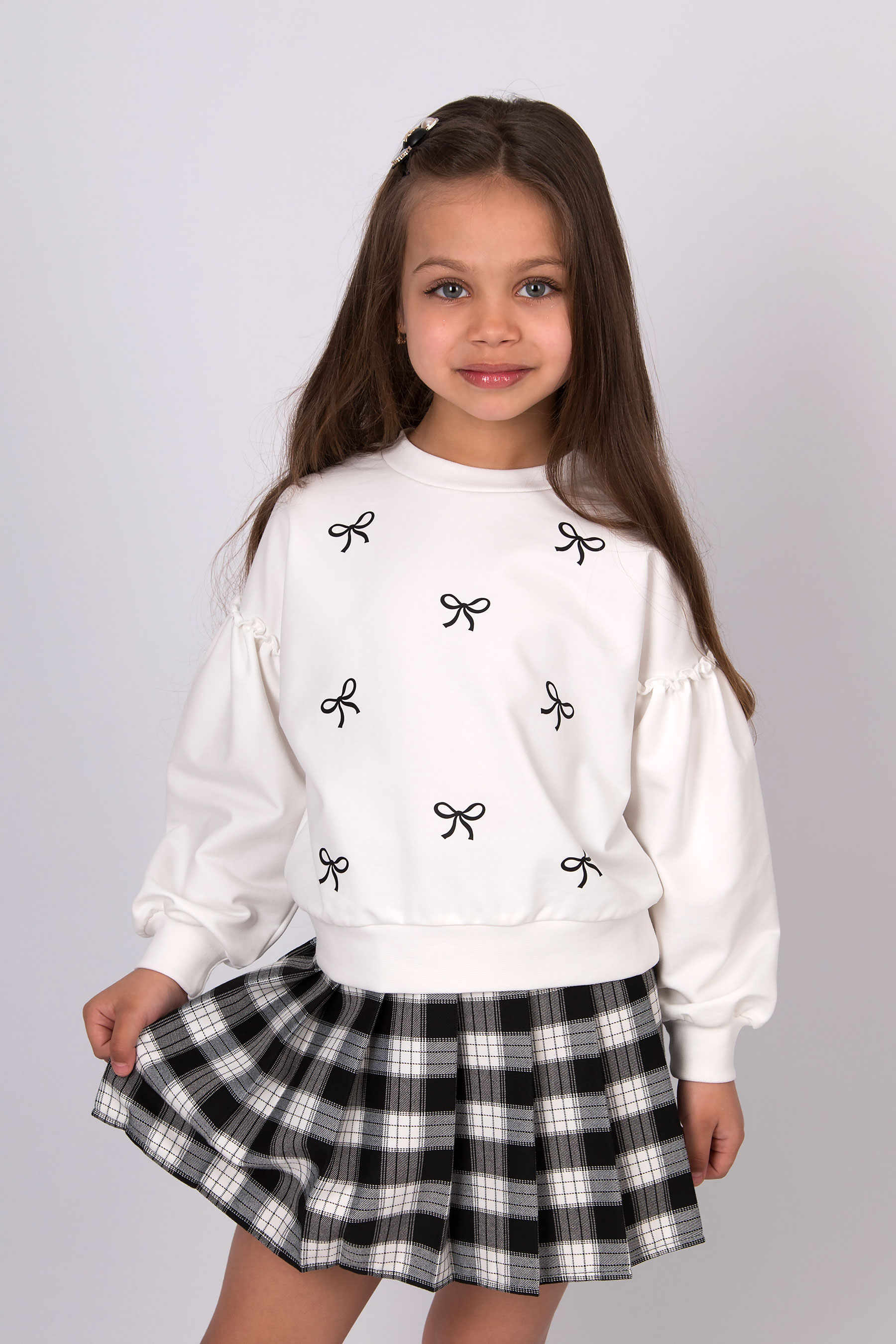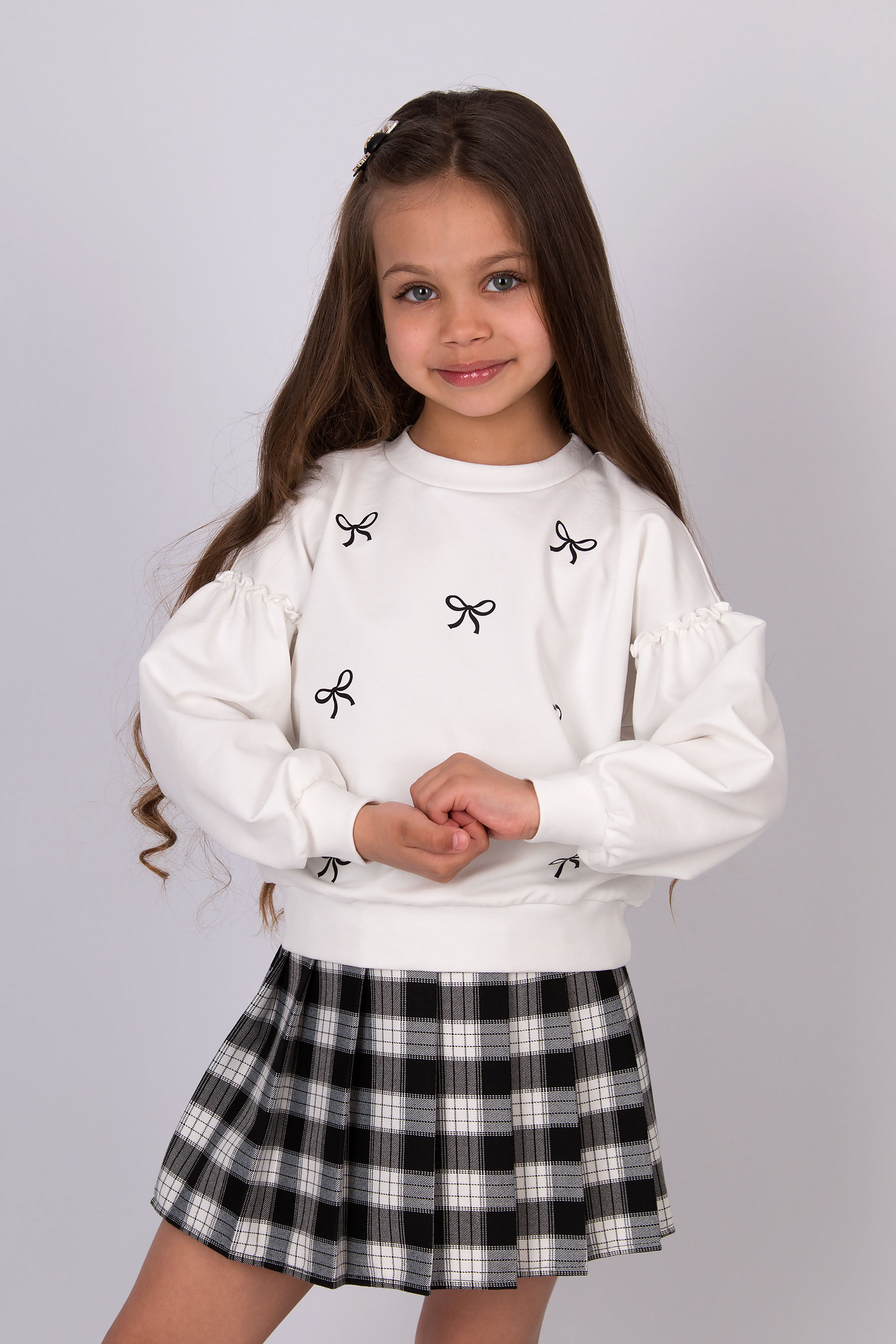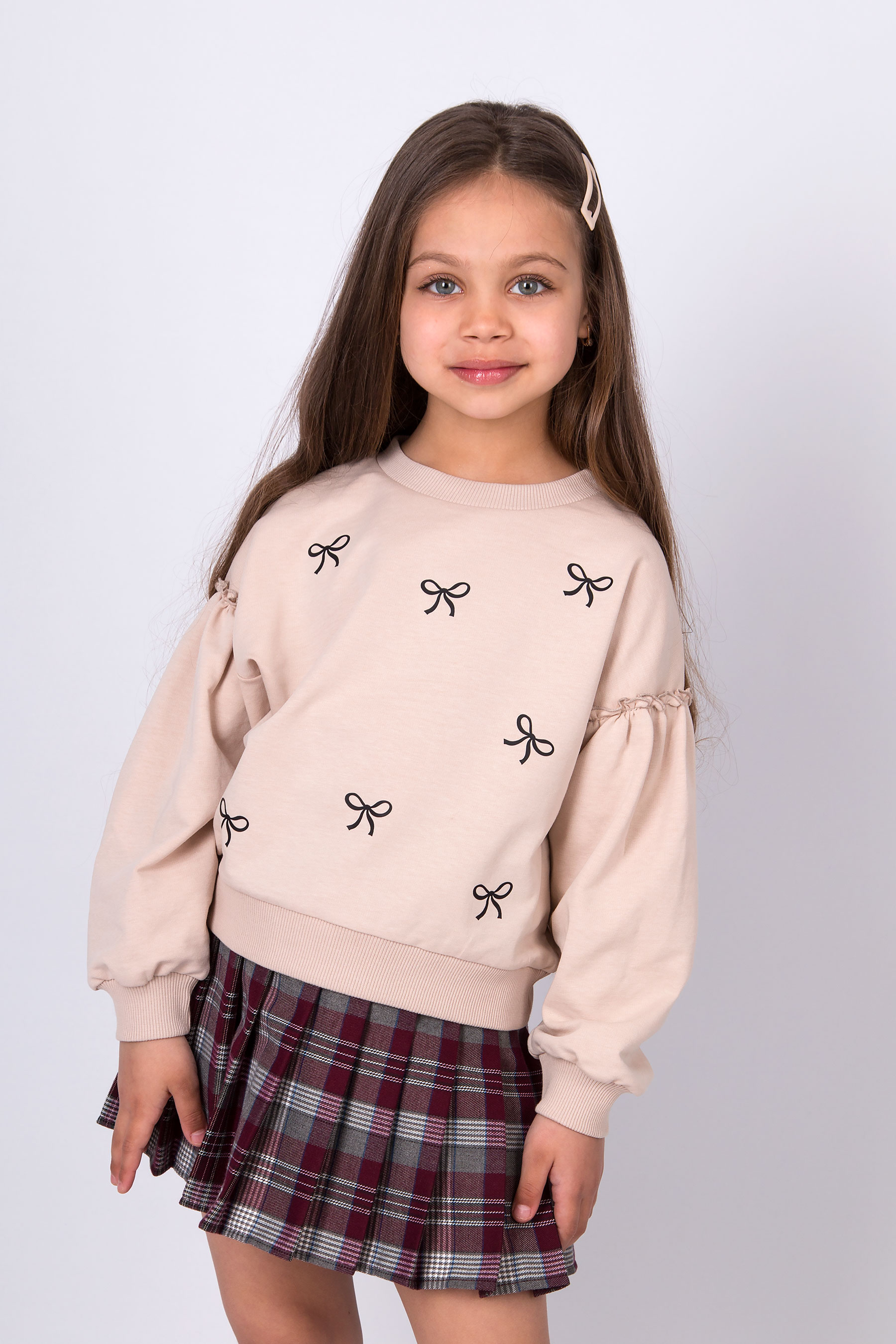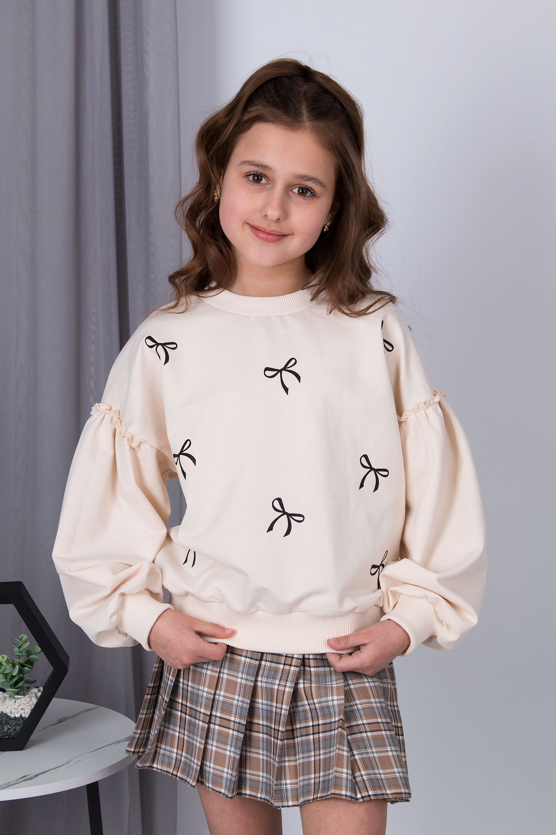 Cвітшот має вільну посадку, округлу горловину та об’ємні рукави з манжетами. Принт бантиків по всьому світшоту. Низ виробу на манжеті.