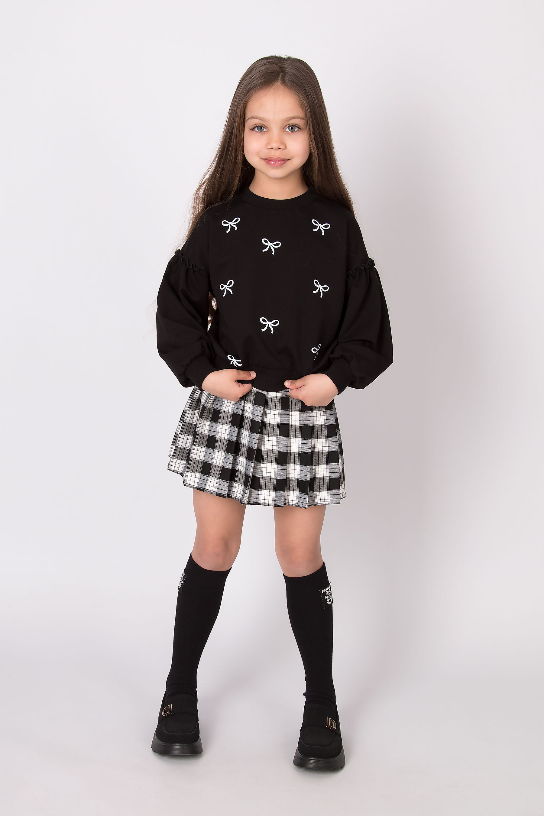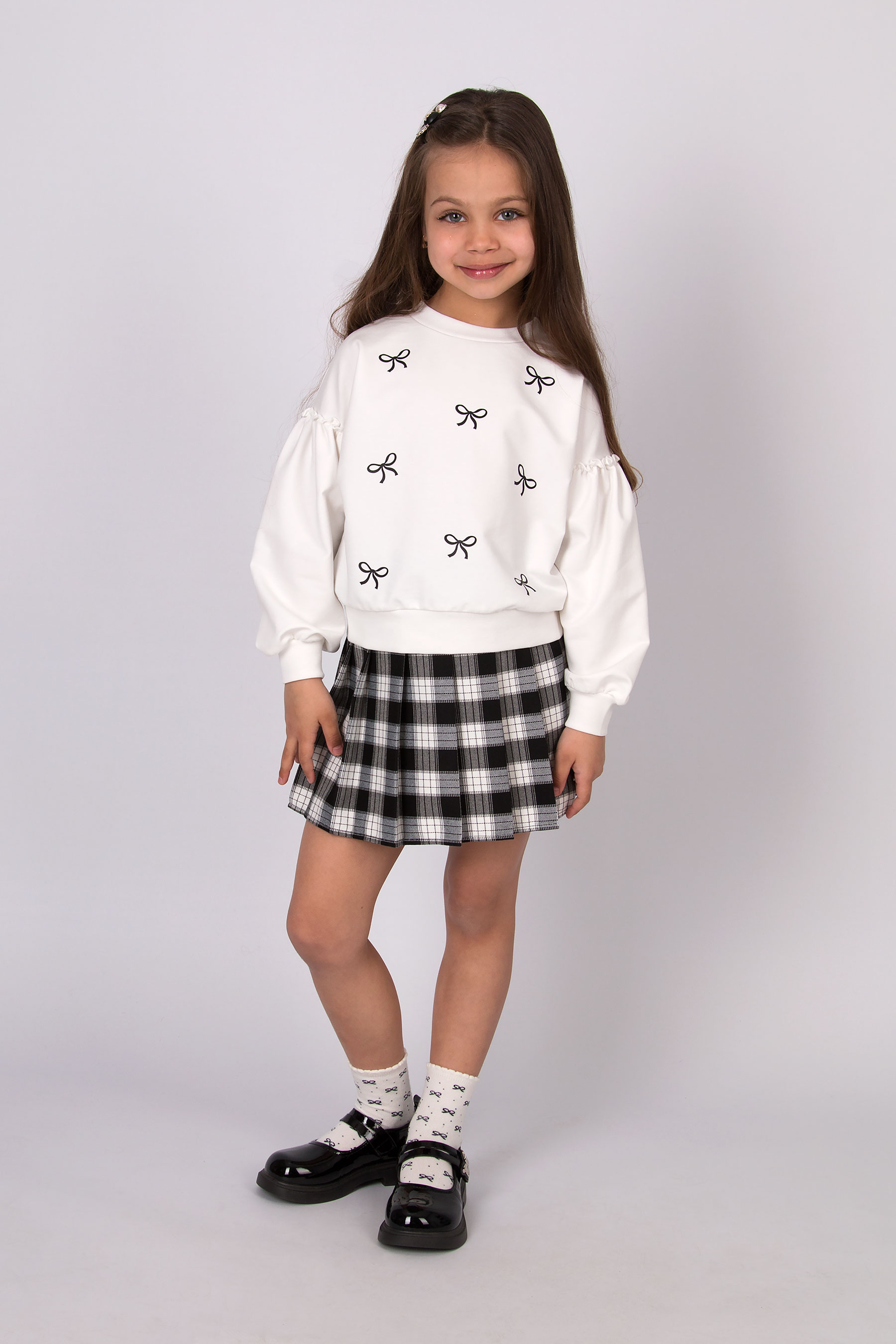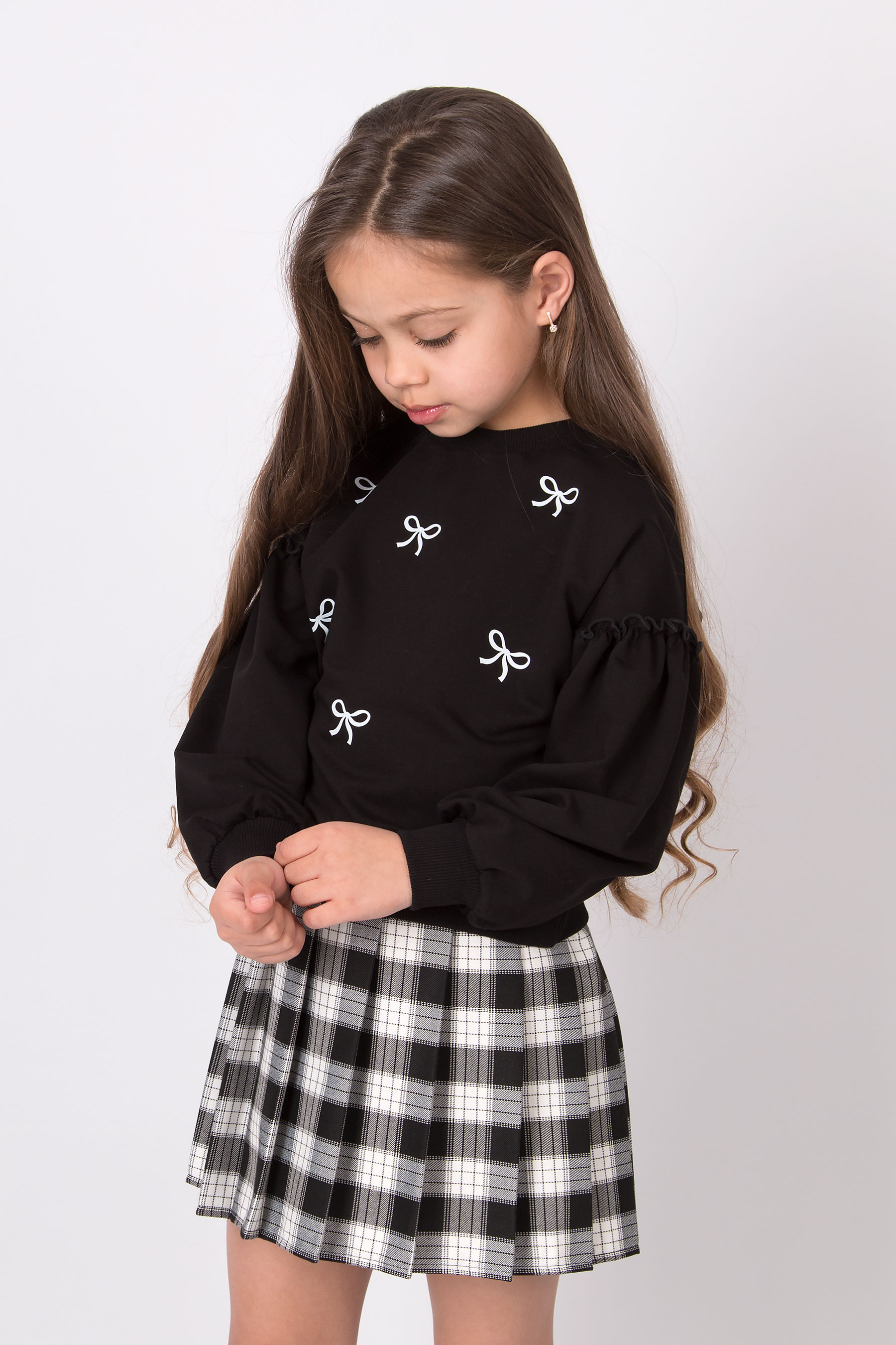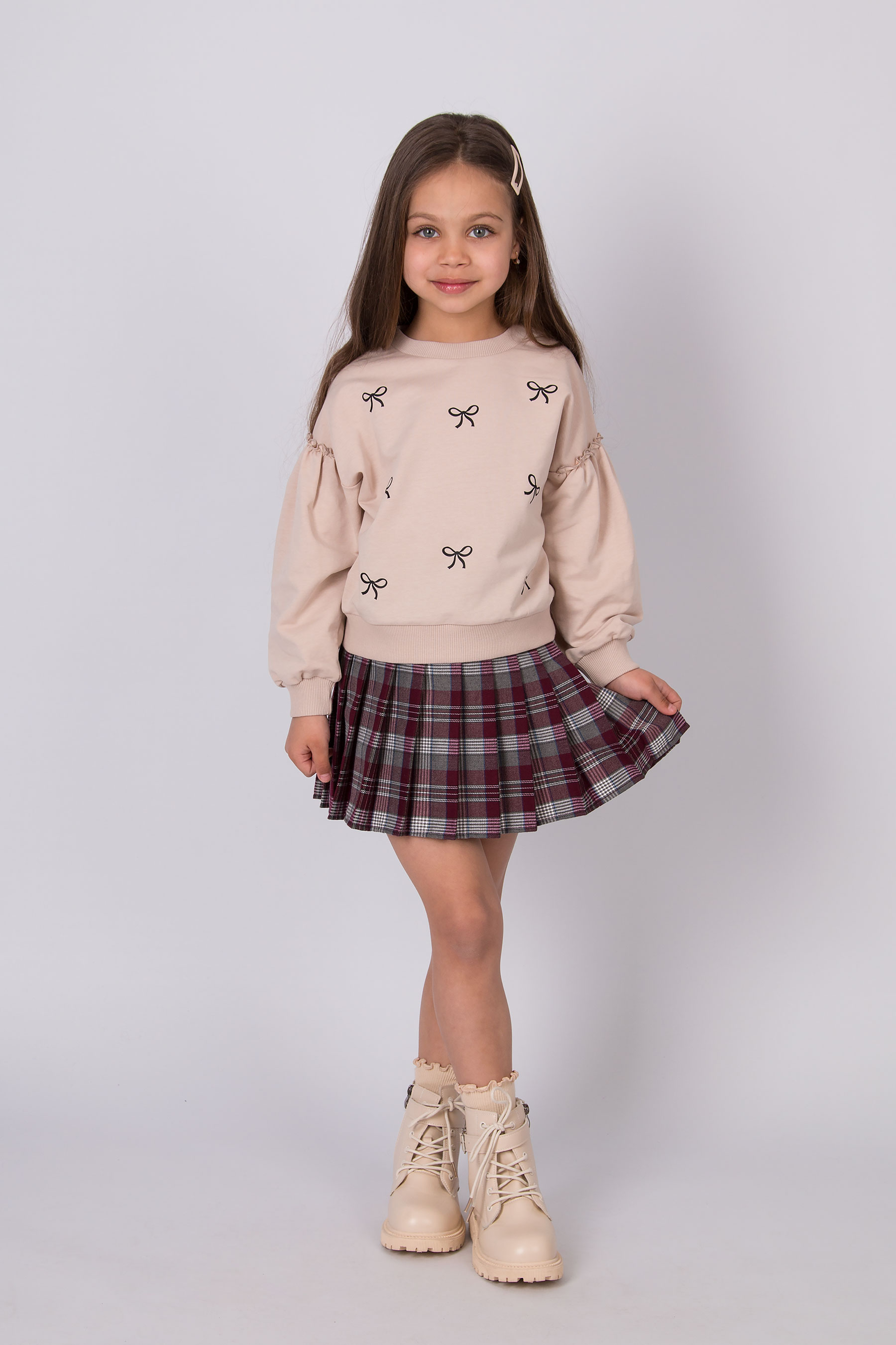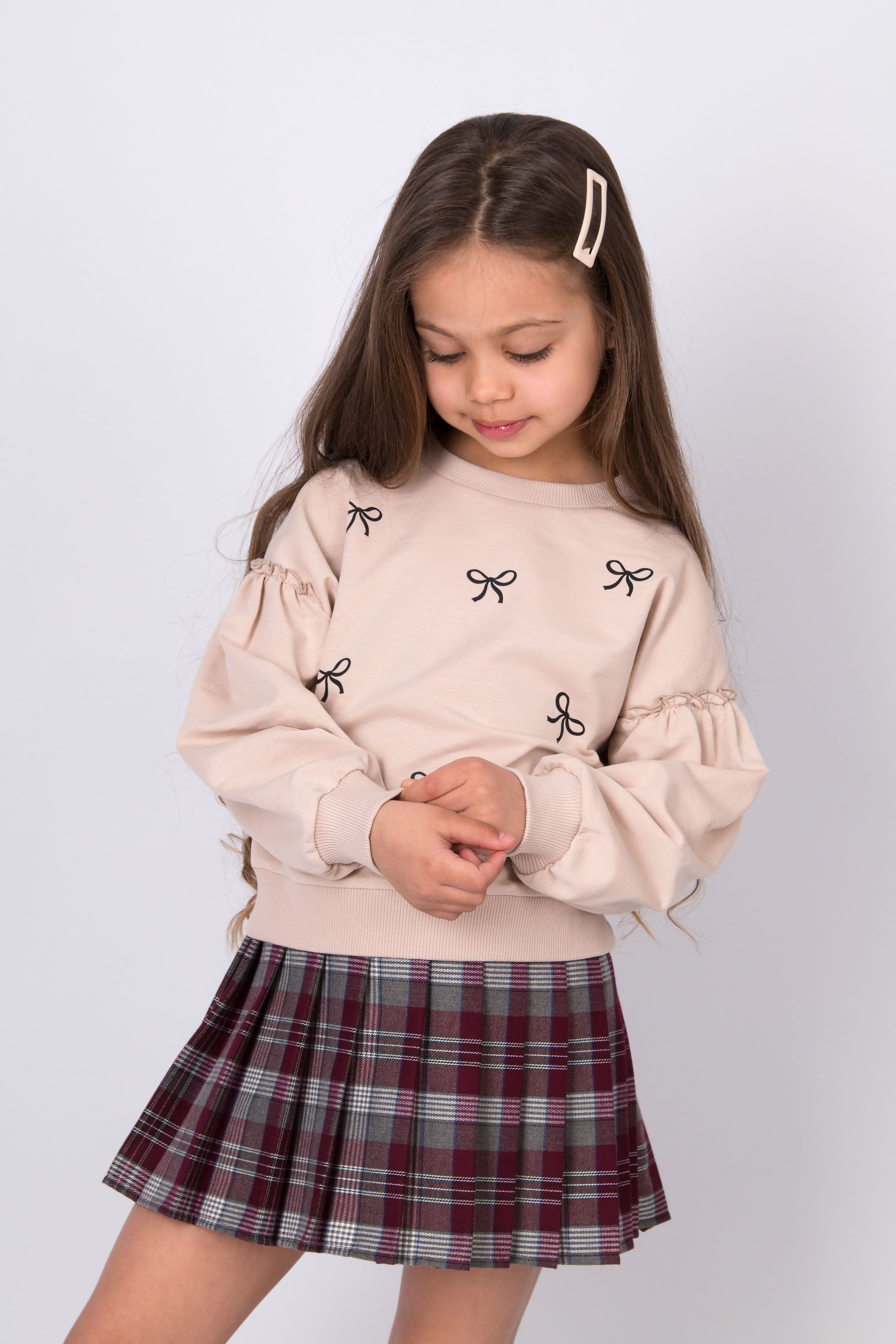 Cвітшот має вільну посадку, округлу горловину та об’ємні рукави з манжетами. Принт бантиків по всьому світшоту. Низ виробу на манжеті.
