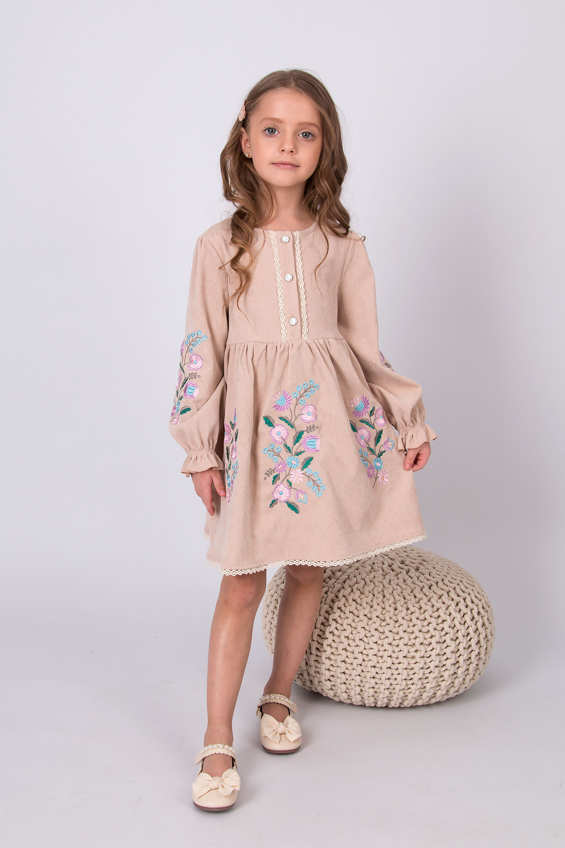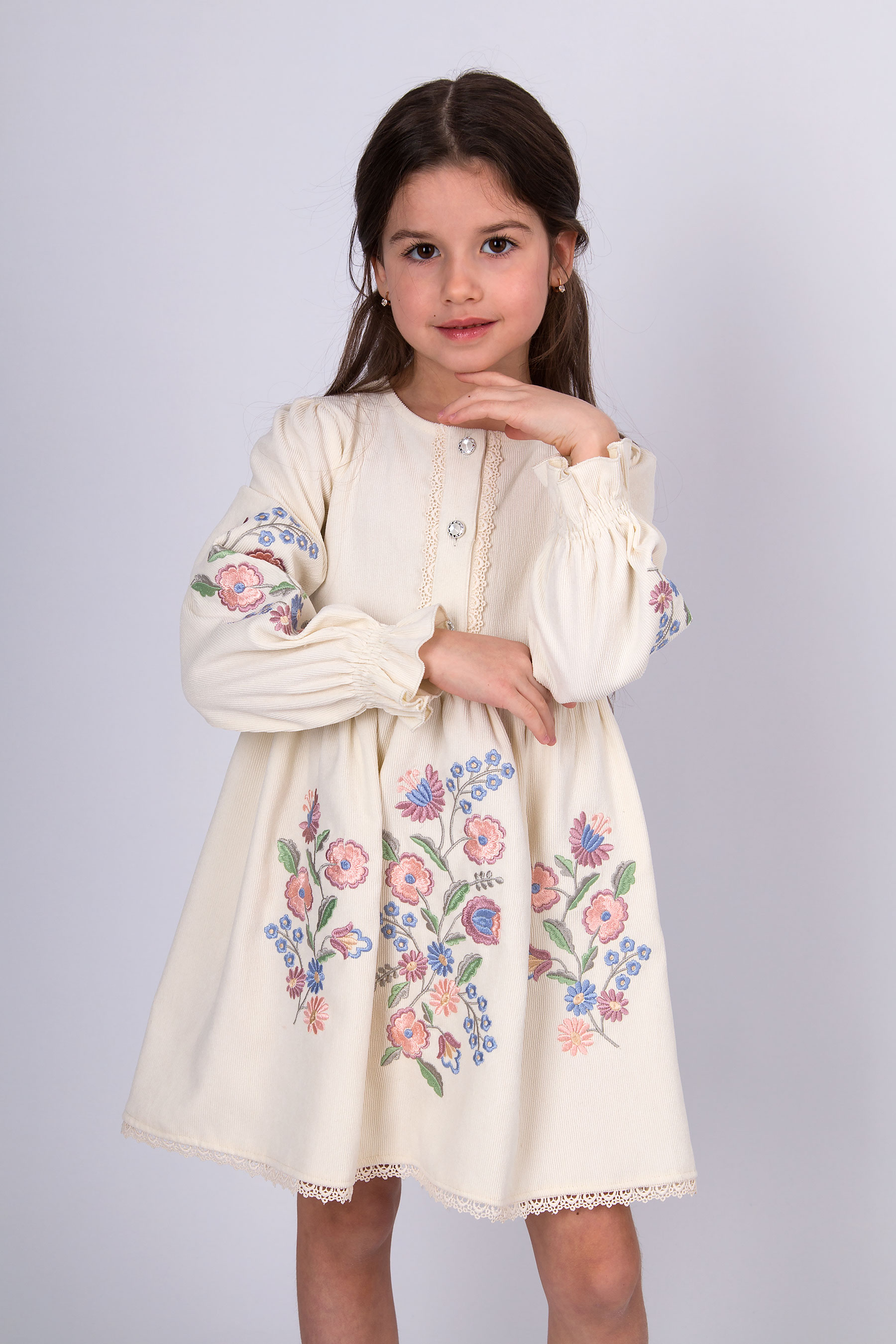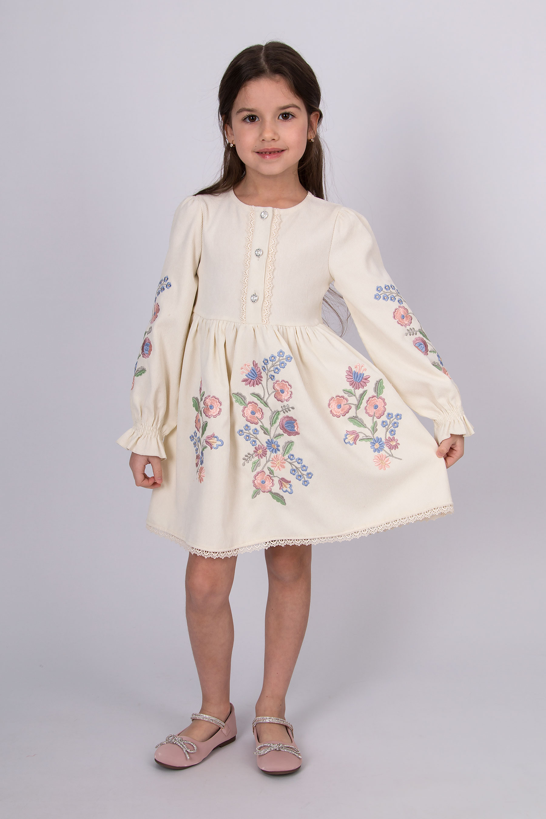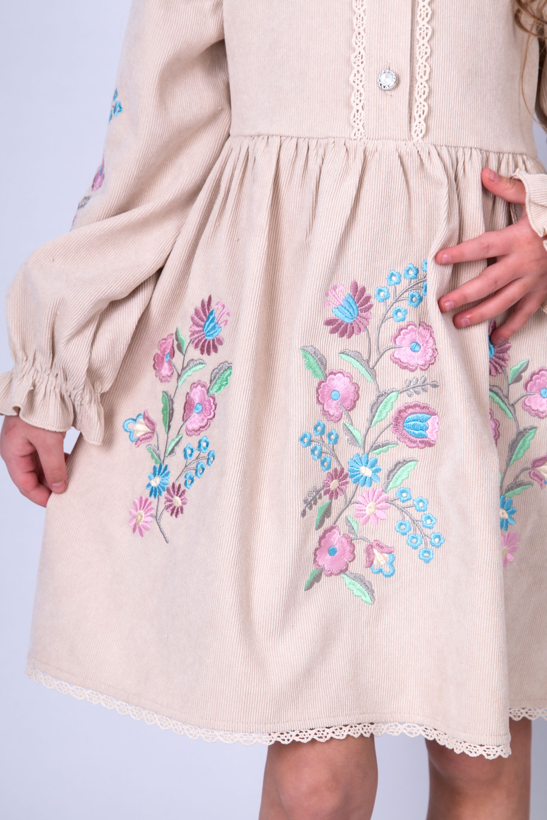 Вельветова сукня з відрізною лінією талії та зібраною спідницею. Ліф прямого крою, по центру планка із застібкою на ґудзики, оздоблена тасьмою. Рукав довгий, об’ємний, зі зборкою по низу. По краю спідниці — мереживо. Вишивка з квітковим орнаментом розташована на рукавах і по передній частині.