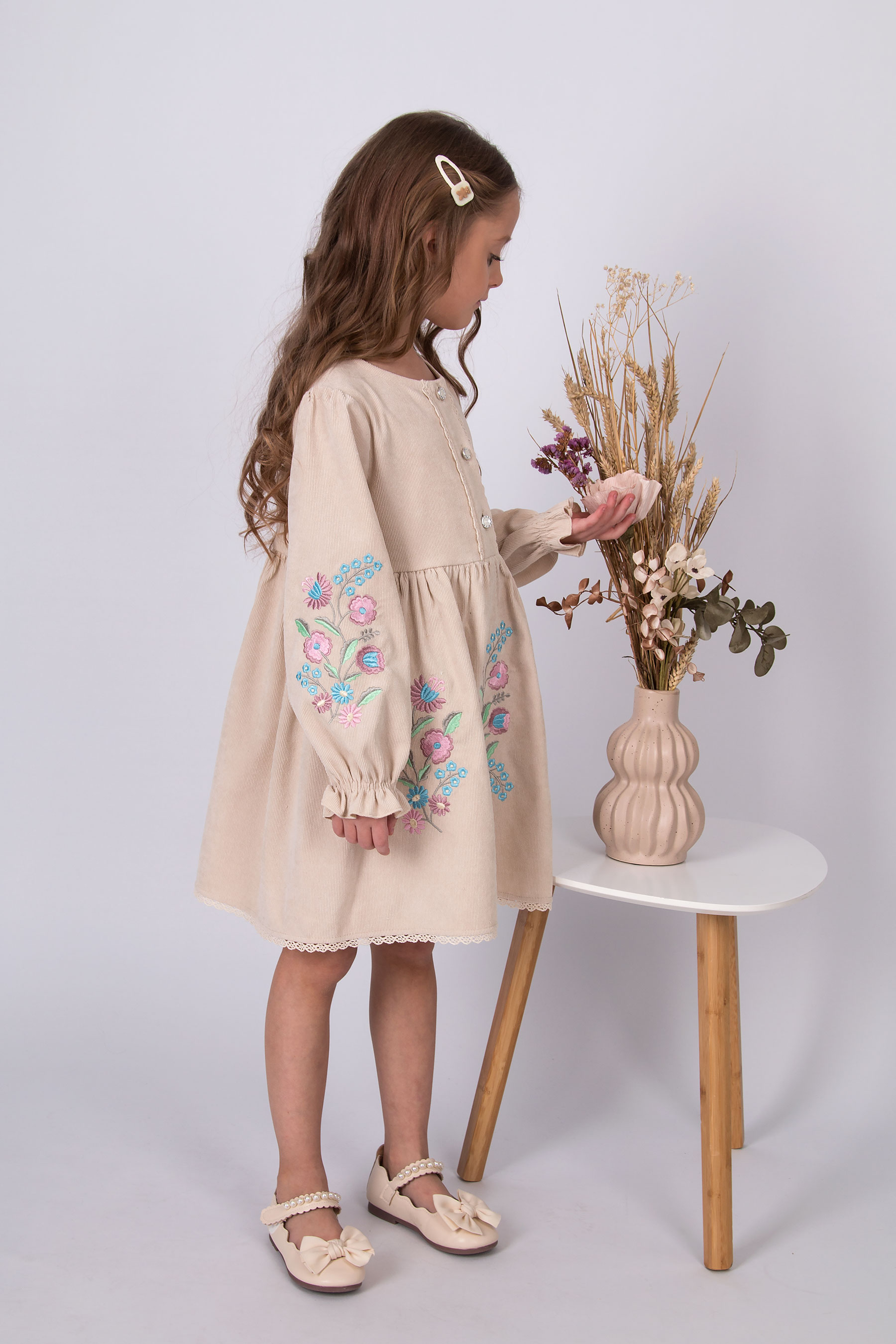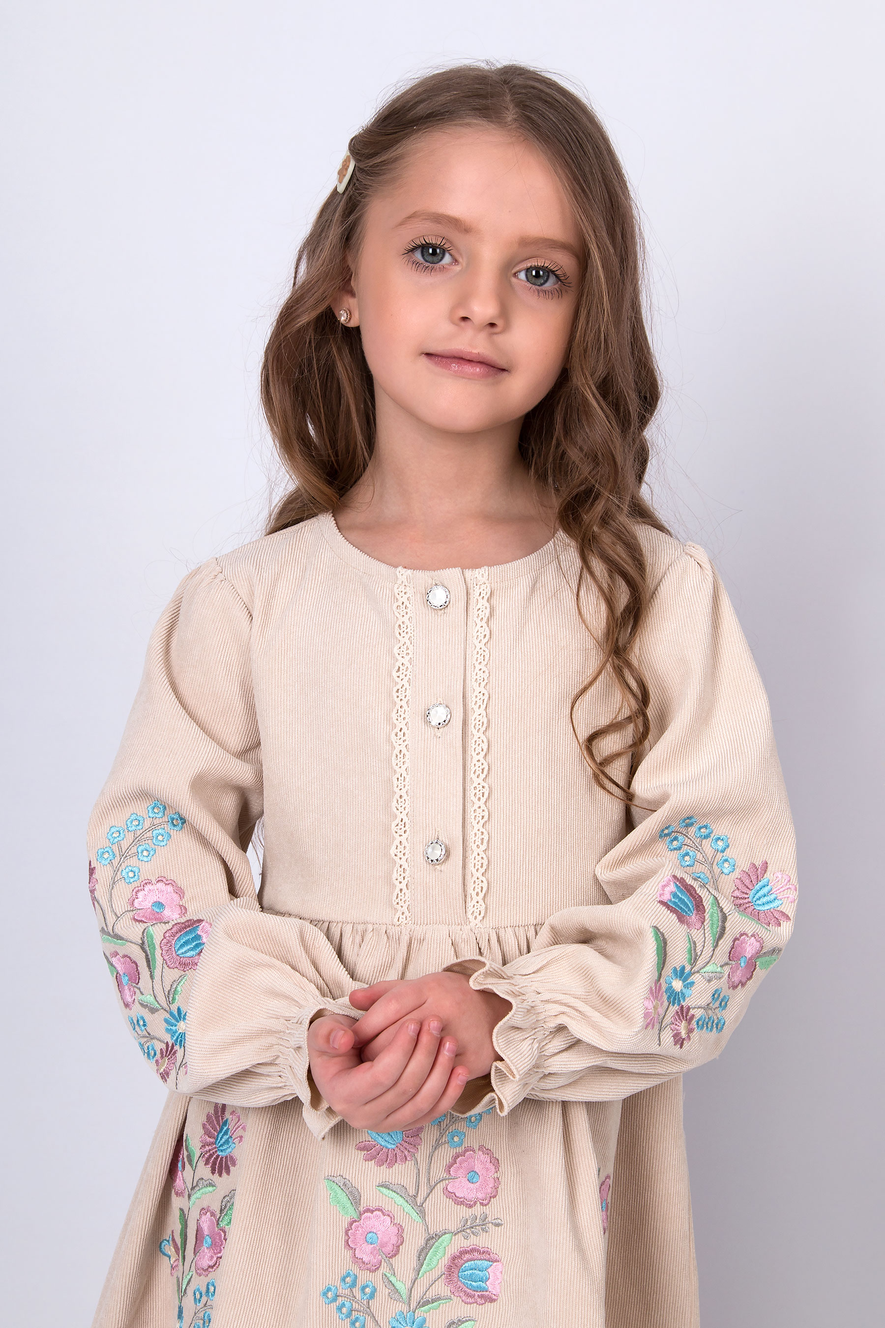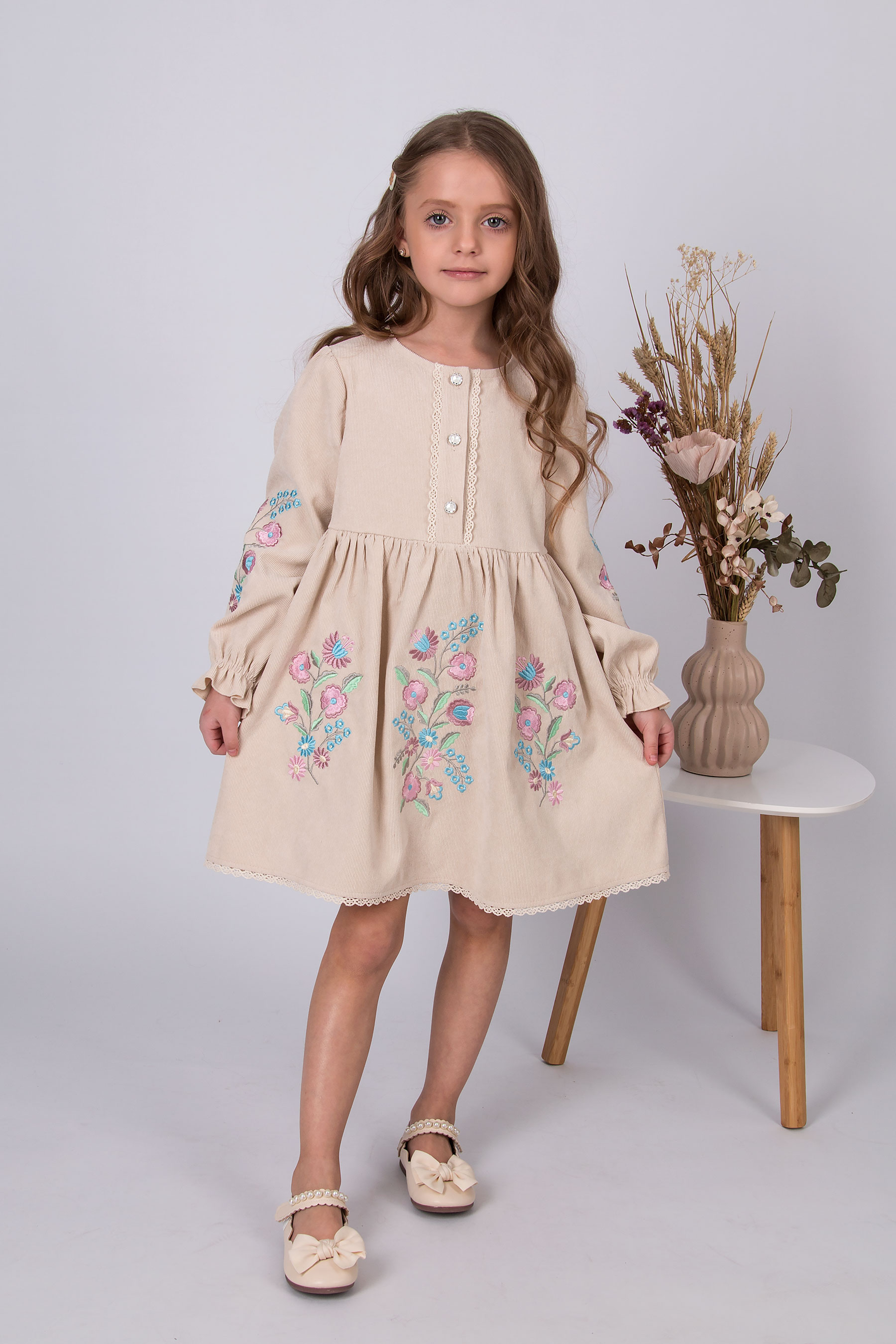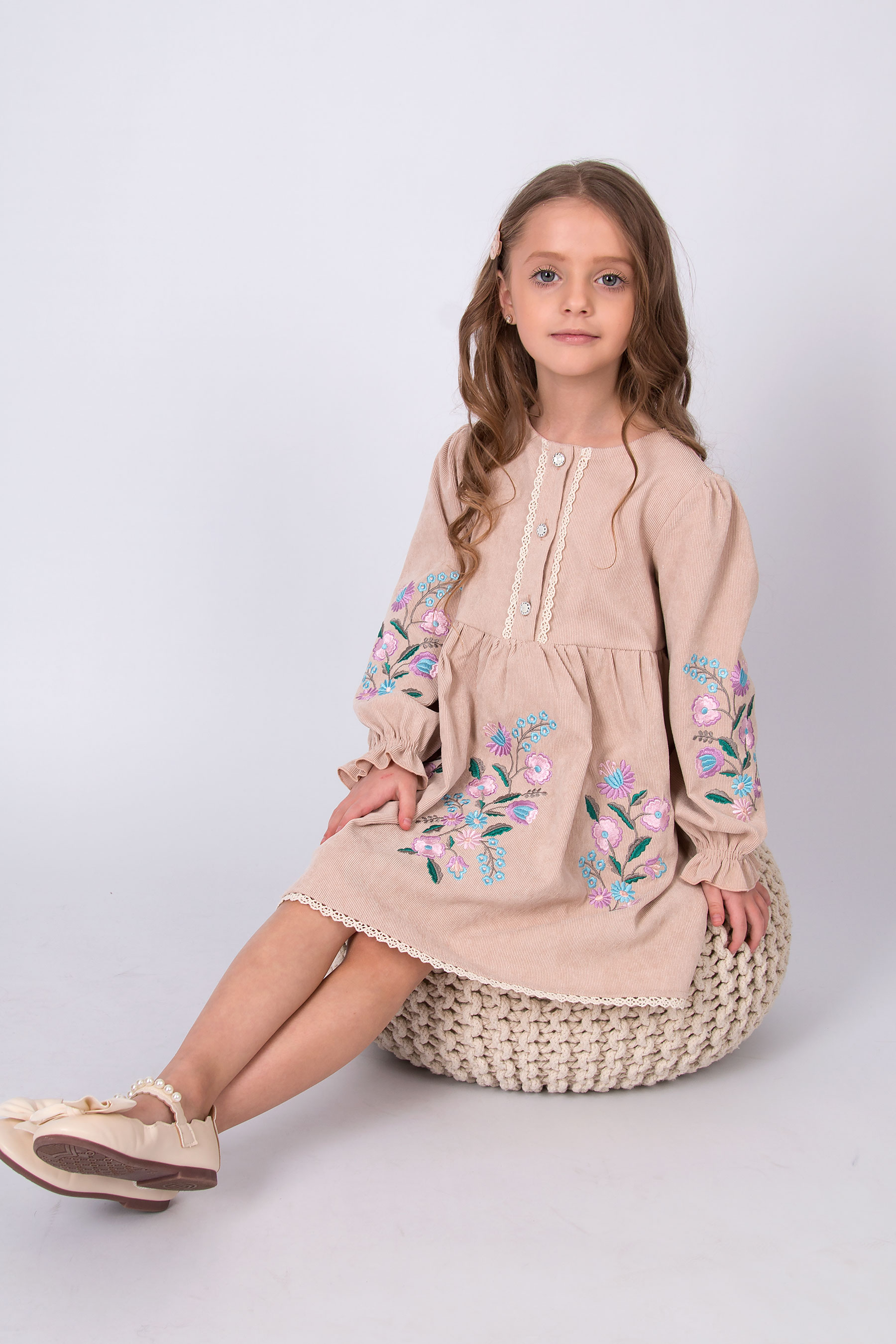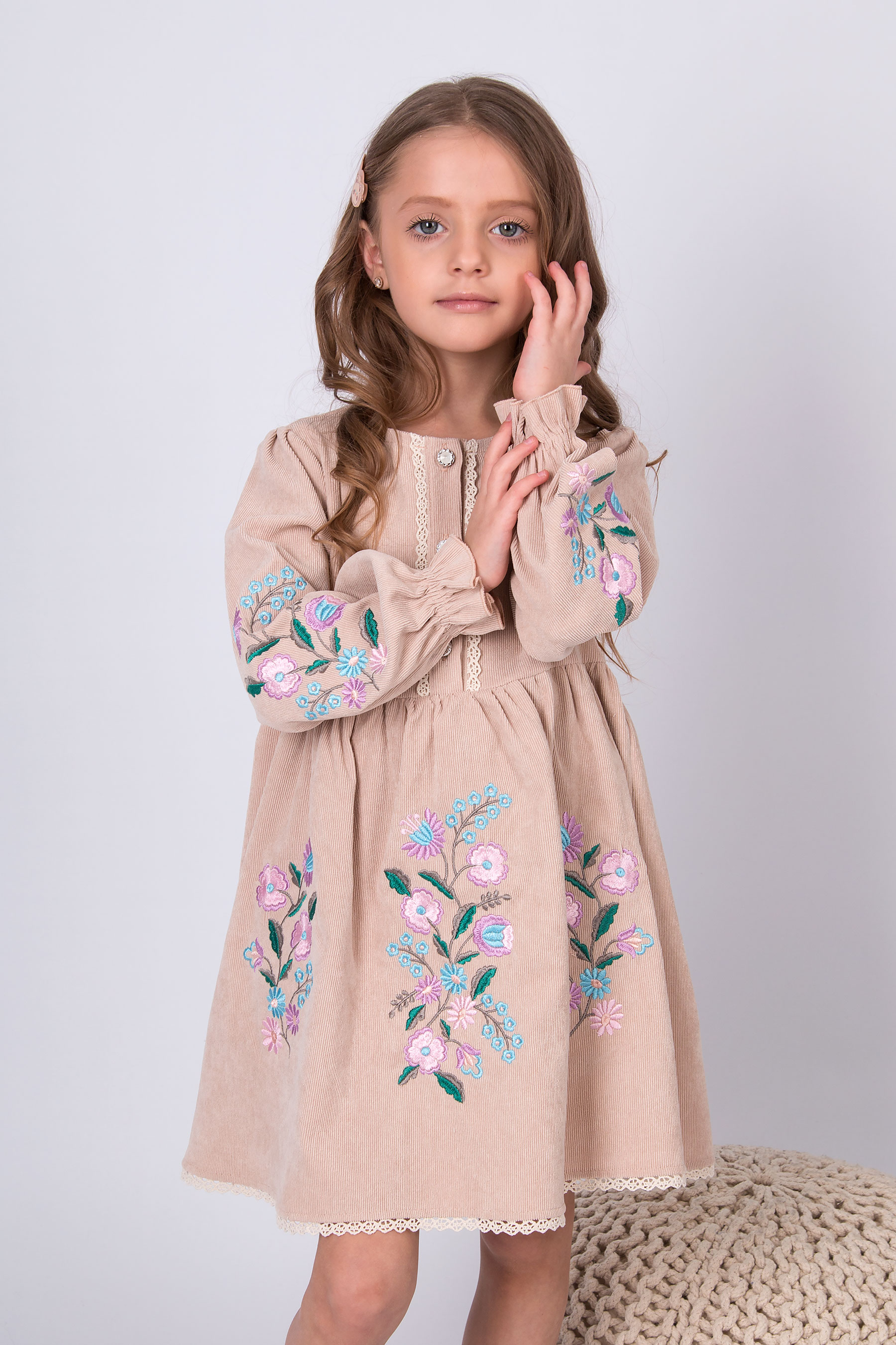 Вельветова сукня з відрізною лінією талії та зібраною спідницею. Ліф прямого крою, по центру планка із застібкою на ґудзики, оздоблена тасьмою. Рукав довгий, об’ємний, зі зборкою по низу. По краю спідниці — мереживо. Вишивка з квітковим орнаментом розташована на рукавах і по передній частині.