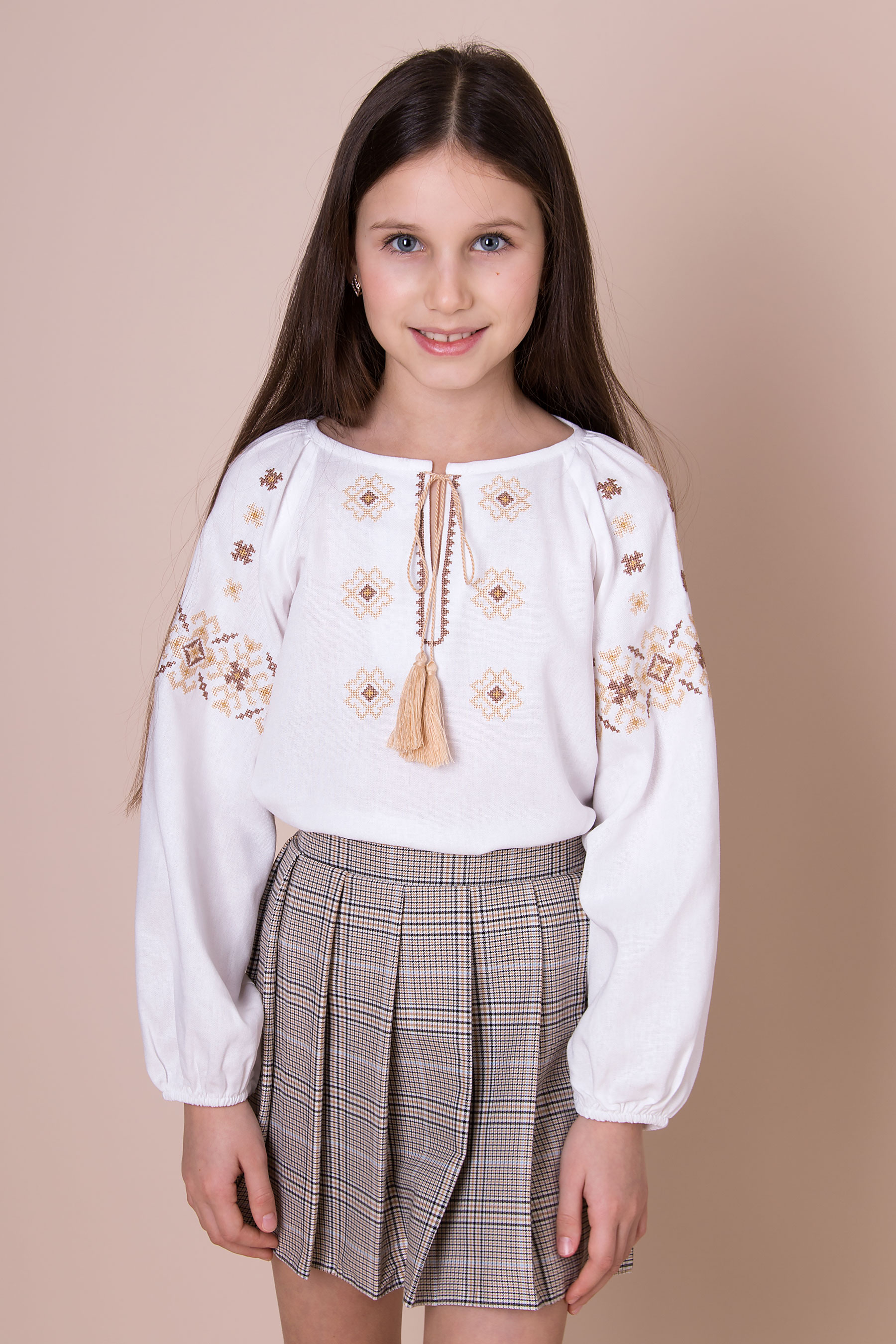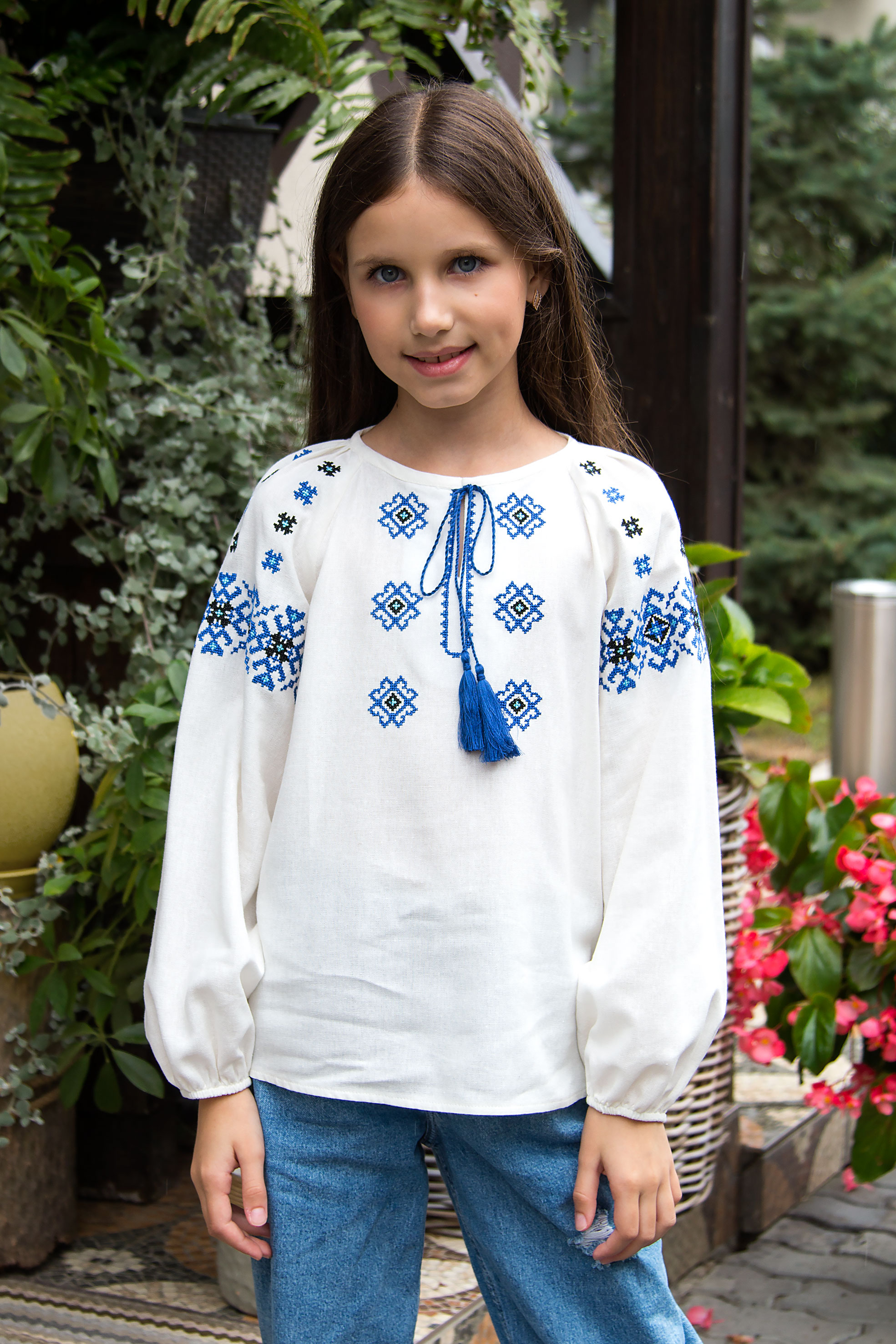 Вишиванка з льону, оздоблена геометричною вишивкою у відтінках синього. Модель має зав’язки з китицями на горловині та рукави на м’яких резинках. Поєднання народного орнаменту з простим кроєм надає образу сучасності та легкості.Поєднання стилю й глибокого змісту — з українським характером.
