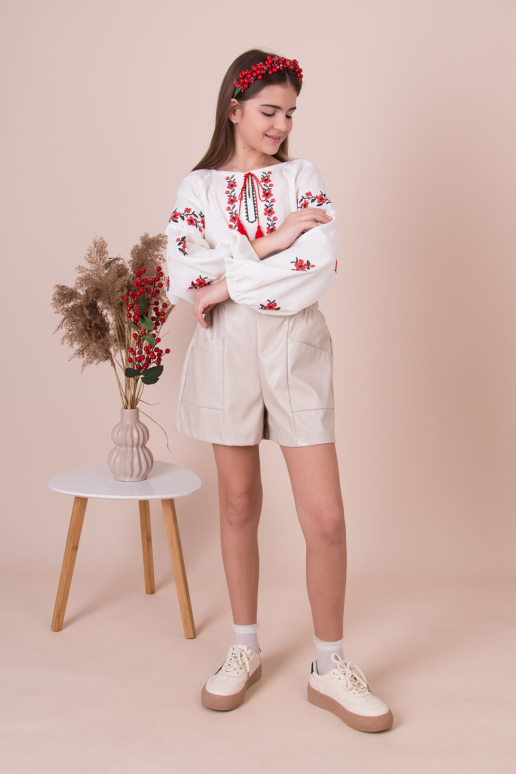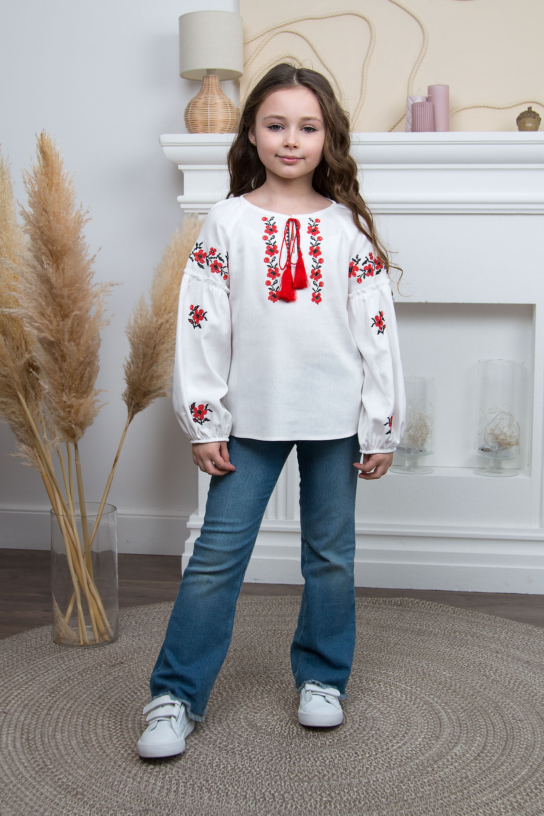 Вишиванка з льону з квітковим орнаментом, що додає виробу автентичності. Горловина оздоблена китицями, які утворюють стильний акцент. Рукави зібрані на резинці, що забезпечує зручну посадку. Модель поєднує традиційний характер із сучасним дизайном, створюючи гармонійний образ.