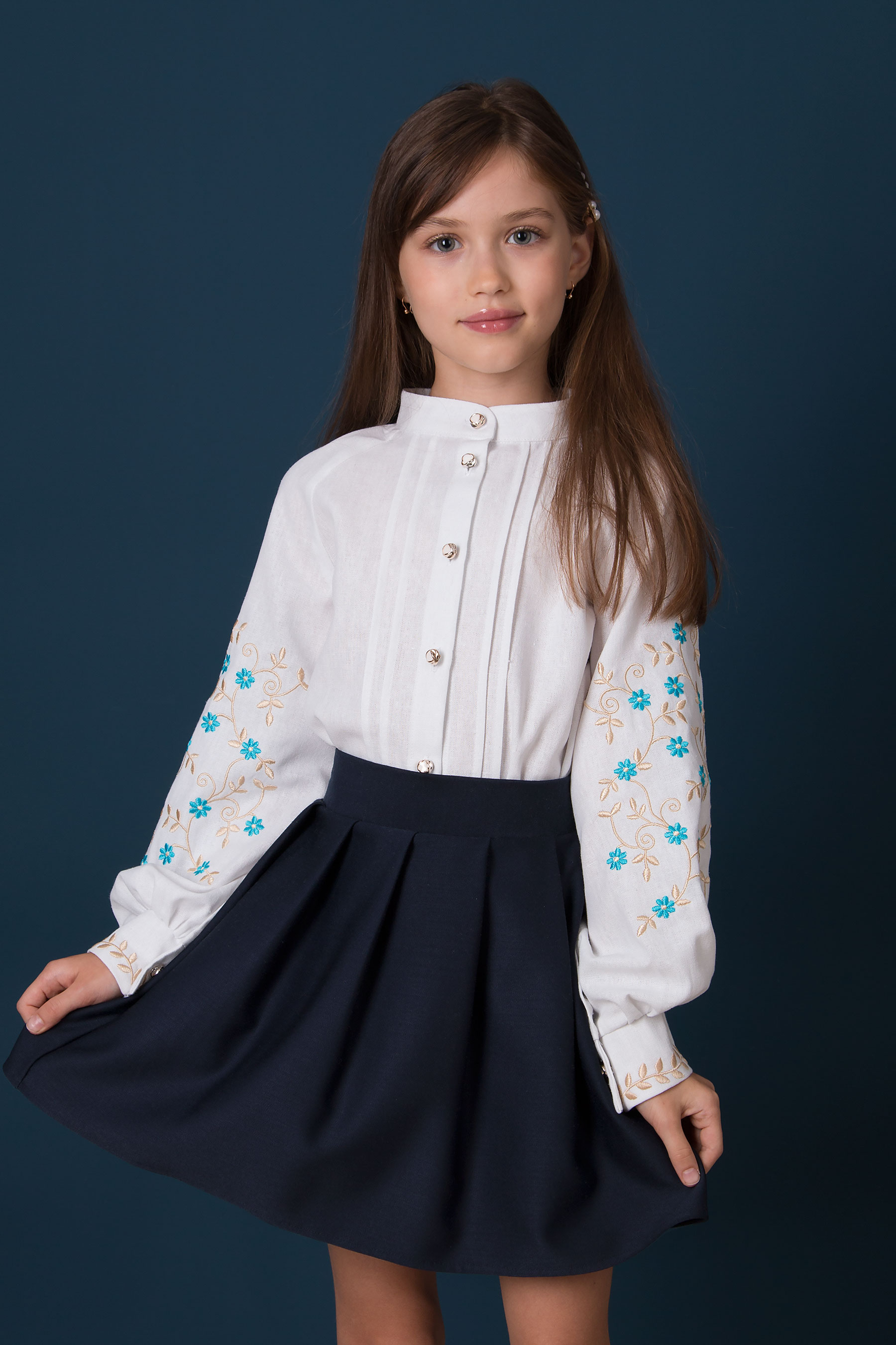 Дитяча вишиванка з льону з вишитими волошками на рукавах. Спереду модель оздоблена защіпами та застібкою на гудзики. Рукави декоровані ніжною вишивкою. Ідеальний вибір для школи чи урочистих подій.