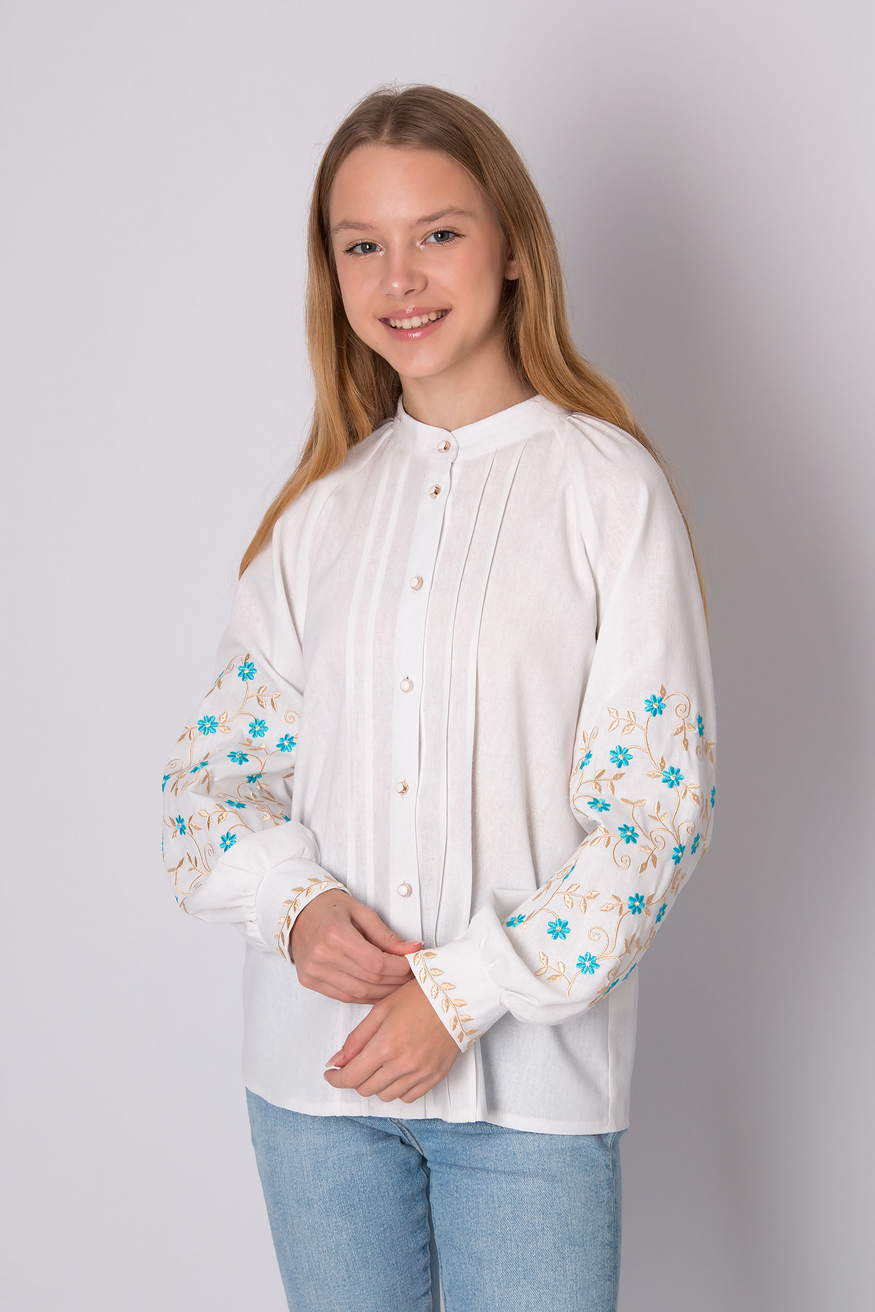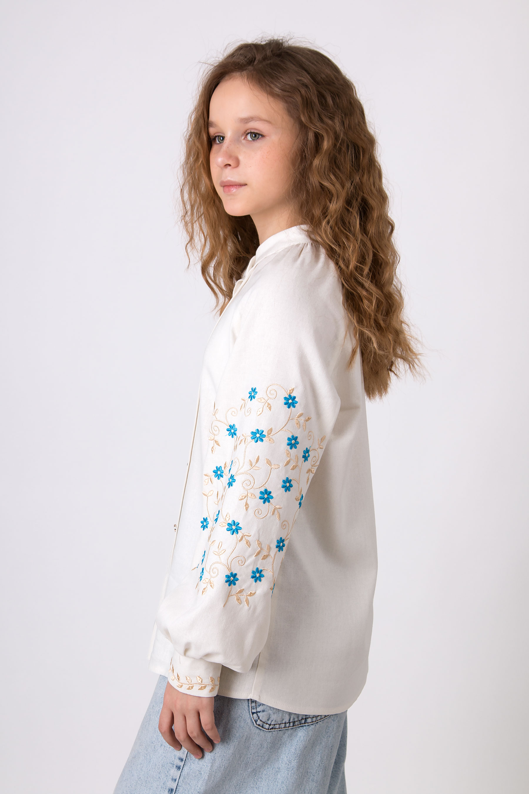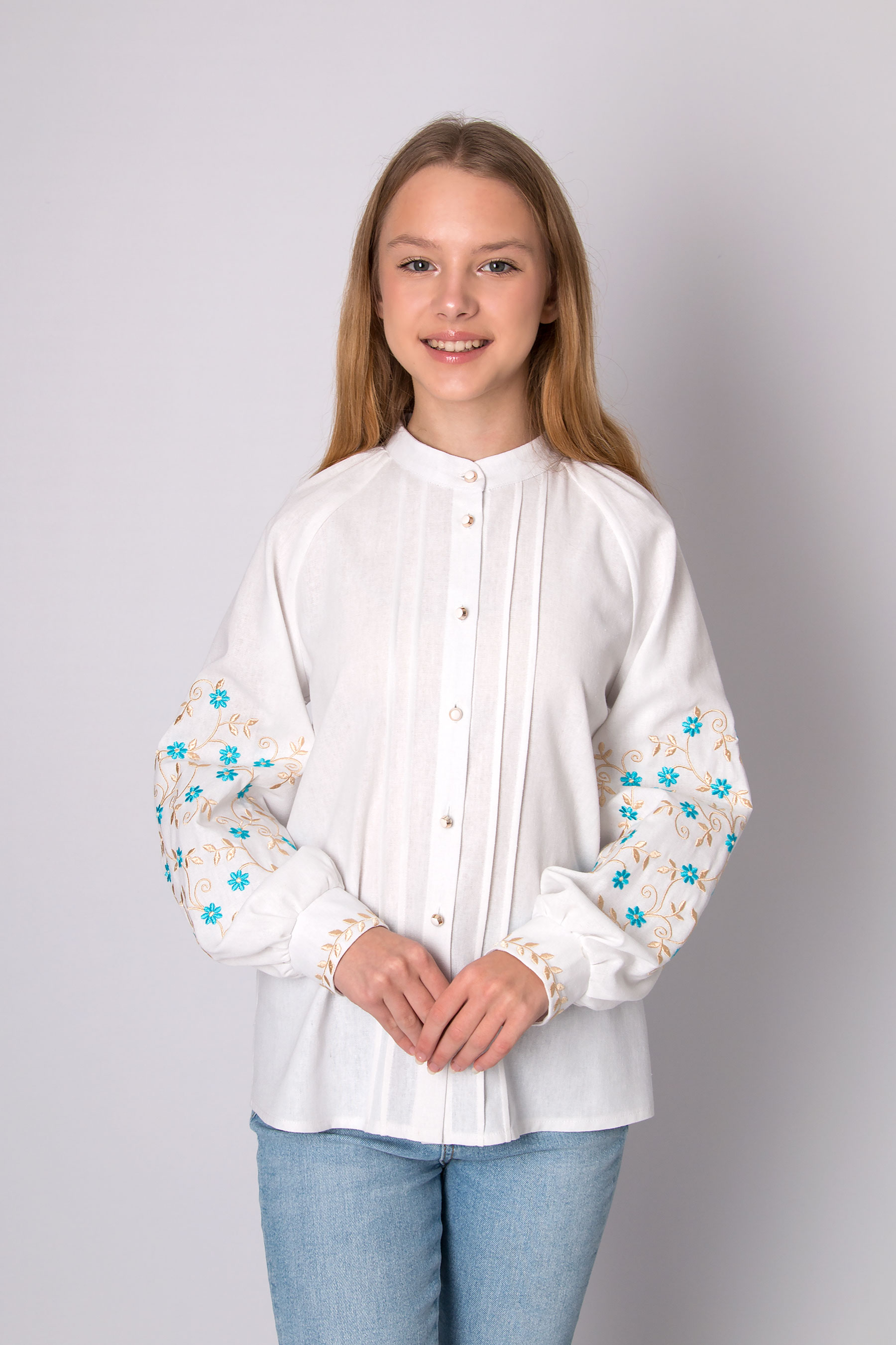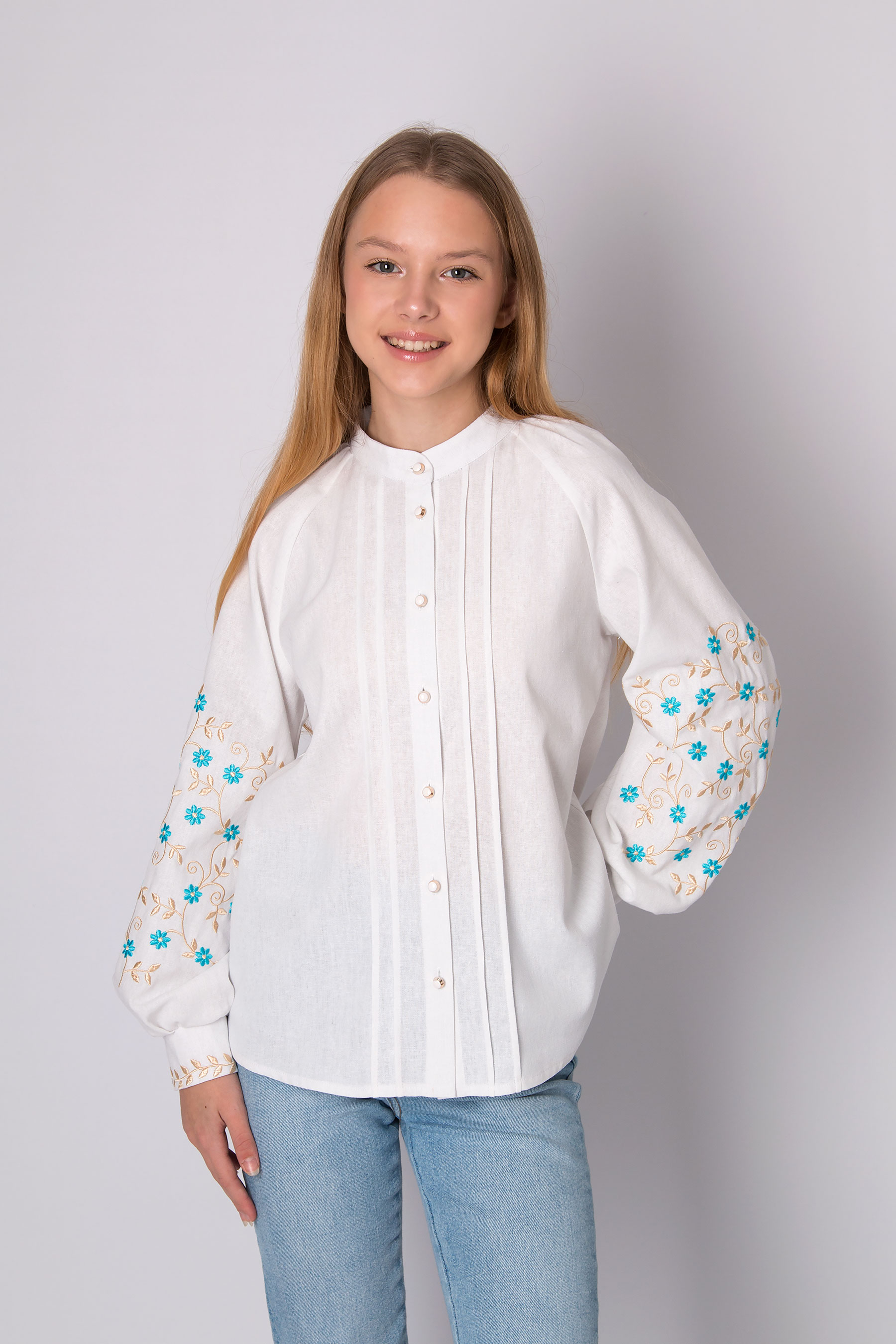 Вишиванка з льону з вишитими волошками на рукавах. Спереду модель оздоблена защіпами та застібкою на гудзики. Рукави декоровані ніжною вишивкою. Ідеальний вибір для школи чи урочистих подій.