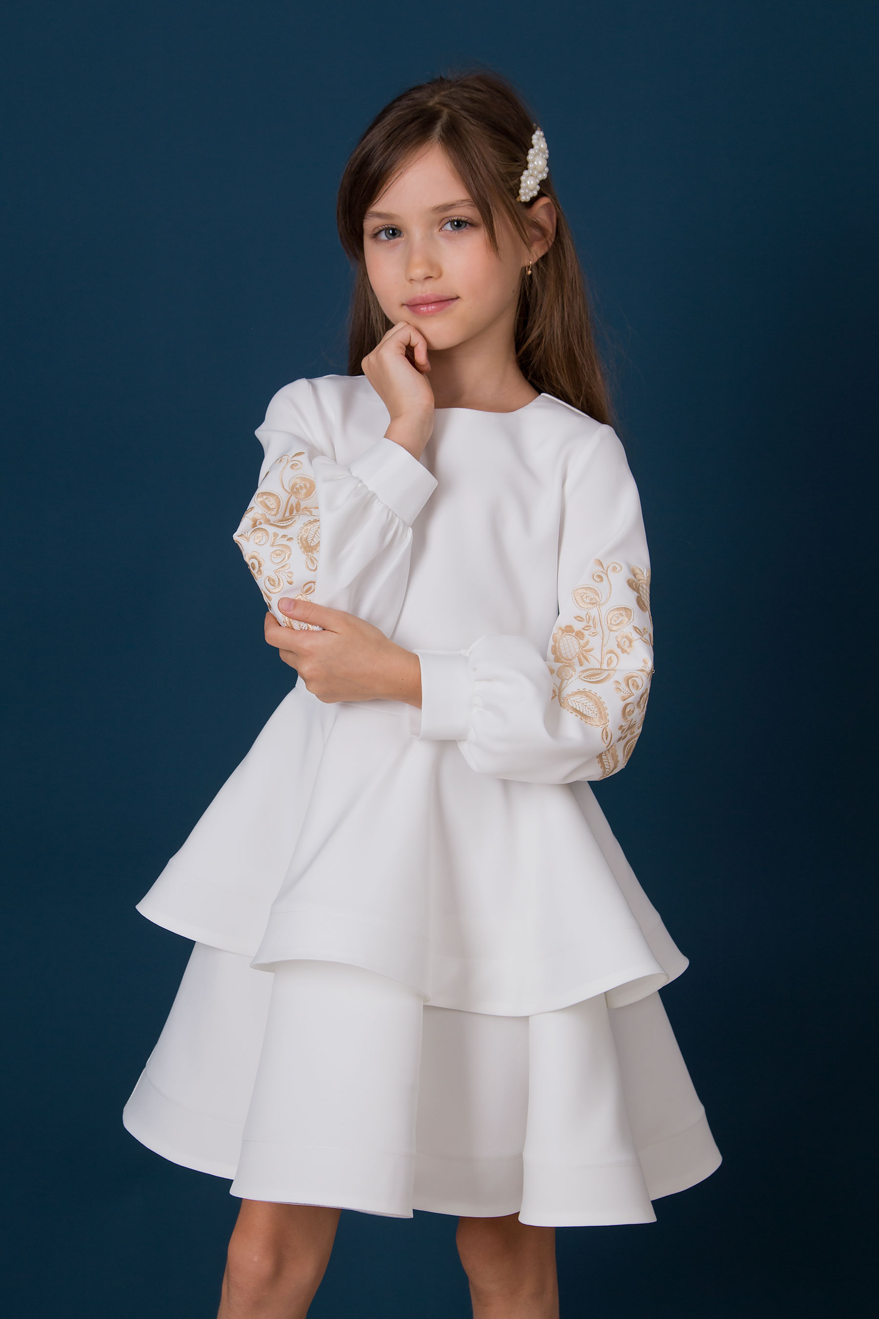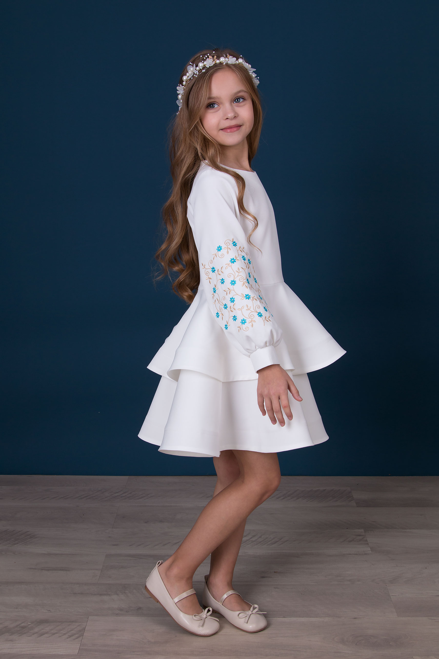 Дитяча сукня з костюмного трикотажу, створена для святкових подій та особливих моментів. Модель має подвійний шар спідниці, що робить силует більш об’ємним та виразним. Рукави прикрашені акуратною вишивкою, яка додає сукні ніжності. Сукня виглядає гармонійно та підкреслює святковий образ.