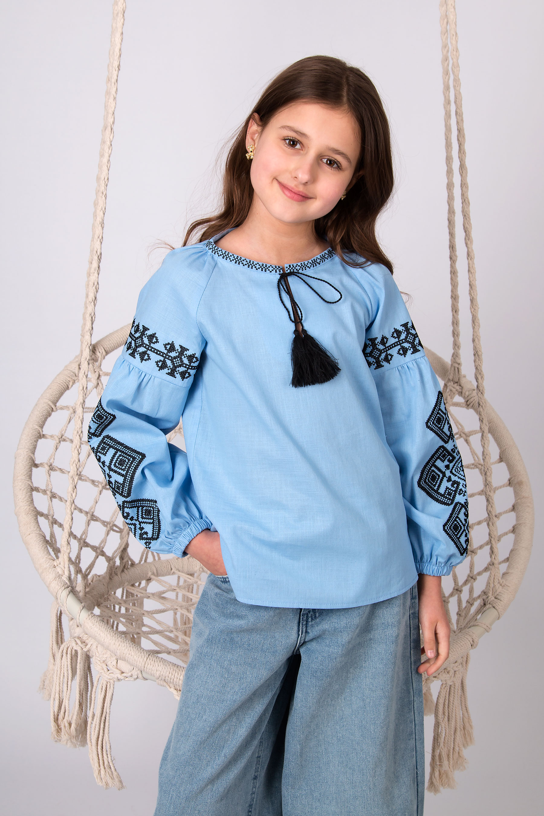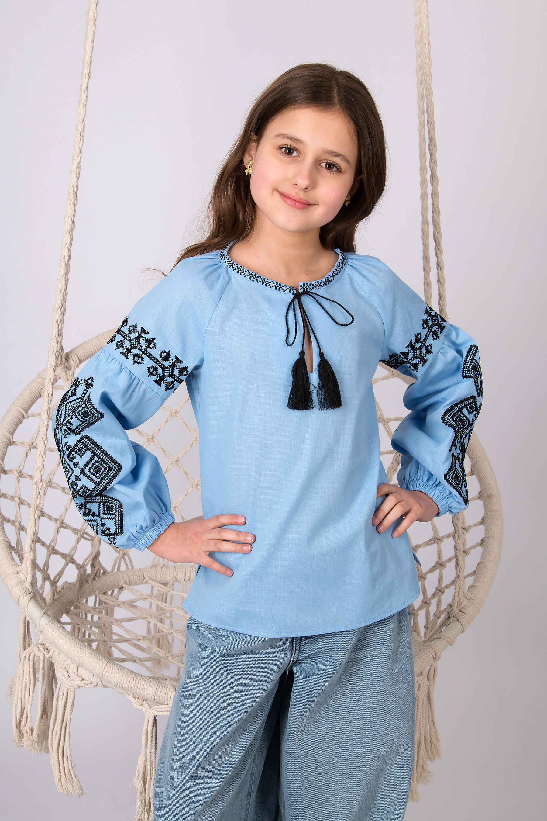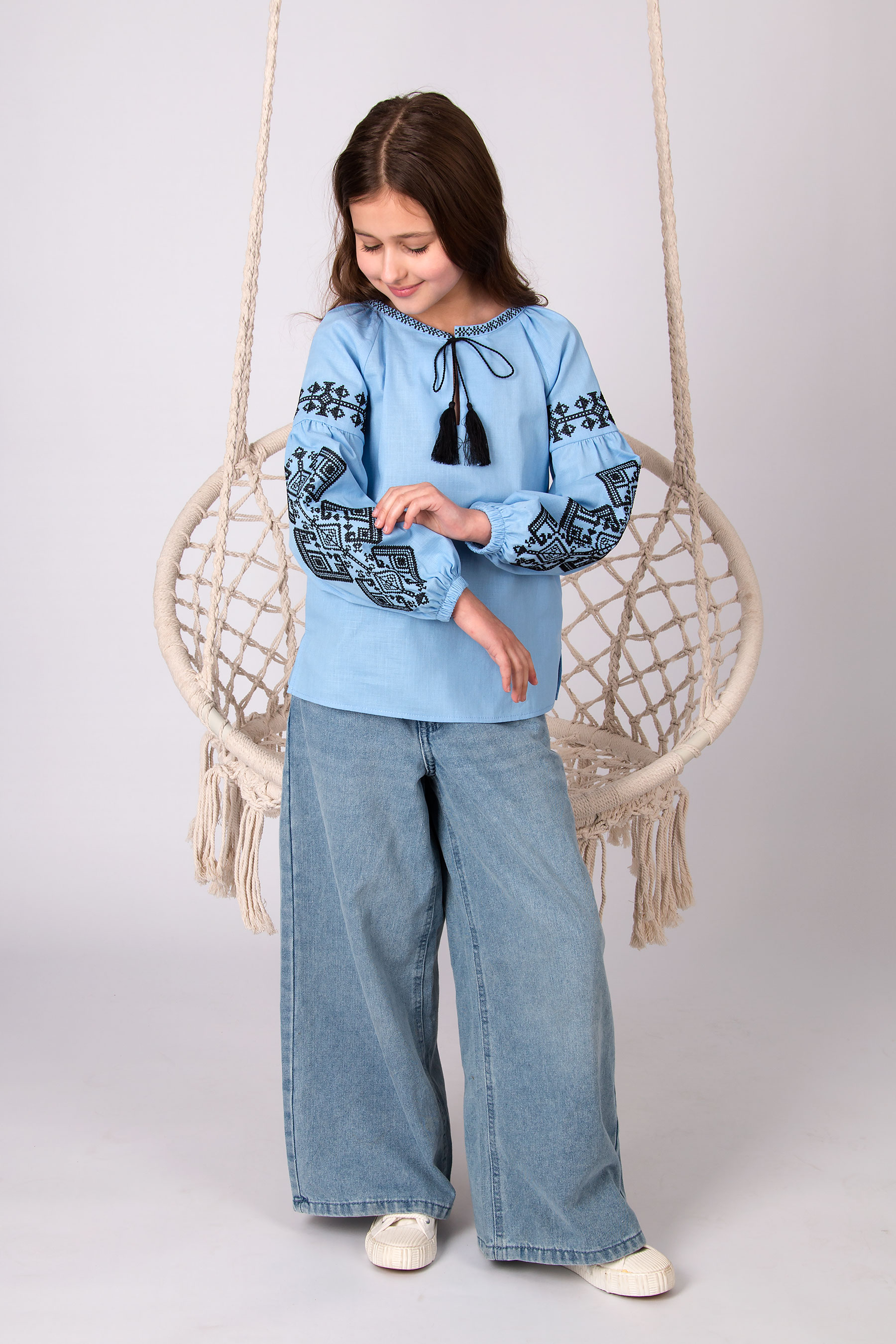 Вишиванка з українським характером, у якій акцент зроблено на вишивці рукавів і оформленні горловини. Орнамент символізує зв’язок поколінь та збереження традицій у сучасному виконанні. Модель із широкими рукавами, оздобленими вишивкою. Горловина з розрізом зав’язується на китиці, що підкреслює традиційний український характер виробу.