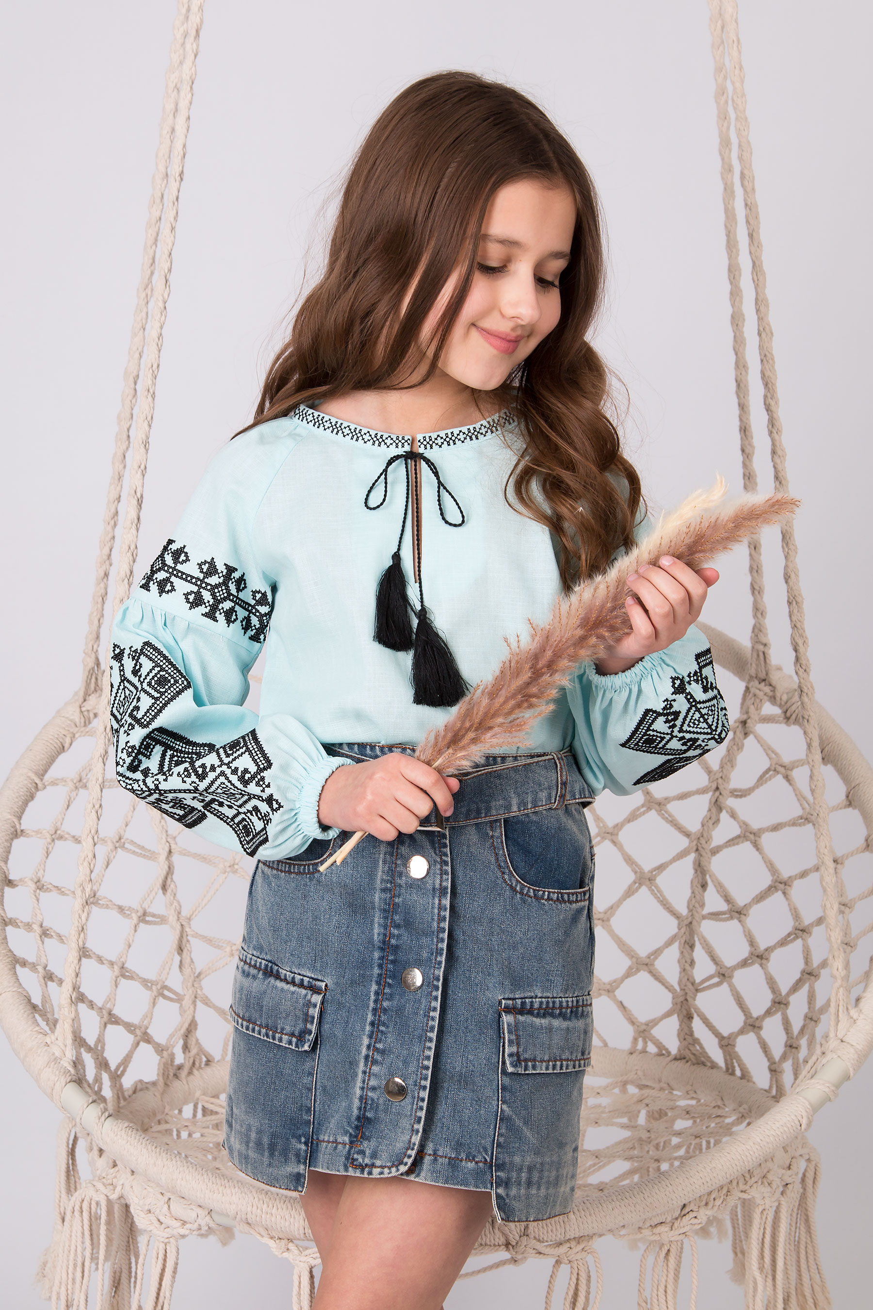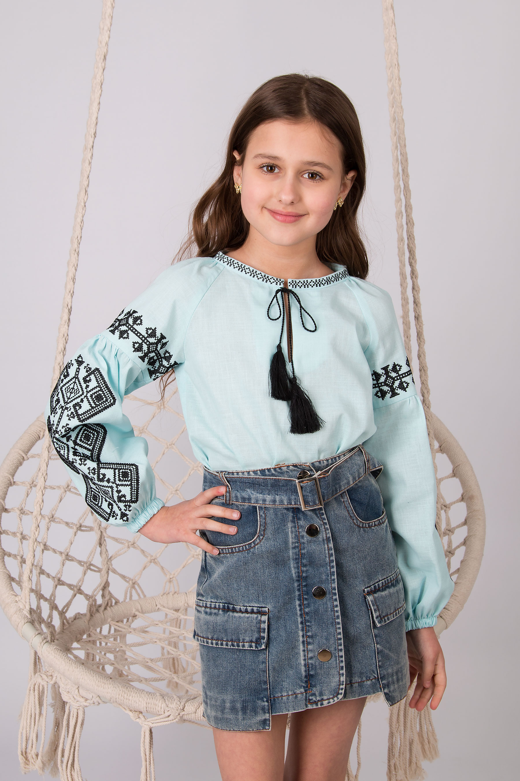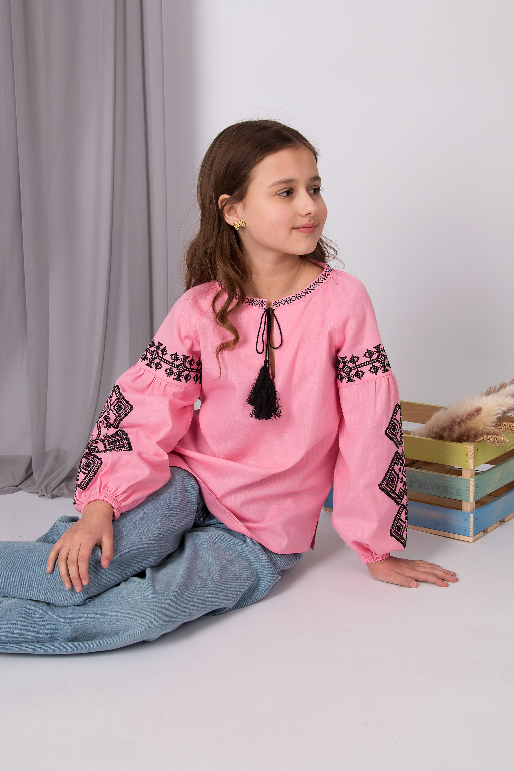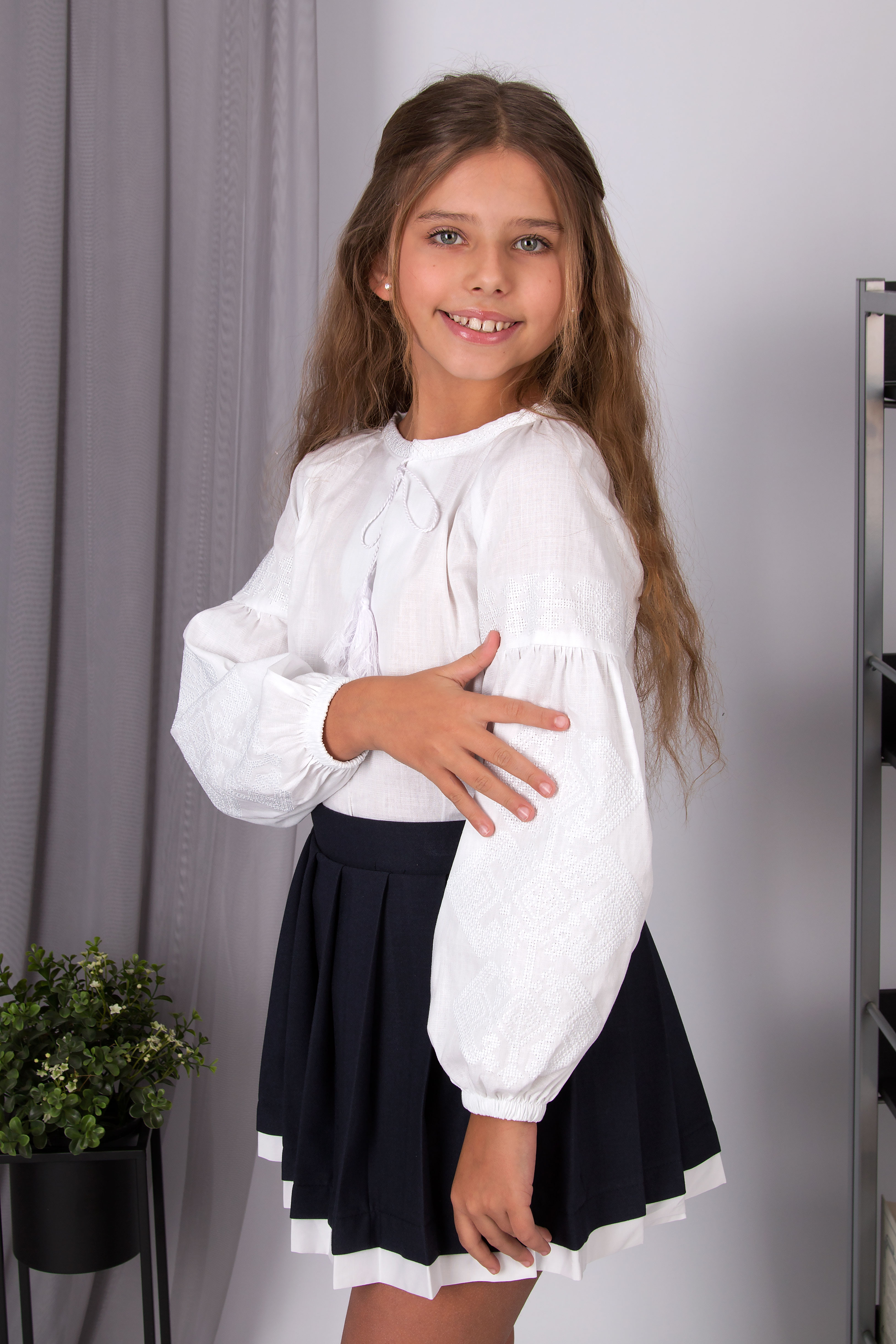 Вишиванка з українським характером, у якій акцент зроблено на вишивці рукавів і оформленні горловини. Орнамент символізує зв’язок поколінь та збереження традицій у сучасному виконанні. Модель із широкими рукавами, оздобленими вишивкою. Горловина з розрізом зав’язується на китиці, що підкреслює традиційний український характер виробу.