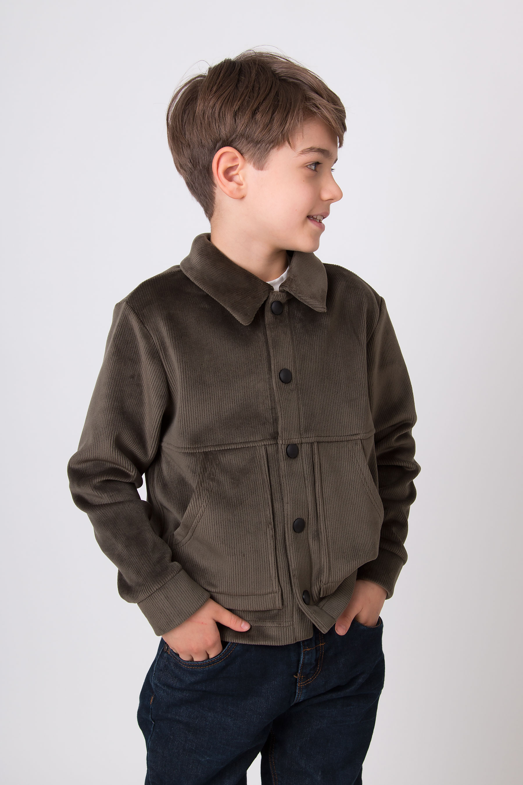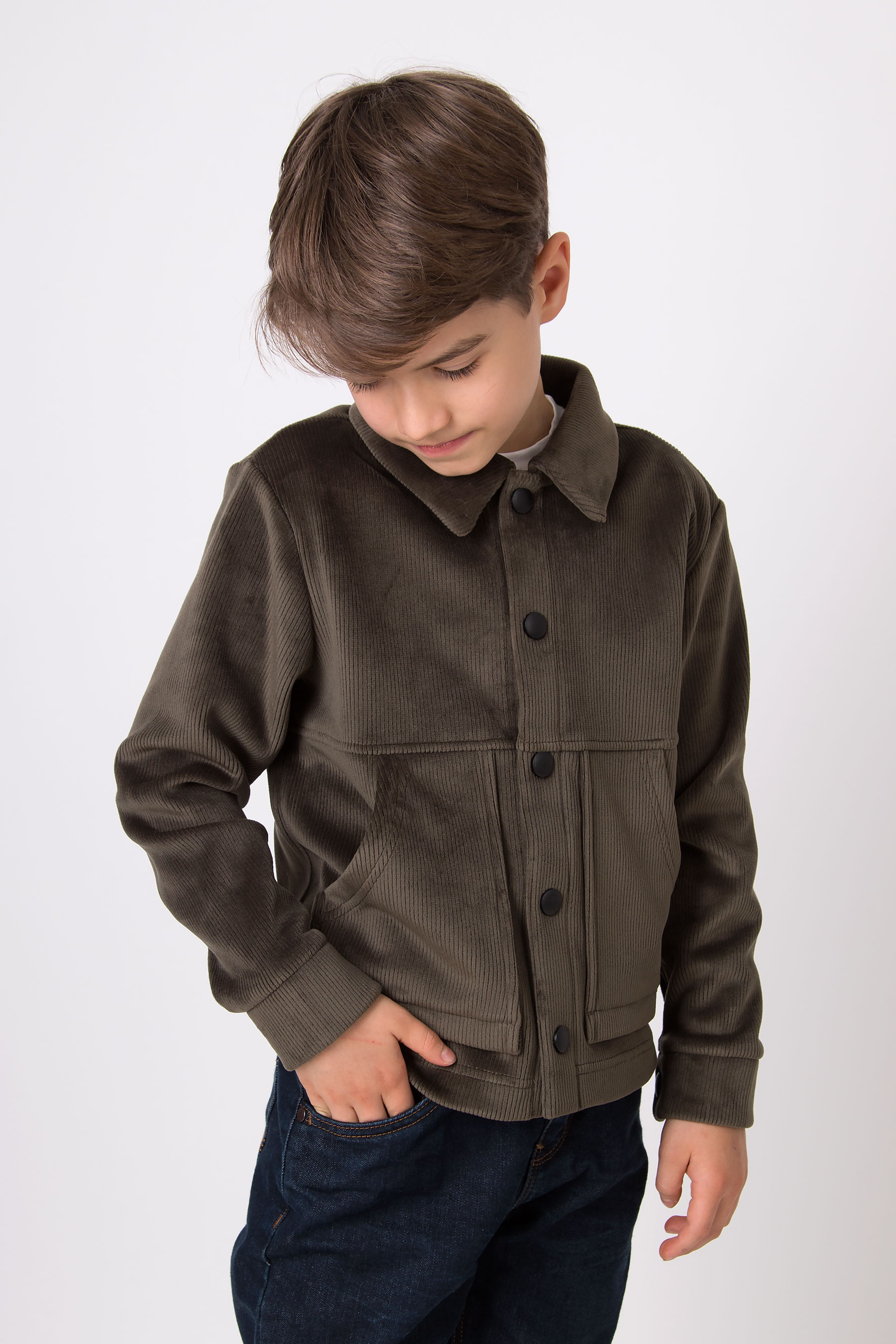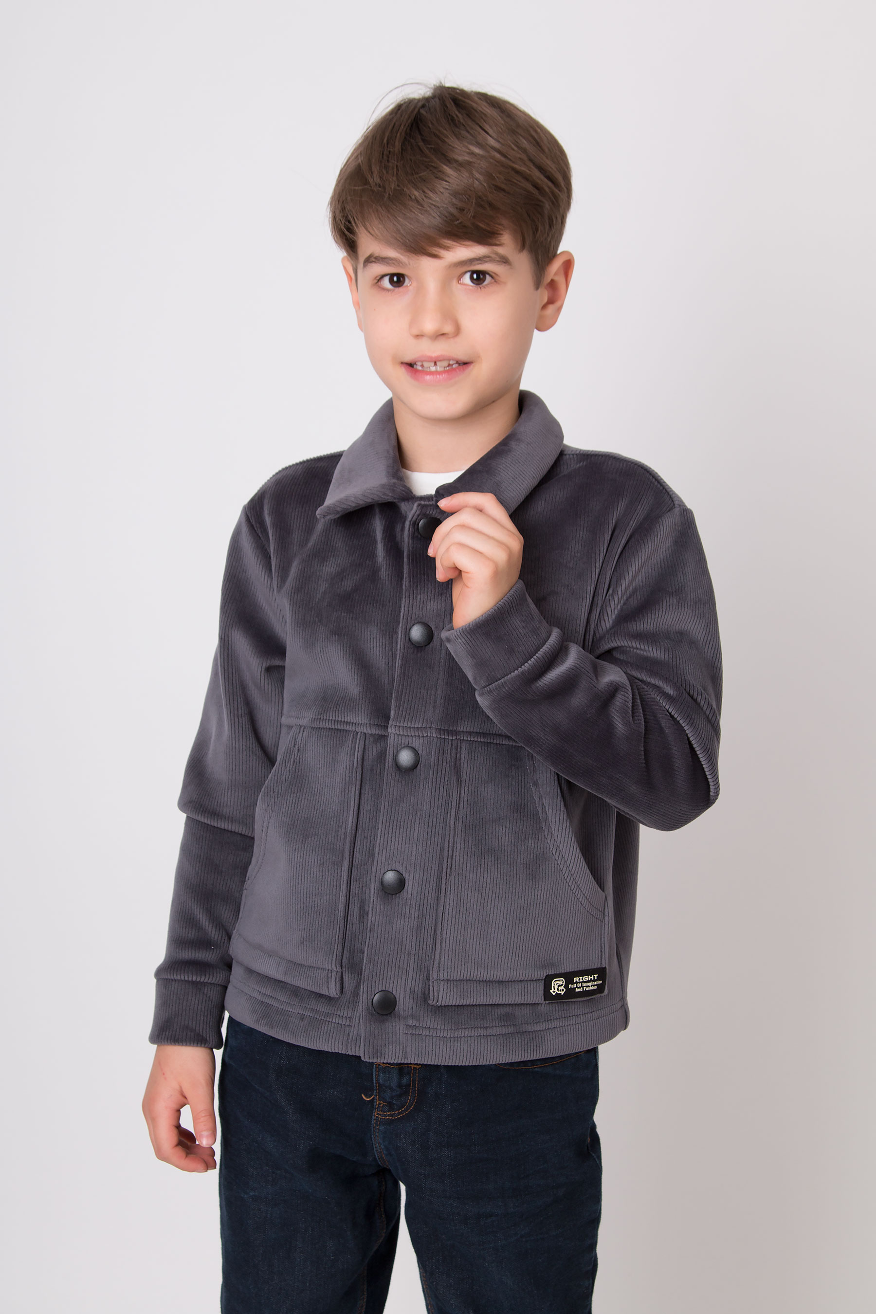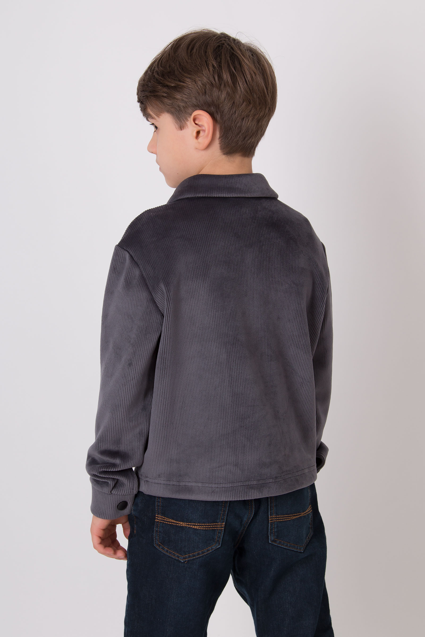 Верхня сорочка з м’якого вельвету має класичний комір, застібку на кнопки та накладні кишені для зручності. Комфортна для школи, прогулянок і повсякденного носіння.