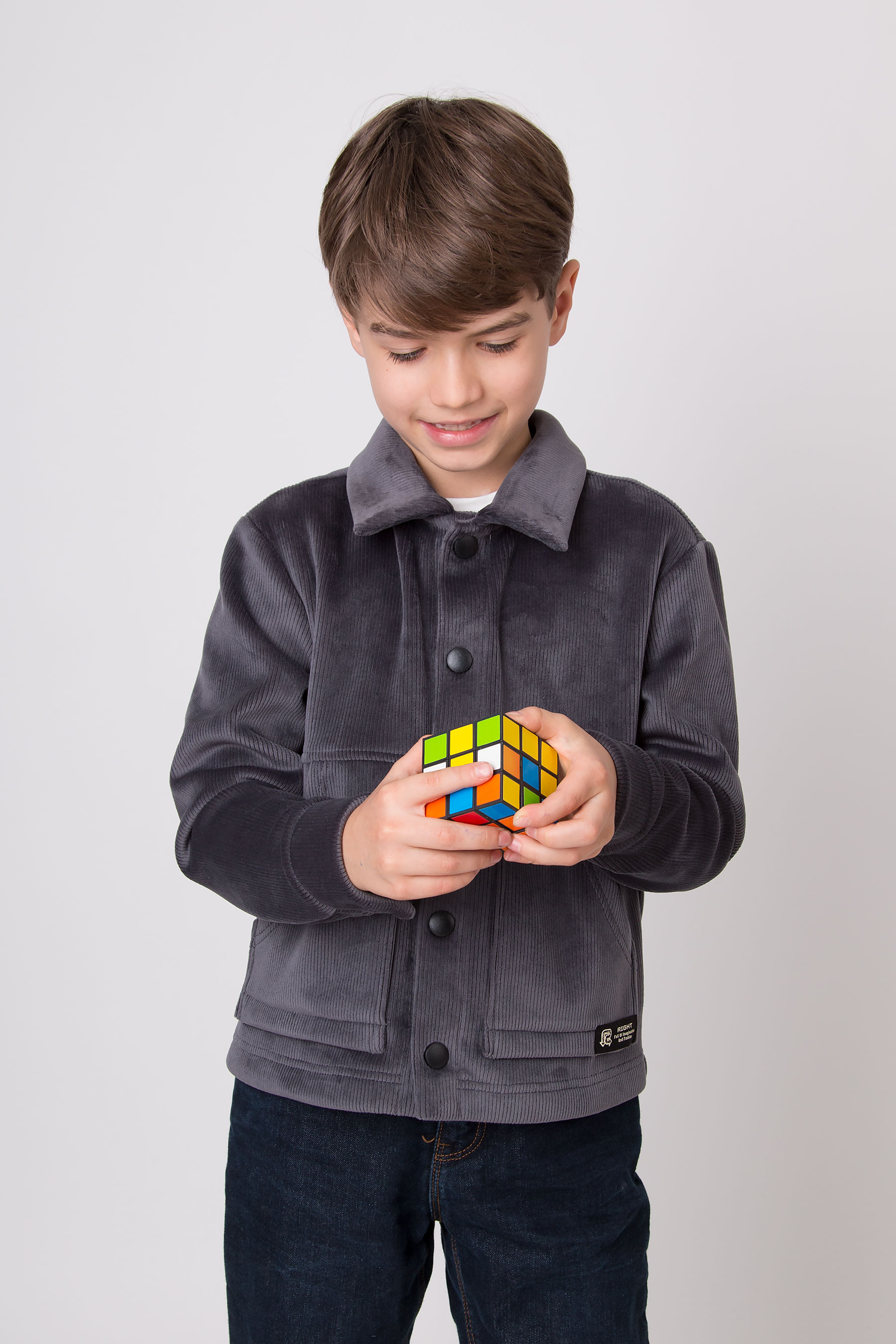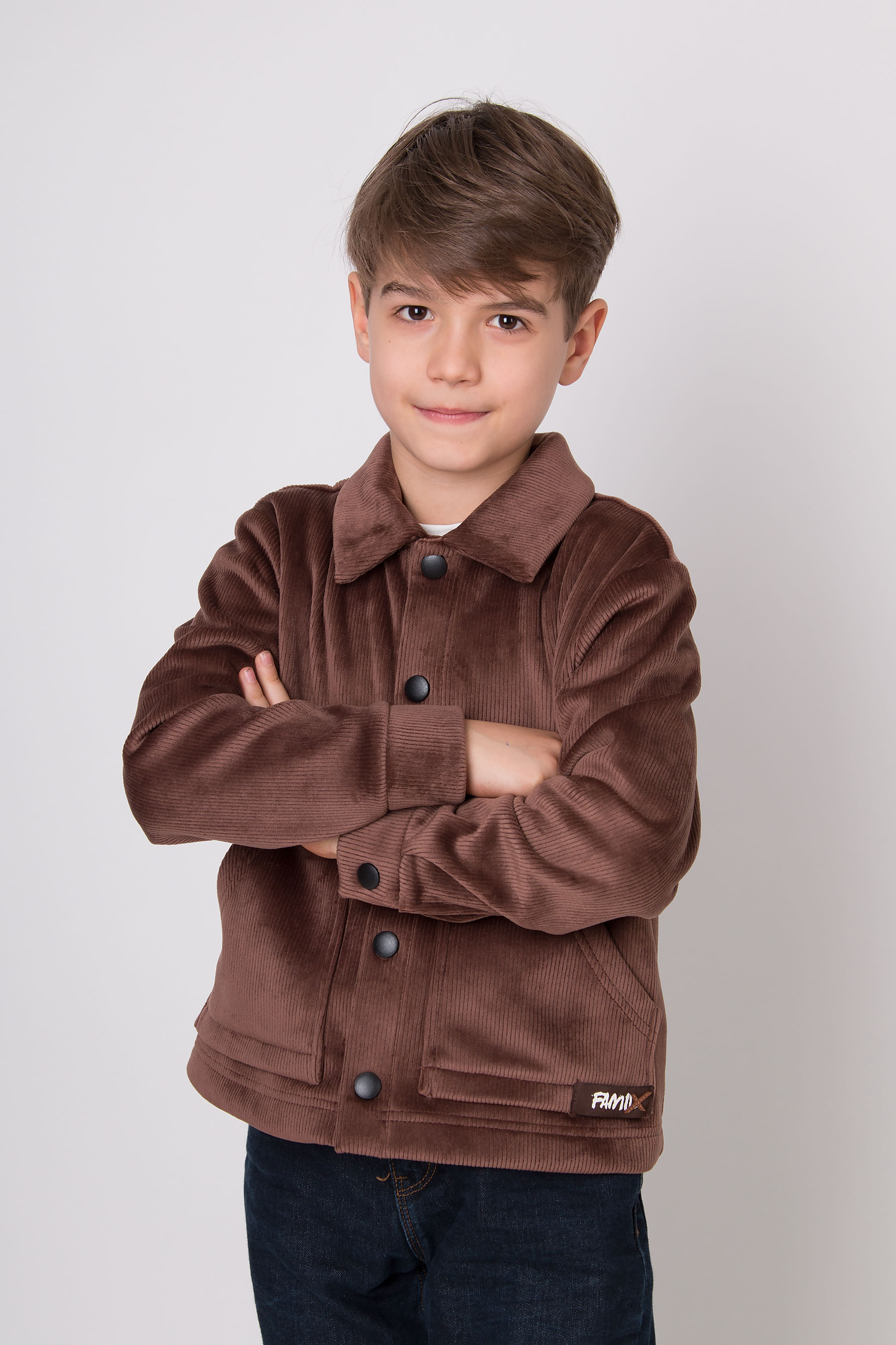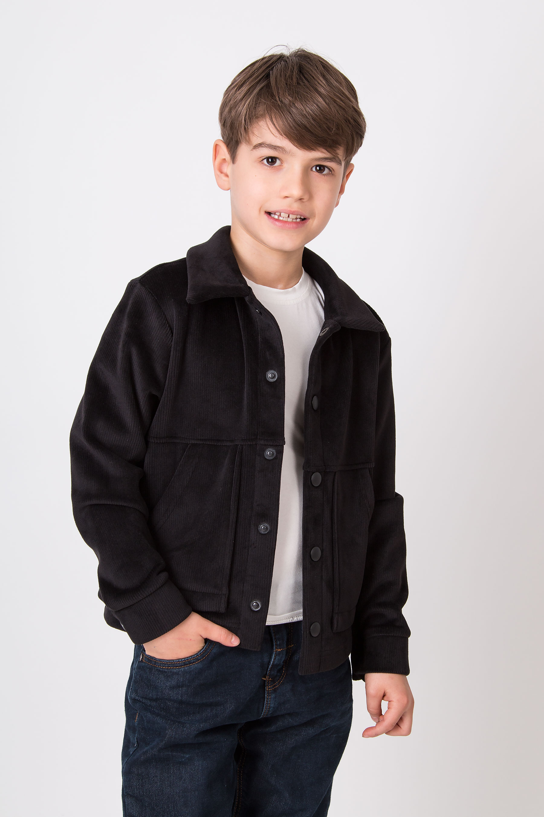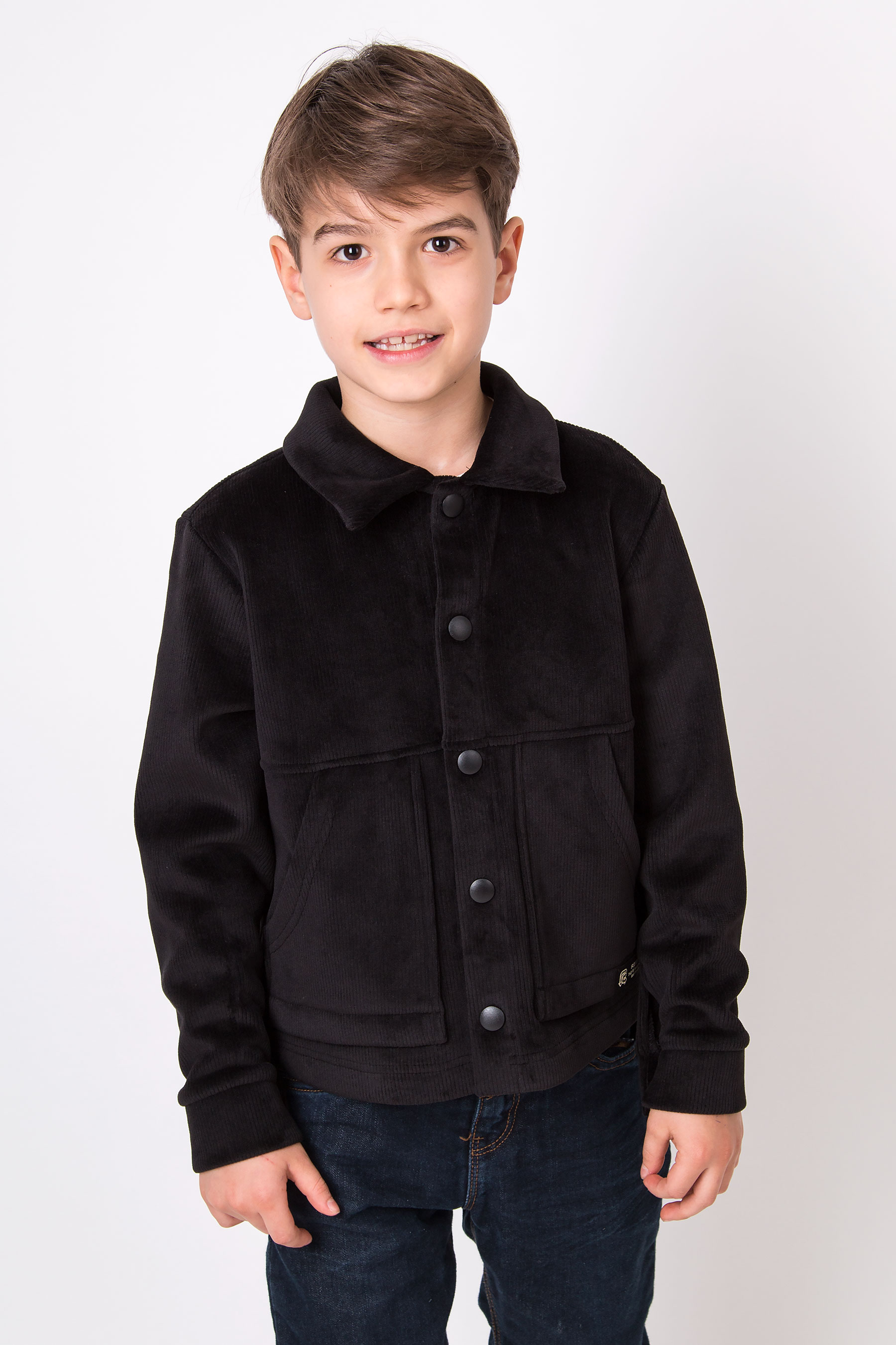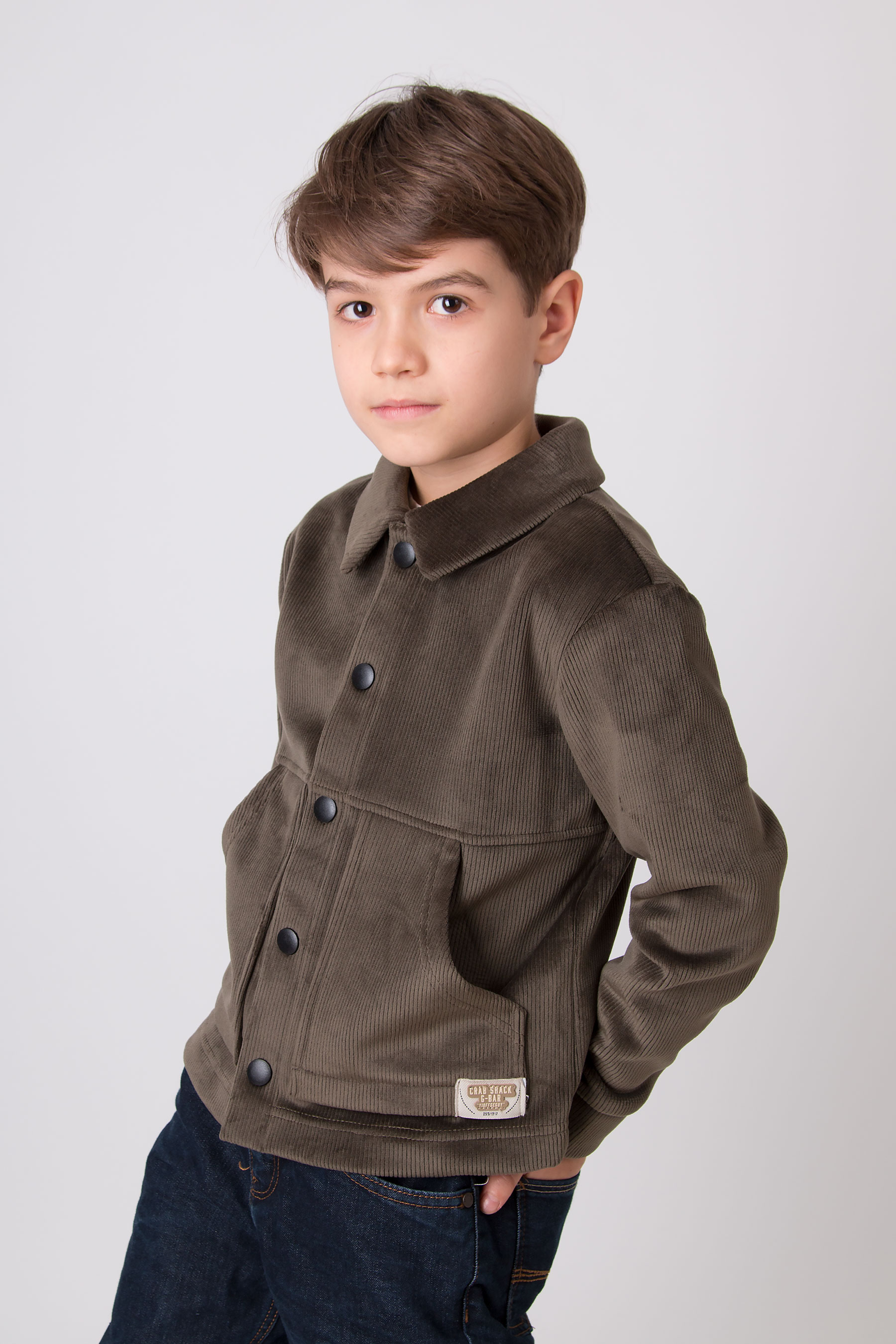 Верхня сорочка з м’якого вельвету має класичний комір, застібку на кнопки та накладні кишені для зручності. Комфортна для школи, прогулянок і повсякденного носіння.
