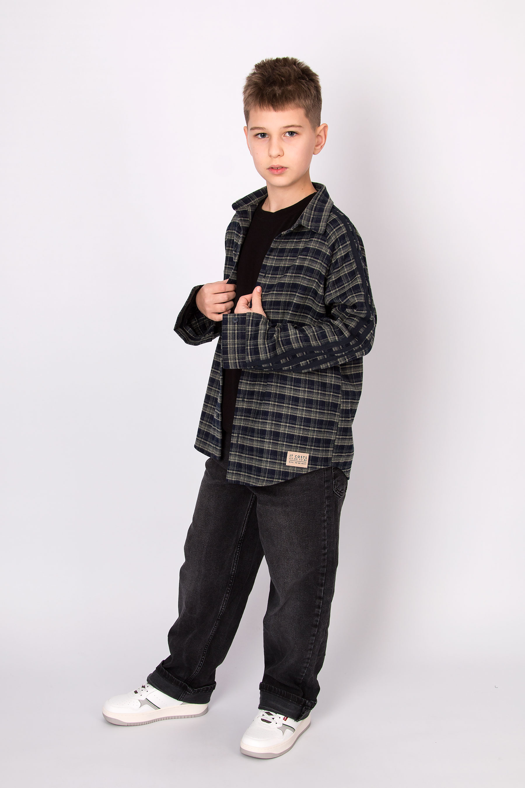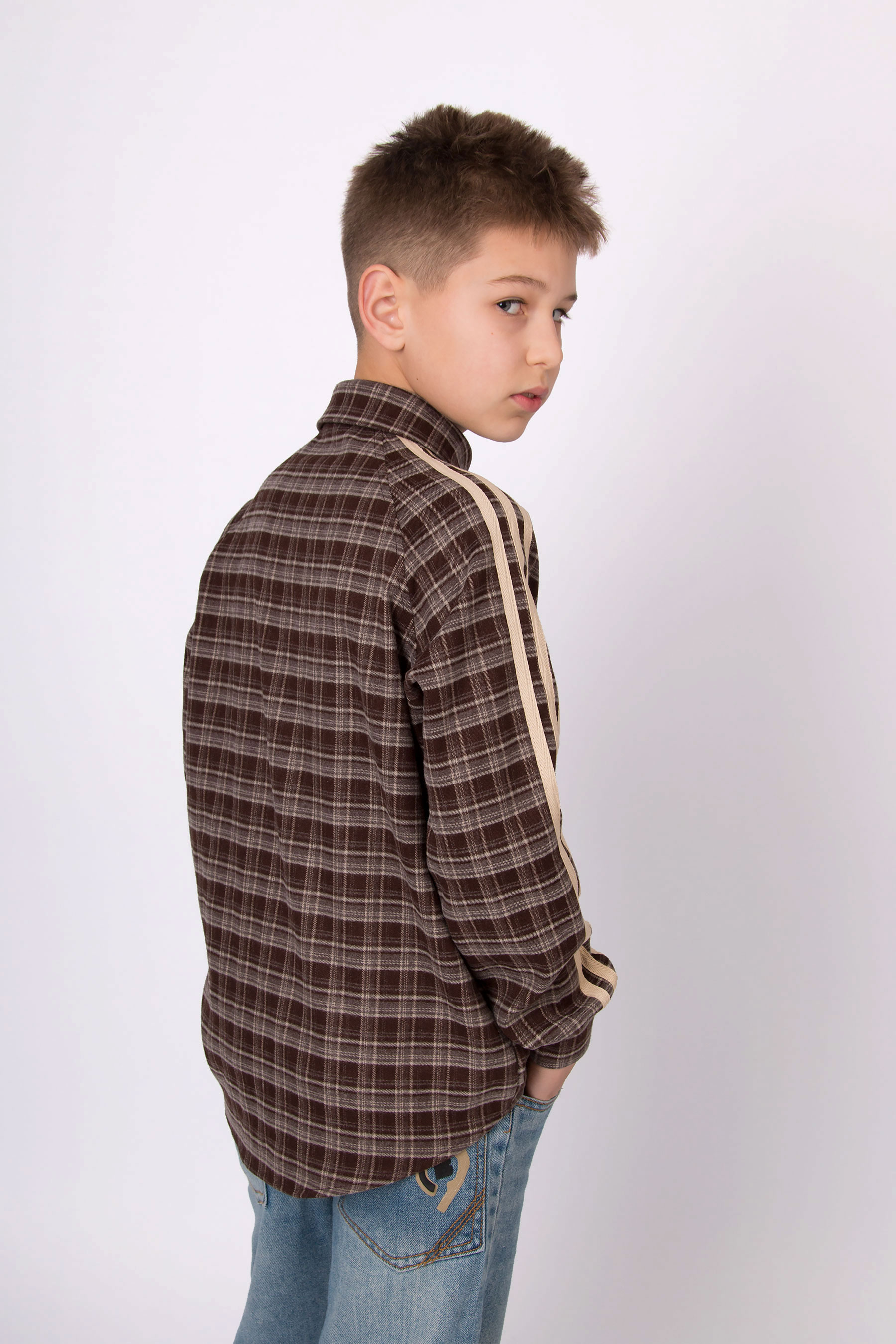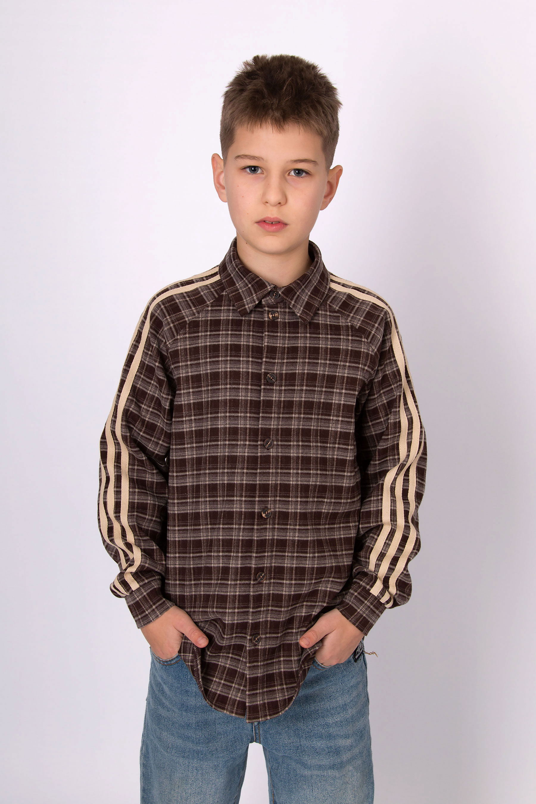 Сорочка з текстильної тканини з браш-ефектом, м’яка та приємна на дотик. Модель у клітинку, з класичним коміром та застібкою на ґудзики. Вздовж рукавів розміщені контрастні лампаси, що додають виробу сучасного й спортивного стилю. Може використовуватися у різних поєднаннях — від базової сорочки до легкого верхнього одягу.