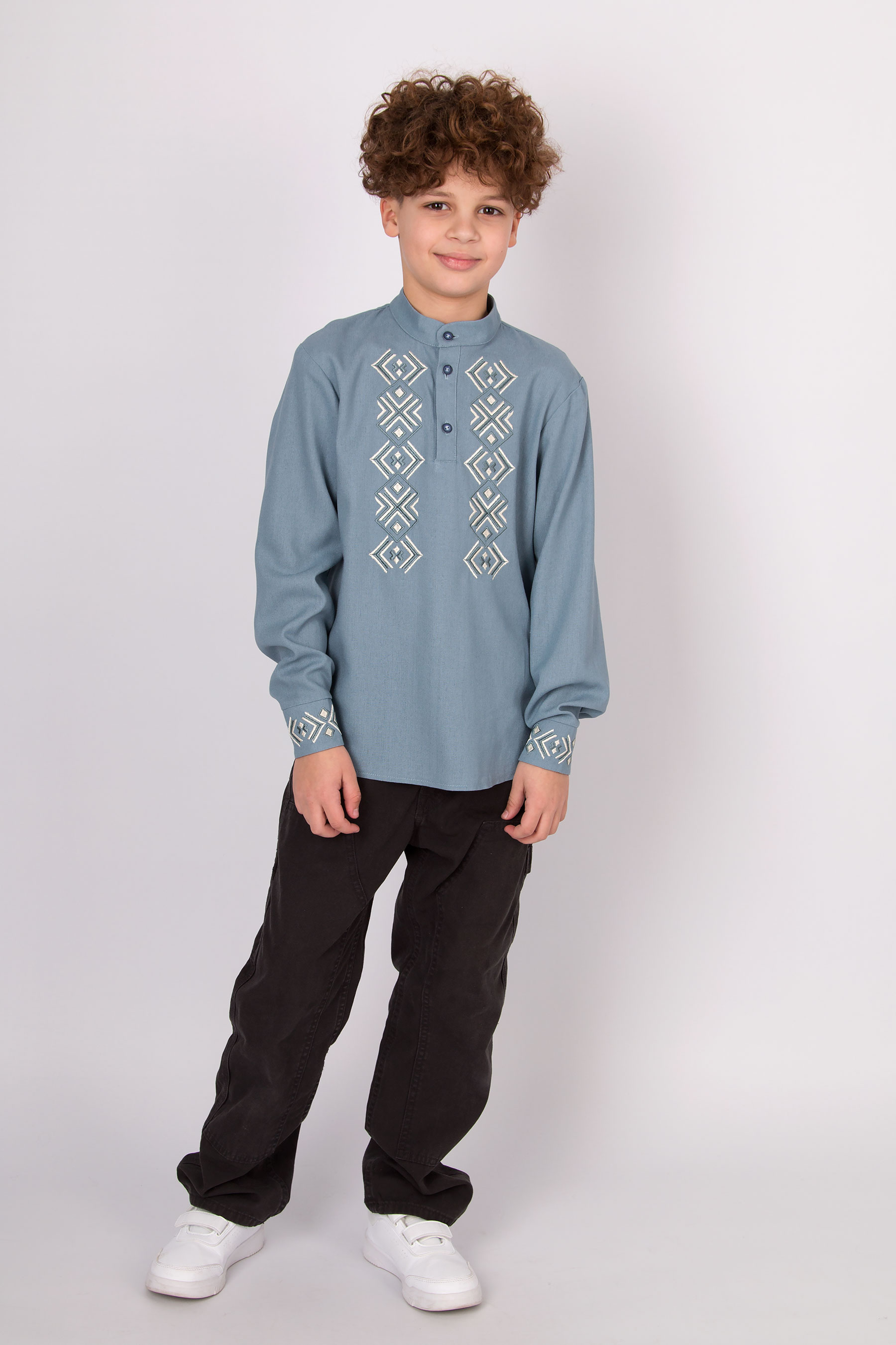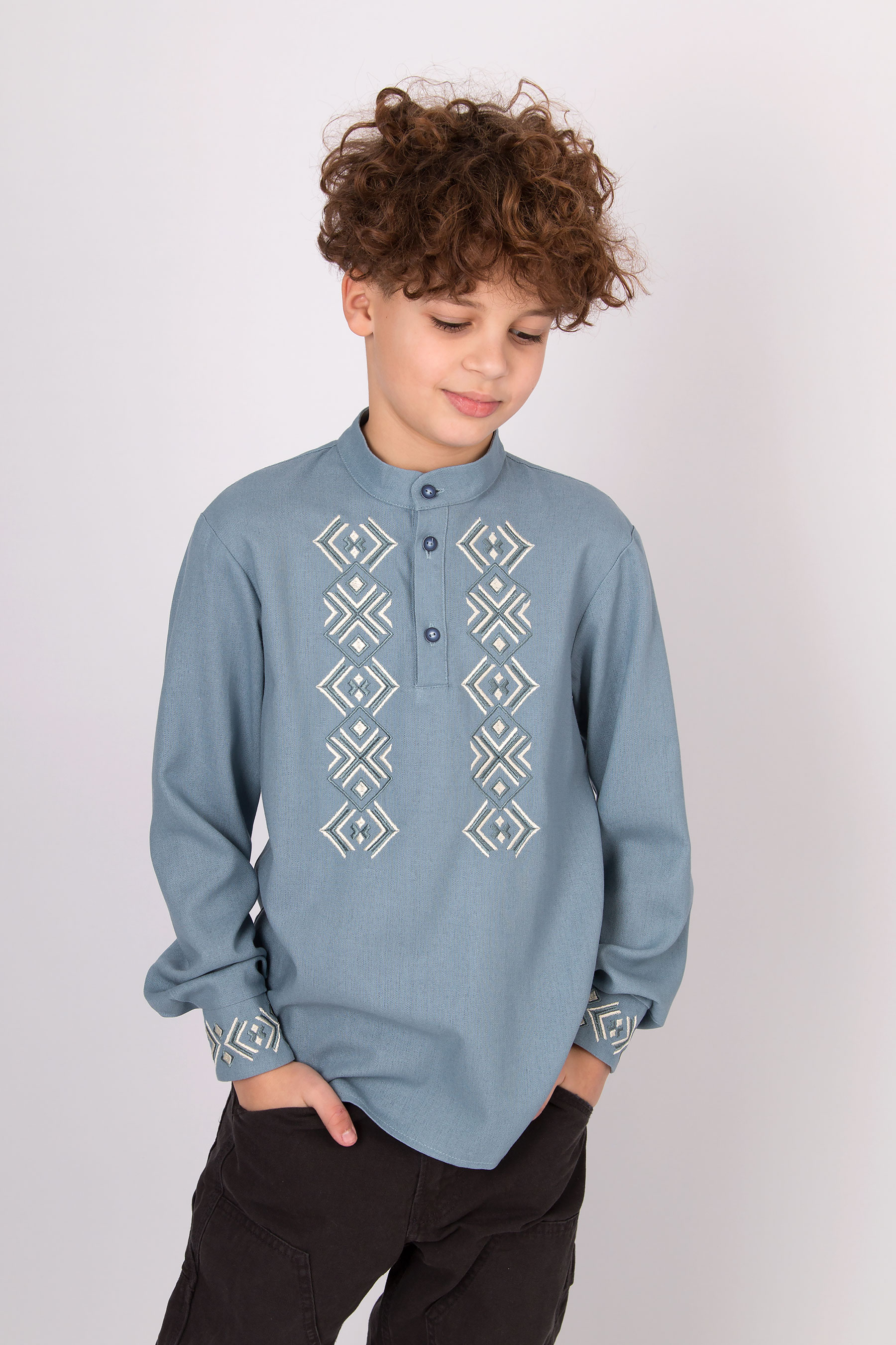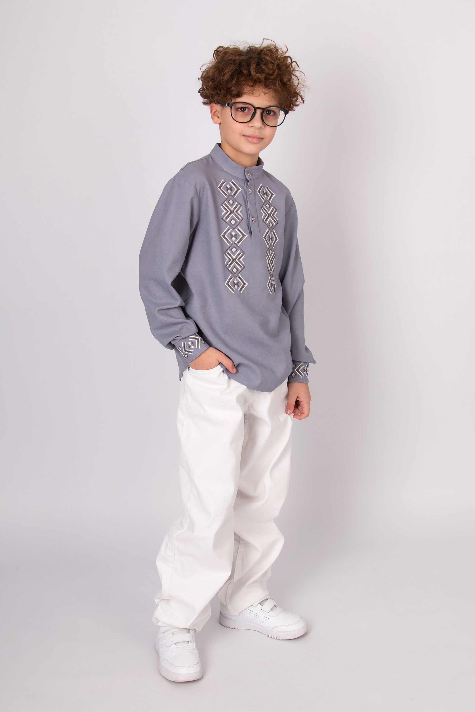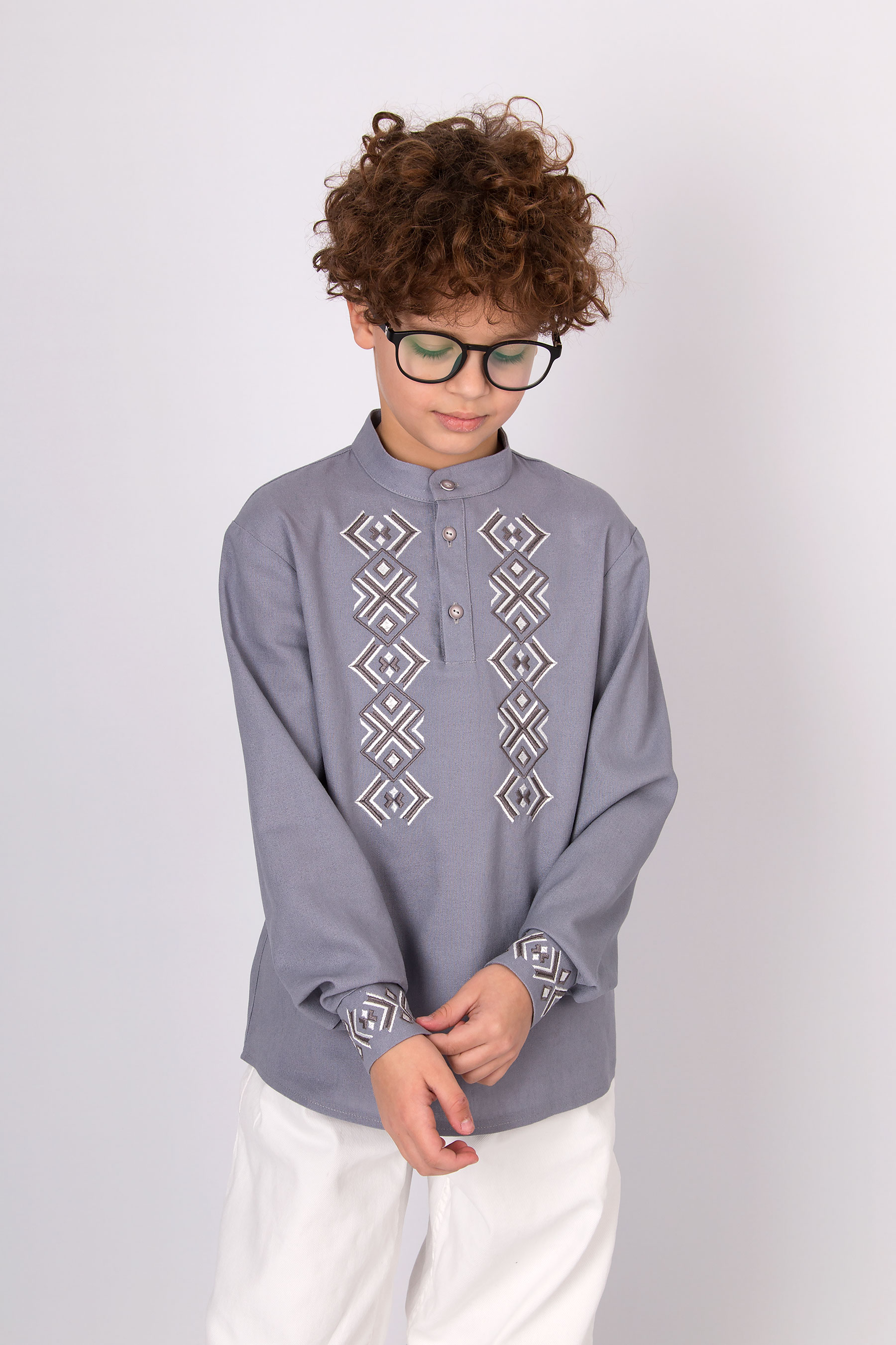 Вишиванка з льону з геометричною вишивкою. Має застібку на гудзики спереду й на манжетах. Поєднує сучасний крій і традиційні українські мотиви.