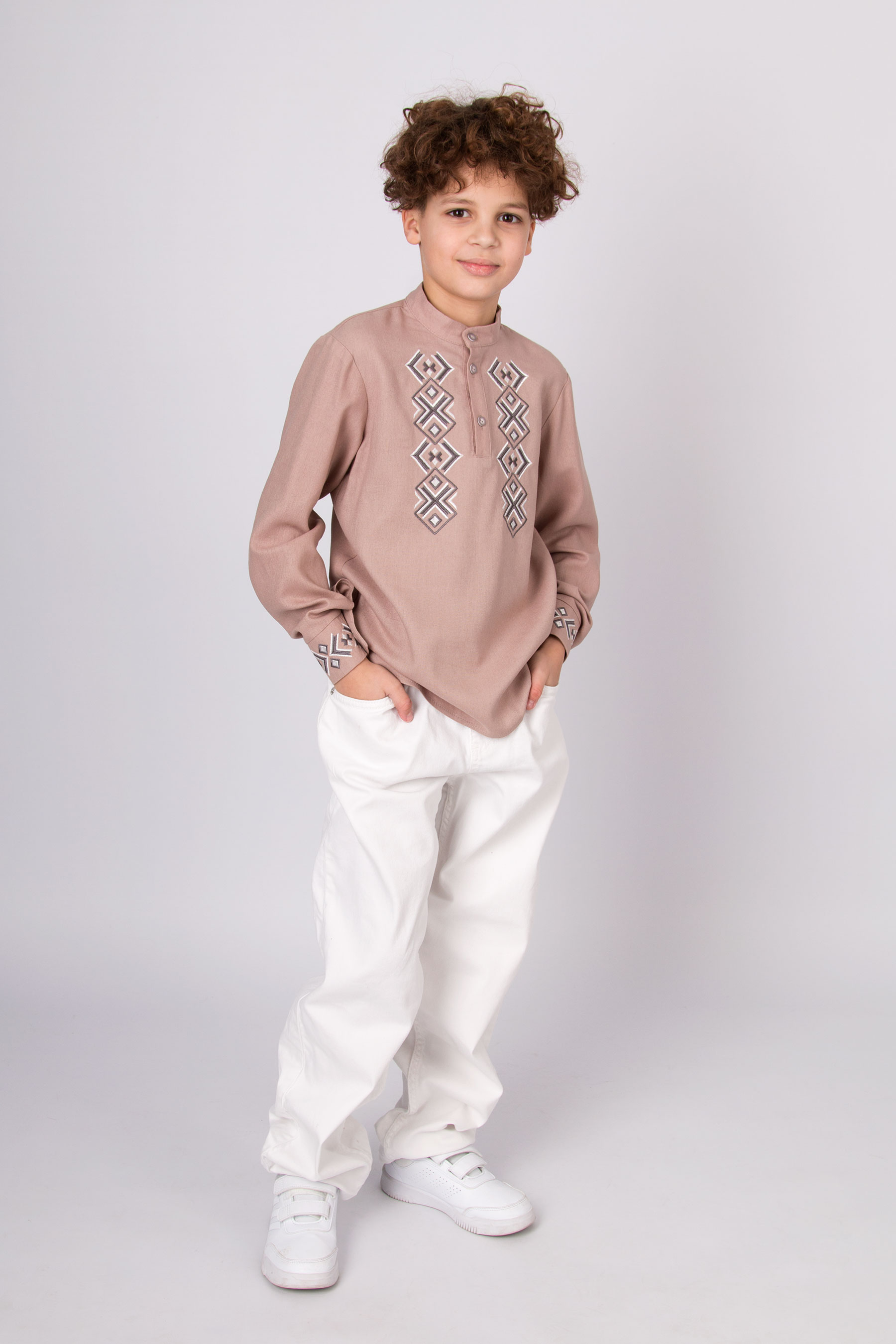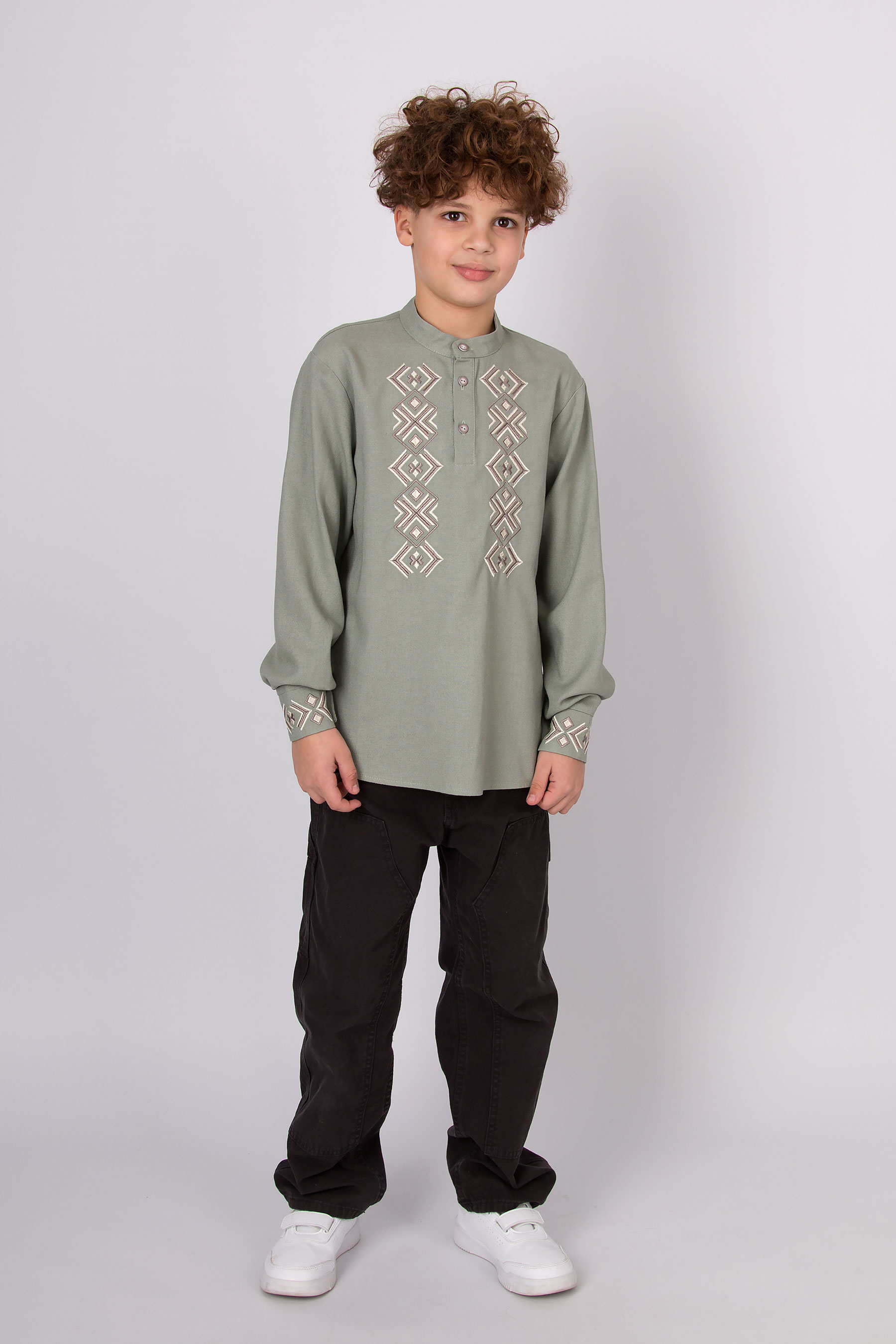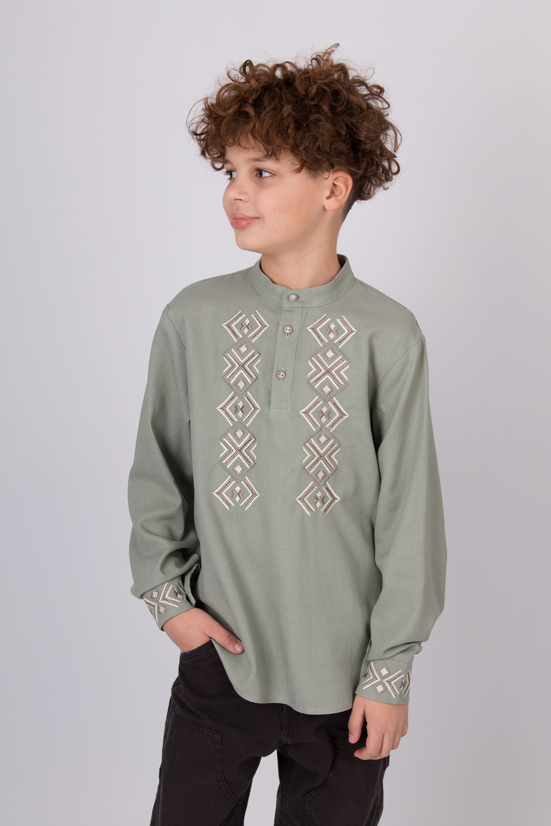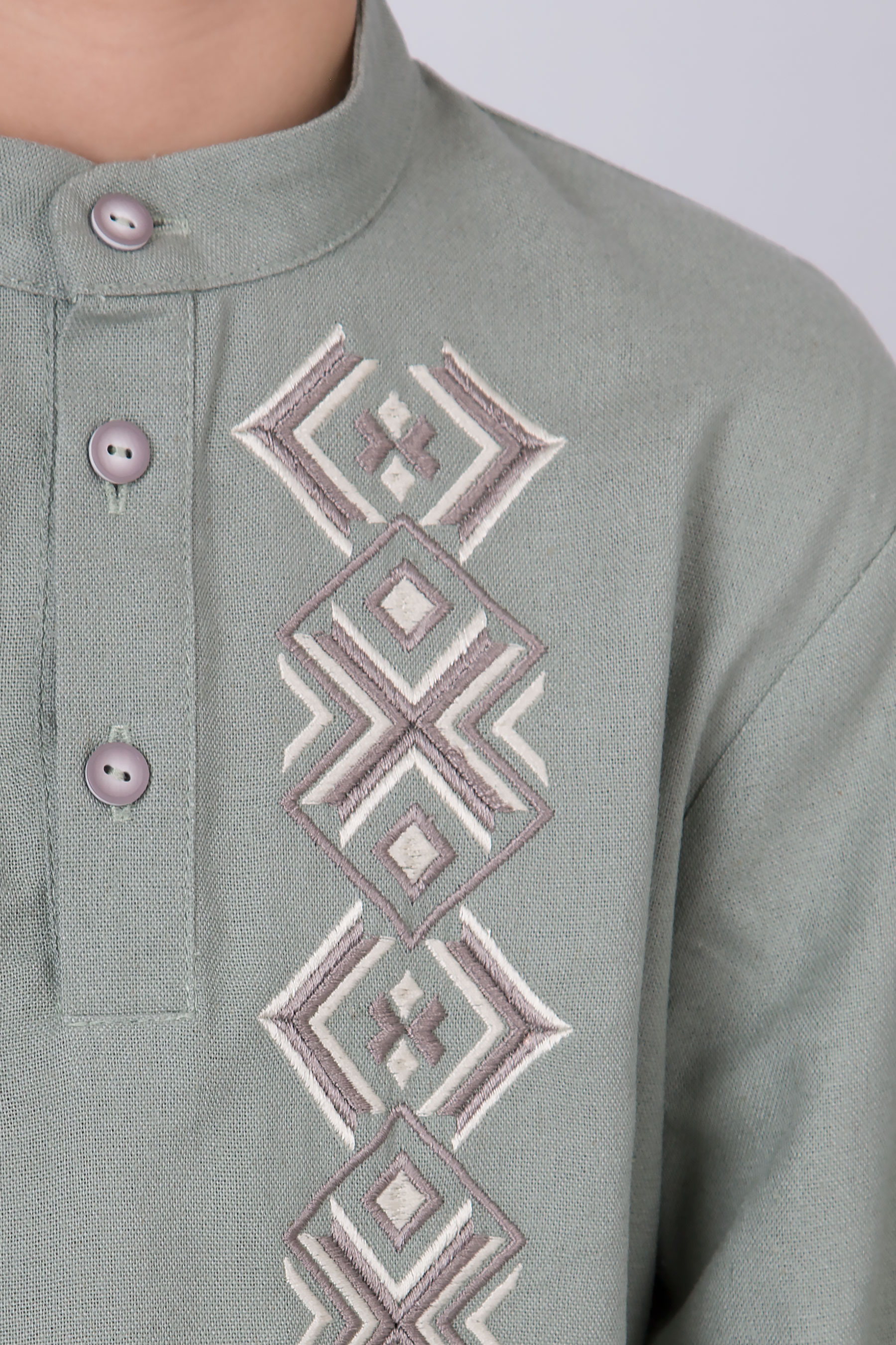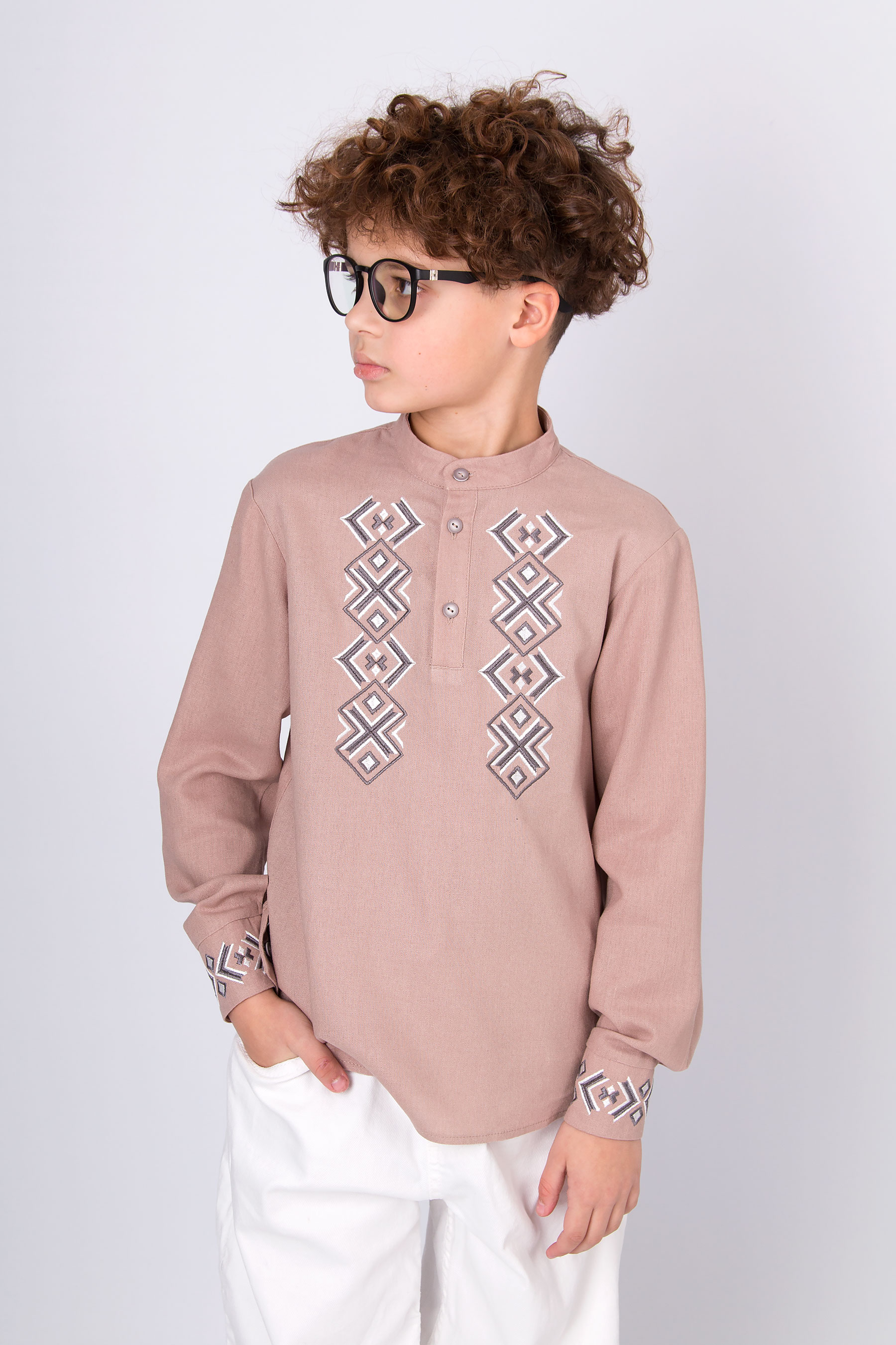 Вишиванка з льону з геометричною вишивкою. Має застібку на гудзики спереду й на манжетах. Поєднує сучасний крій і традиційні українські мотиви.
