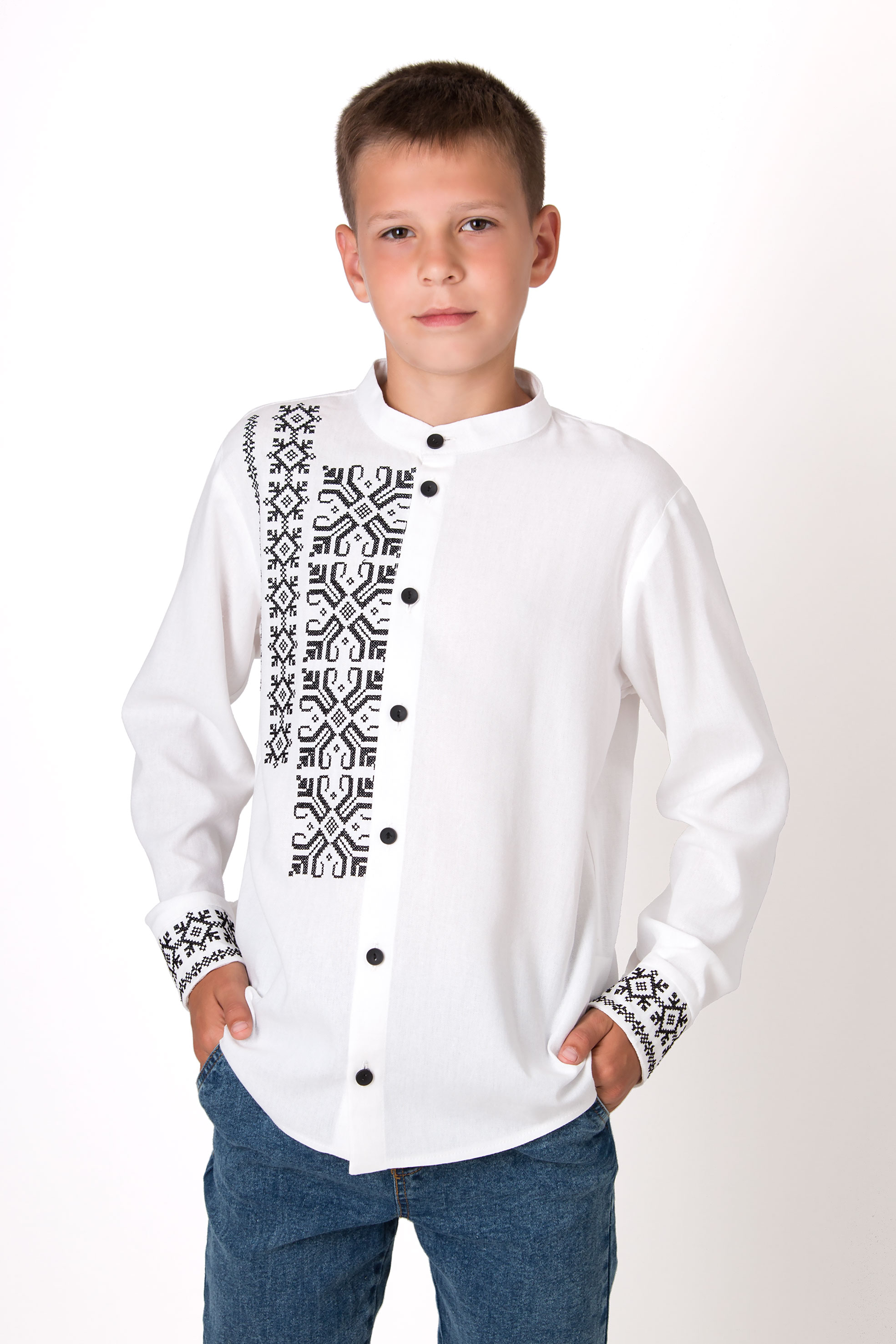 Вишиванка з льону з геометричним орнаментом, виконаним у традиційному стилі. Модель має застібку на ґудзики по всій довжині, включно з манжетами. Акуратний крій додає виробу охайності та стриманої елегантності. Такий дизайн поєднує українські традиції з сучасним стилем.