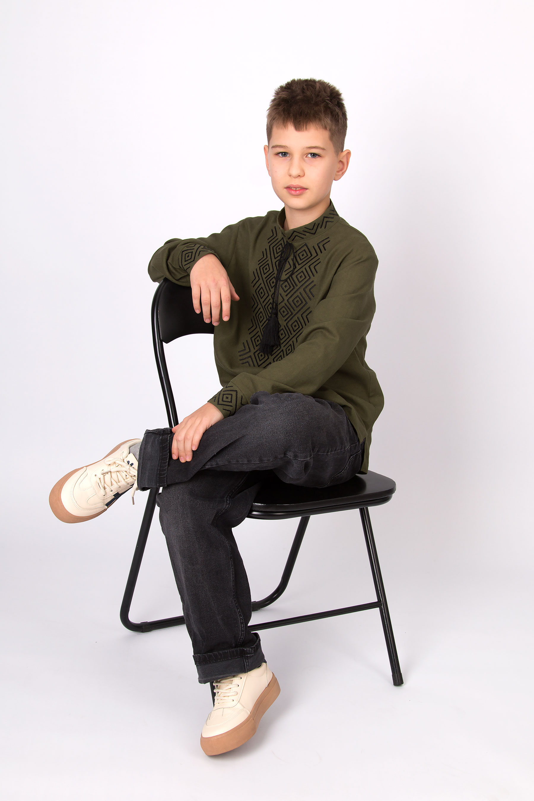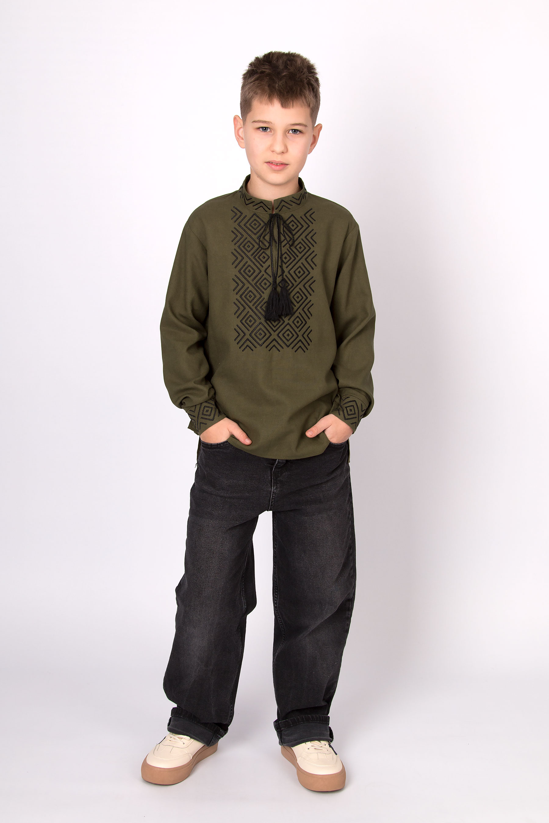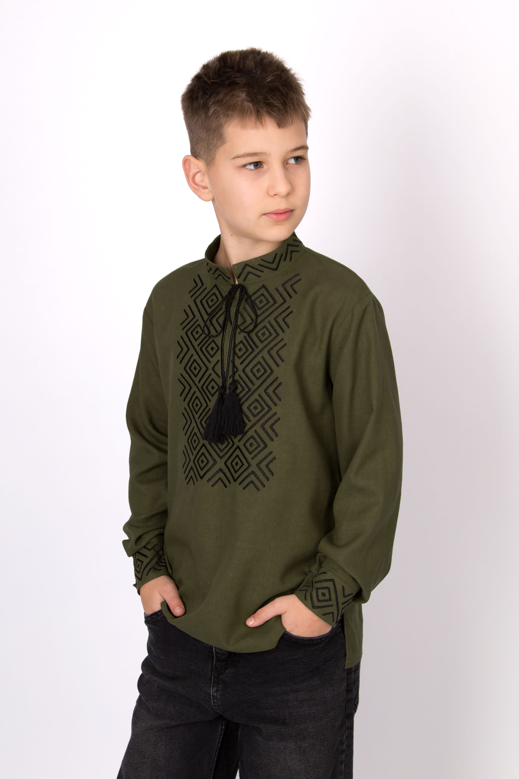 Вишиванка з льону, спереду оформлена геометричною вишивкою в тон тканини, яка створює стриманий і стильний акцент. Має розріз із зав’язками та невисоку стійку, які гарно підкреслюють традиційний силует.Ідеальний вибір для урочистих подій.